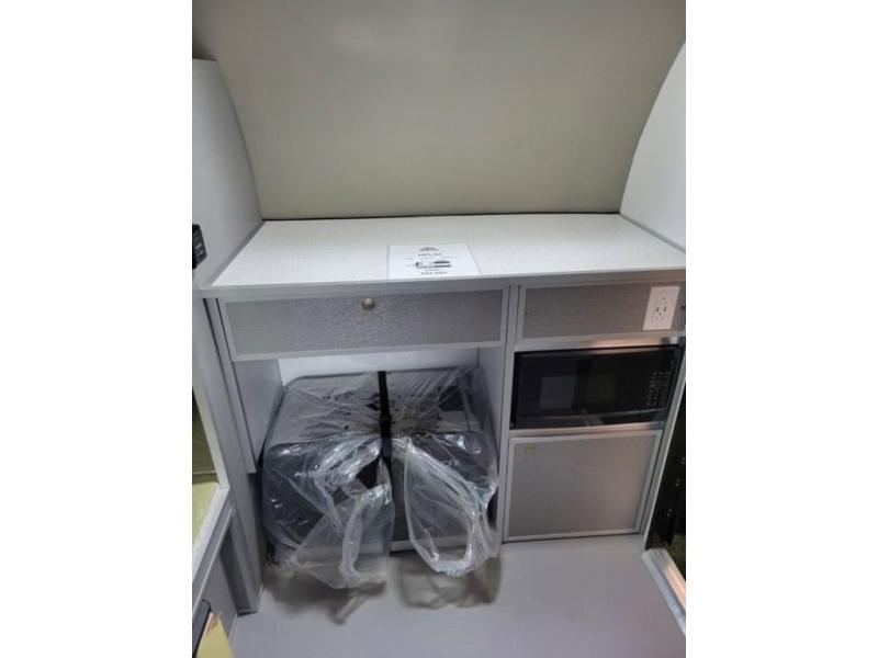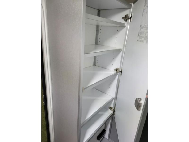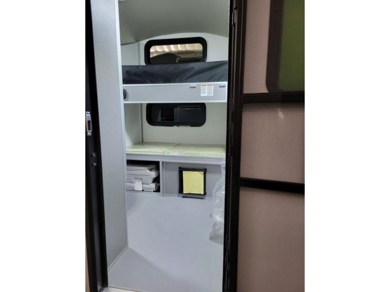 This trailer is perfect for a family of four looking for a unit with comfortable sleeping space with plenty of storage for your items. The dinette folds down to create a king-sized bed and there is a convenient electric cooler space underneath so you can bring along your cooler filled with everything you need for the weekend. Once you make sandwiches for lunch, you can enjoy them at the two tables that are good for a game of cards in the evening. This unit also includes a fan with automatic temperature control so you can stay cool and comfy!
