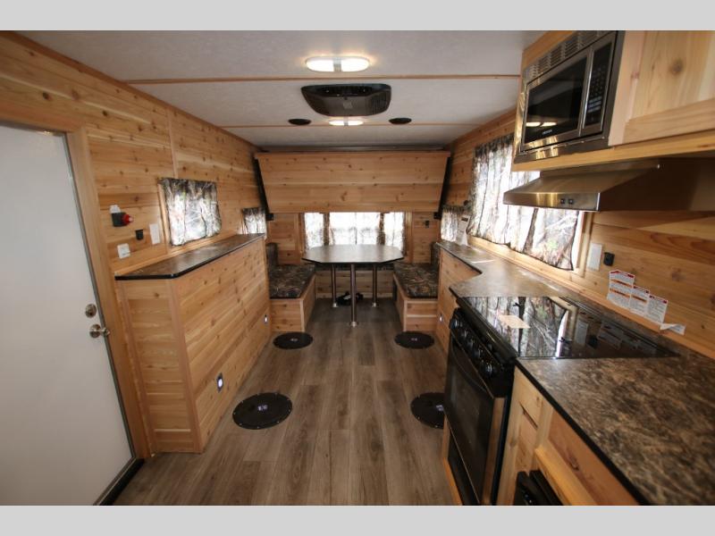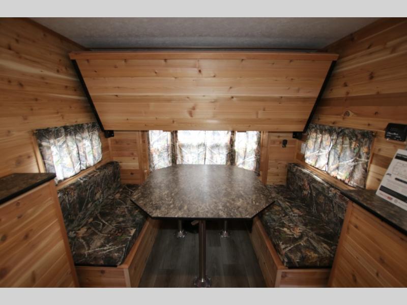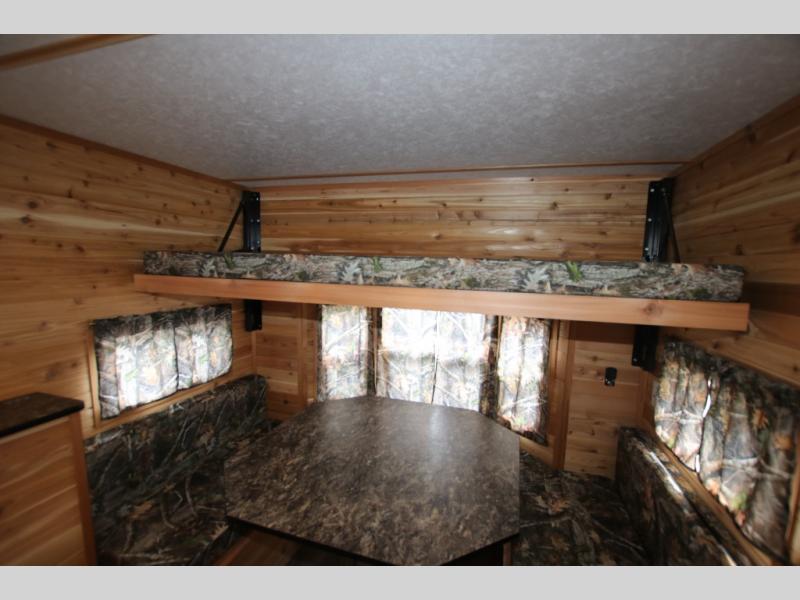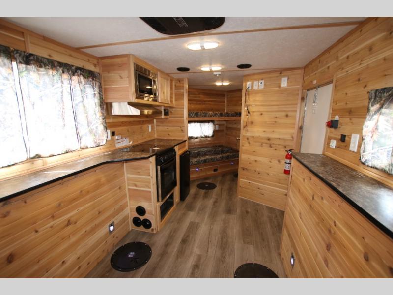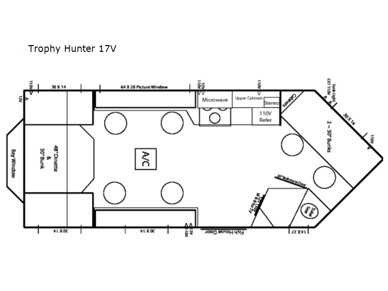 For the trophy hunter out there, let this Trophy Hunter 17V V-nose fish house be your home away from home while you hunt or fish. Along the front wall are two bunk beds, and in the back you will find a 48" dinette where you can enjoy your meals during the day and a good rest at night. Throughout this model there are six fishing holes with lights. The kitchen has a three-burner range, a sink, and a microwave for you to whip up your best meals. You will also find a handy on-board bathroom with a toilet seat!