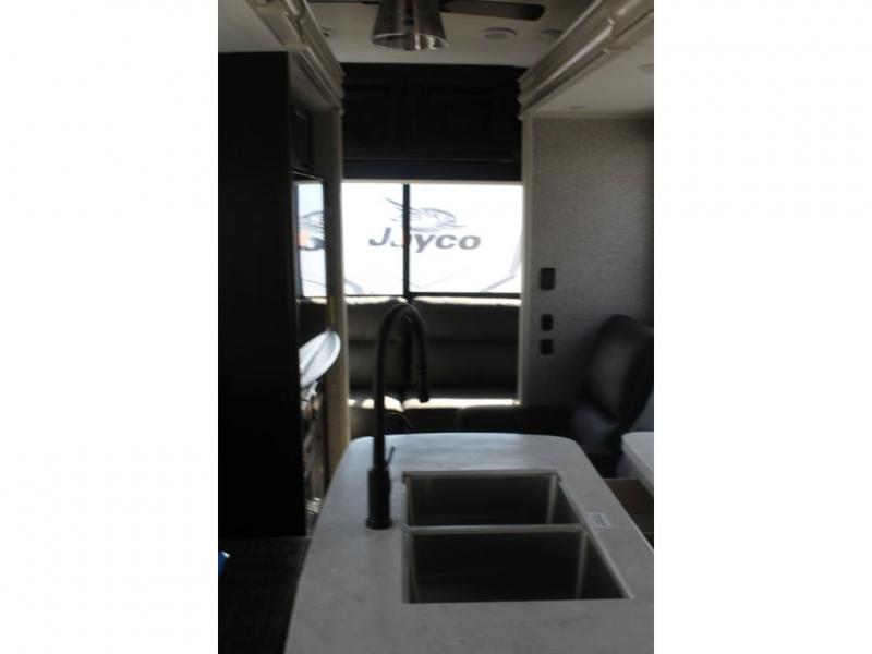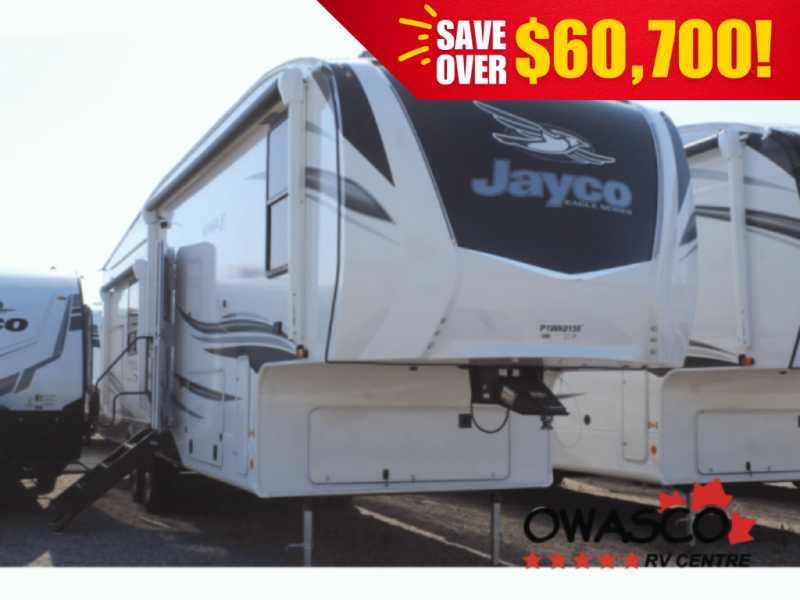 With any Eagle fifth wheel or travel trailer by Jayco you will appreciate durable construction materials, like the Magnum Truss Roof and the Stronghold VBL laminated walls. The JAYCOMMAND Smart RV system puts you in control of your RV's functions, and the 4 Star Handling Package will provide smooth towing from home to camp. Each model features Climate Shield zero-degree tested weather protection and the industry-exclusive HELIX cooling system that features two 15,000 BTU Whisper Quiet A/C's to keep you comfortable year around. Some of the exterior conveniences you are sure to love are the fully enclosed, LED-lit universal docking station, the pass-through storage with Slam-Latch baggage doors, and the painted fiberglass front cap with built-in specialty LED lighting. The Eagle fifth wheels and travel trailers are designed to make you feel at home with solid hardwood slide fascia, residential vinyl flooring, bathroom tile backsplash, and plenty of storage for all your belongings.