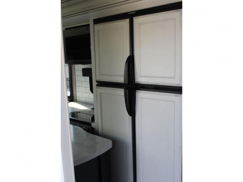 Trips to the lake are made luxurious in this spacious fifth wheel for four! The rear living area includes a tri-fold sofa, a ceiling fan to keep cool, plus theater seats across from the entertainment center and fireplace. You will love the walk-in pantry and 21 cu. ft. residential refrigerator to store food for the whole week, plus there is a convenient coat closet/pantry for even more storage. The full bath features a shower with a seat, a linen closet, plus a medicine cabinet to keep all your necessities organized. You will feel right at home in the front private bedroom with its queen bed slide out, a chest with a TV option, plus a walk-in closet with shelves and washer and dryer prep. You can't go wrong with this fifth wheel!
