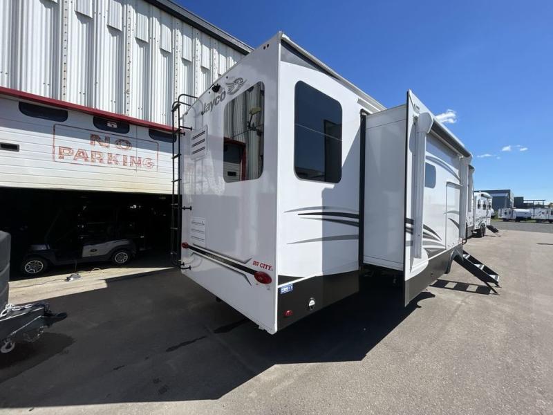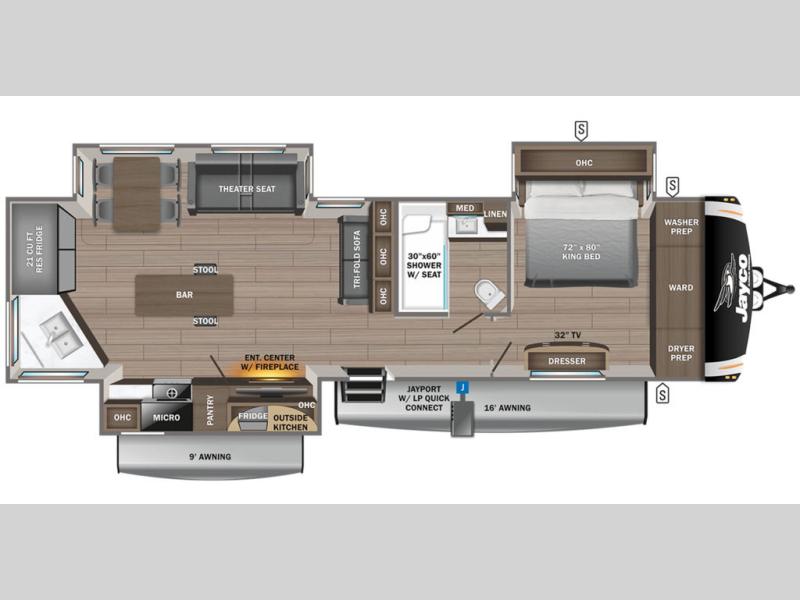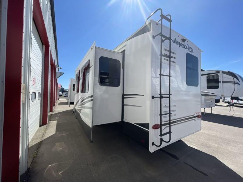 With any Eagle fifth wheel or travel trailer by Jayco you will appreciate durable construction materials, like the Magnum Truss Roof and the Stronghold VBL laminated walls. The JAYCOMMAND Smart RV system puts you in control of your RV's functions, and the 4 Star Handling Package will provide smooth towing from home to camp. Each model features Climate Shield zero-degree tested weather protection and the industry-exclusive HELIX cooling system that features two 15,000 BTU Whisper Quiet A/C's to keep you comfortable year around. Some of the exterior conveniences you are sure to love are the fully enclosed, LED-lit universal docking station, the pass-through storage with Slam-Latch baggage doors, and the painted fiberglass front cap with built-in specialty LED lighting. The Eagle fifth wheels and travel trailers are designed to make you feel at home with solid hardwood slide fascia, residential vinyl flooring, bathroom tile backsplash, and plenty of storage for all your belongings.