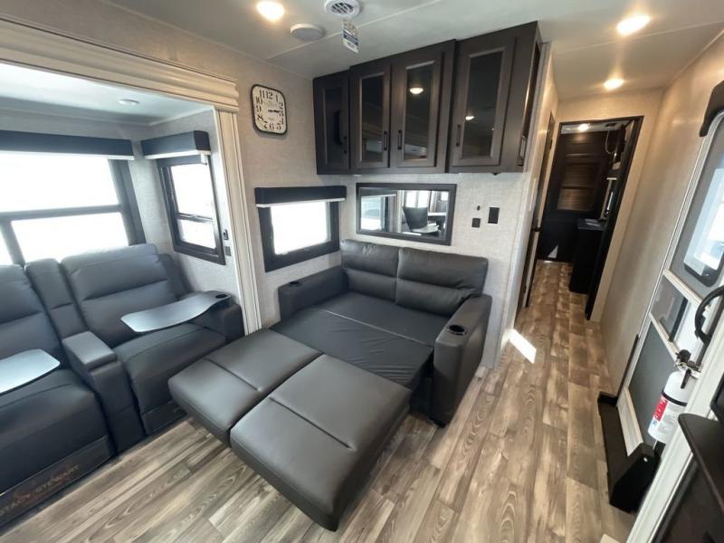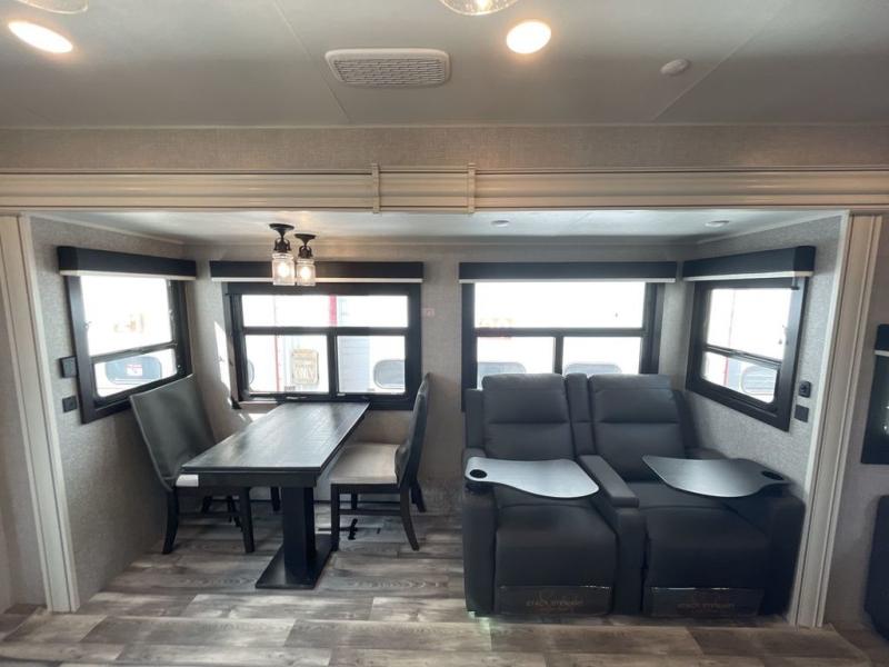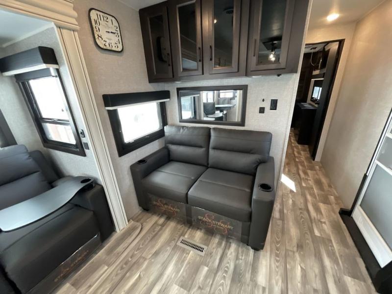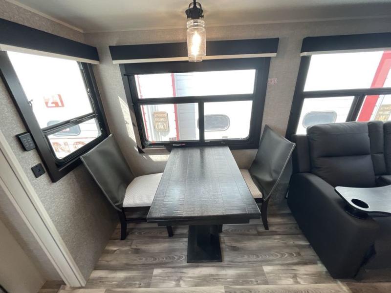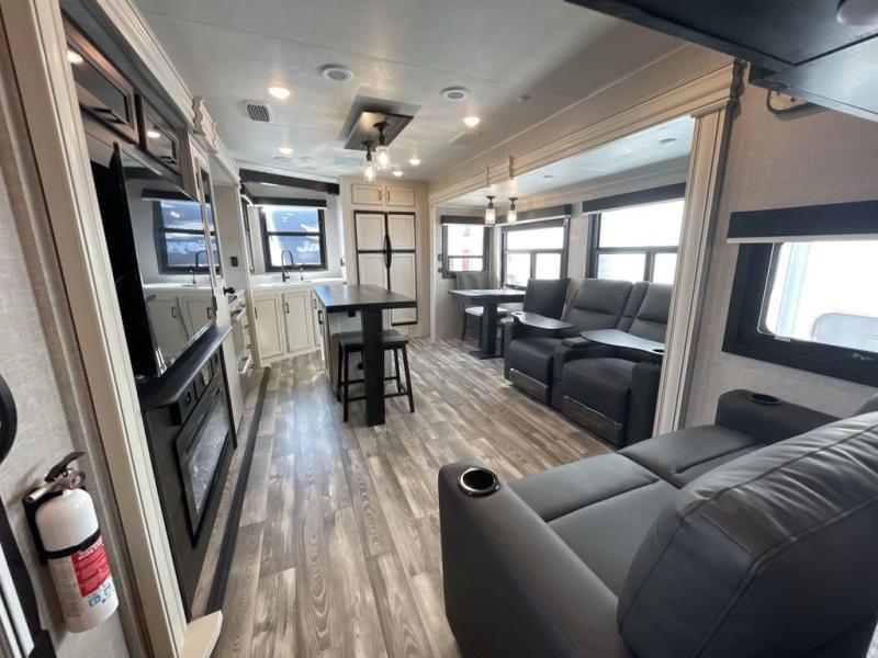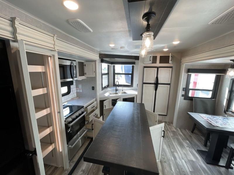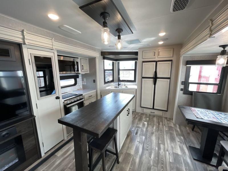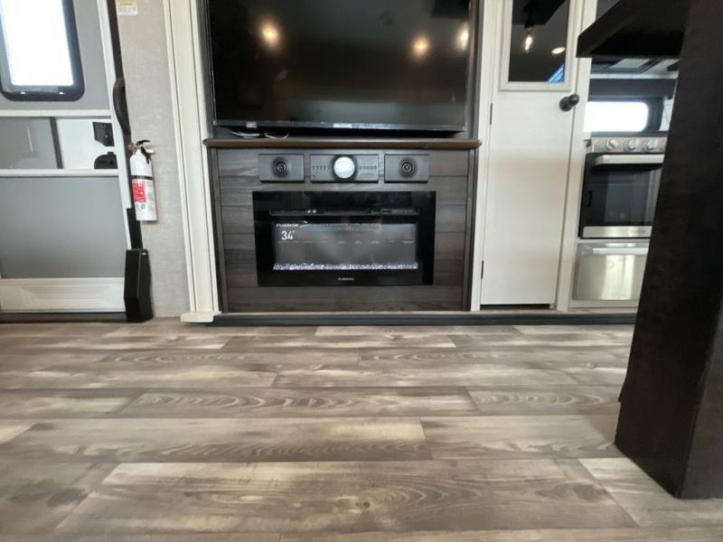 You can't go wrong with this travel trailer in tow. Enjoy evenings by the fireplace with a movie on the 4K Ultra HD Smart TV, or dine together at the free-standing table with chairs. The outside kitchen and two power awnings will create an outdoor living space you are sure to love, plus you'll find all the indoor appliances as well if the weather isn't cooperating. You can freshen up each day in the spacious full bath, and you'll always get a great night's rest on the king bed slide out. This model also includes plenty of storage space, including a bedroom wardrobe and a dresser, a kitchen pantry, plus an exterior pass-through for fishing poles!