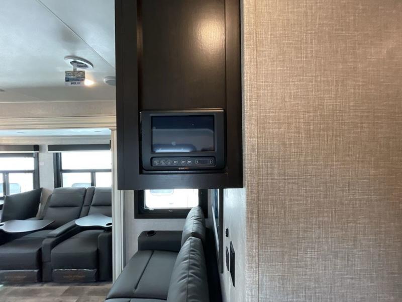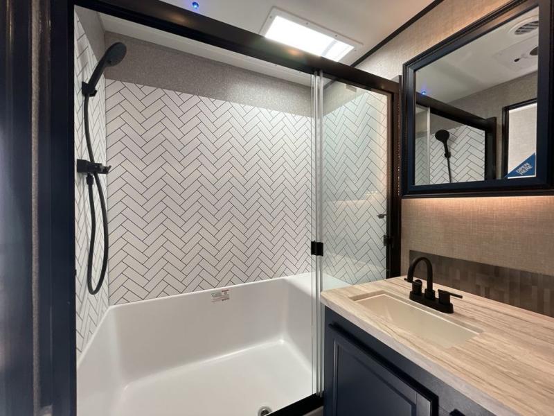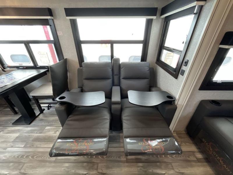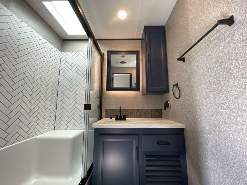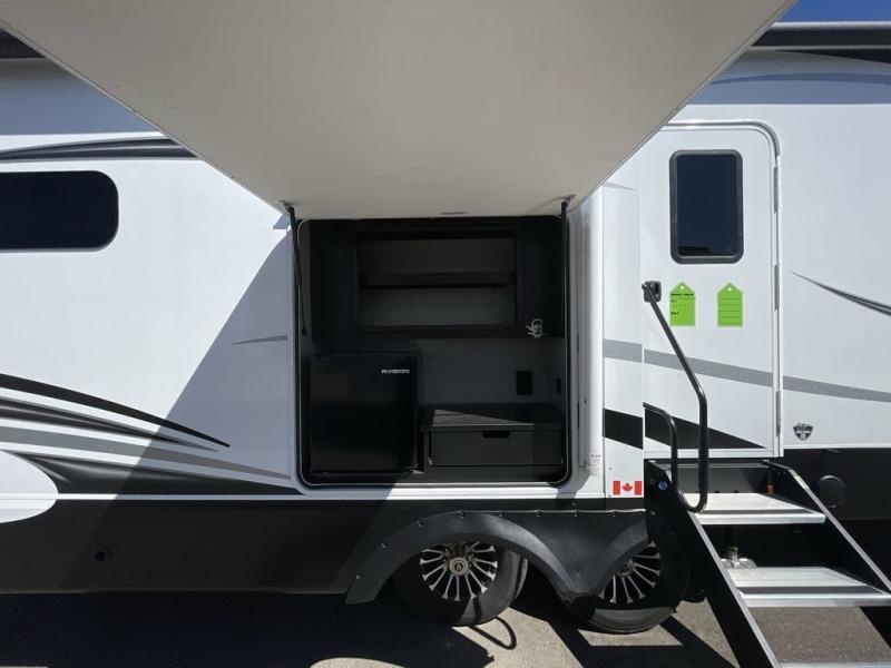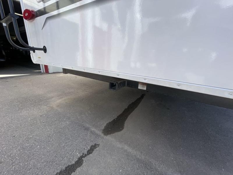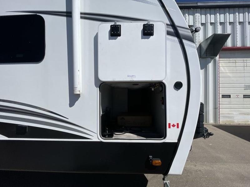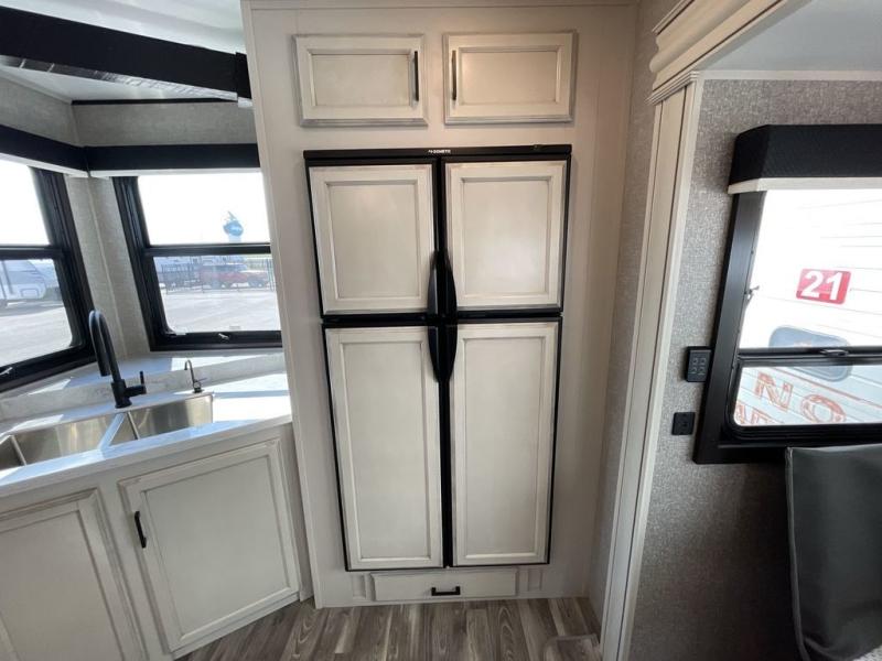 You can't go wrong with this travel trailer in tow. Enjoy evenings by the fireplace with a movie on the 4K Ultra HD Smart TV, or dine together at the free-standing table with chairs. The outside kitchen and two power awnings will create an outdoor living space you are sure to love, plus you'll find all the indoor appliances as well if the weather isn't cooperating. You can freshen up each day in the spacious full bath, and you'll always get a great night's rest on the king bed slide out. This model also includes plenty of storage space, including a bedroom wardrobe and a dresser, a kitchen pantry, plus an exterior pass-through for fishing poles!