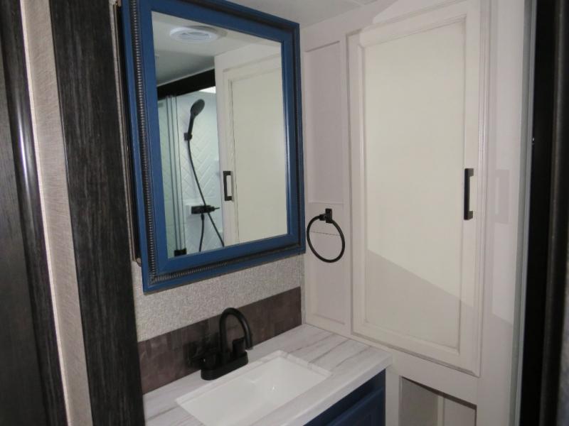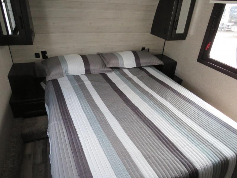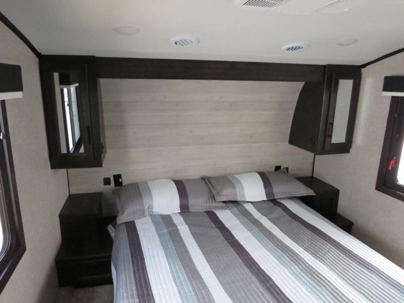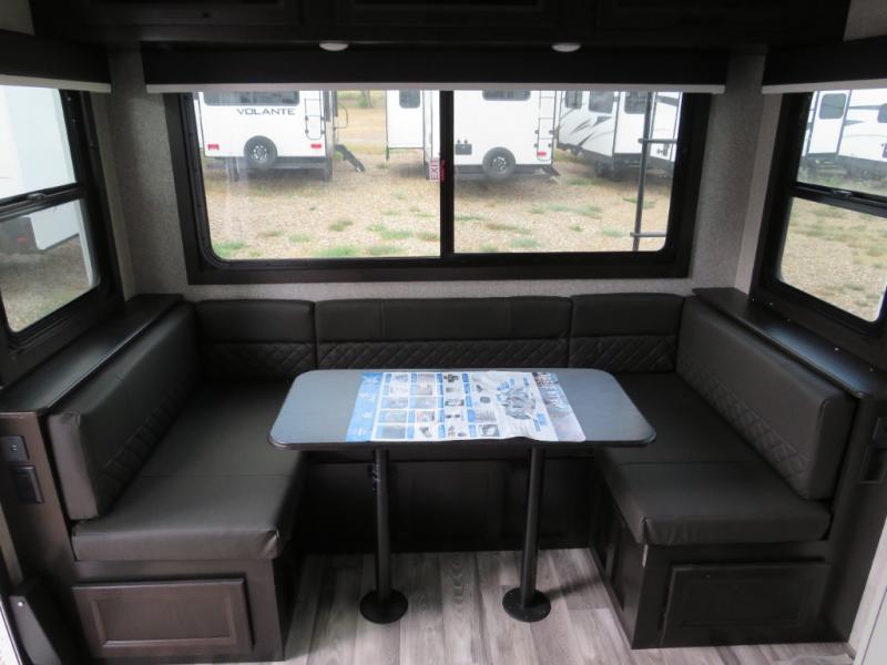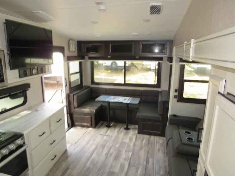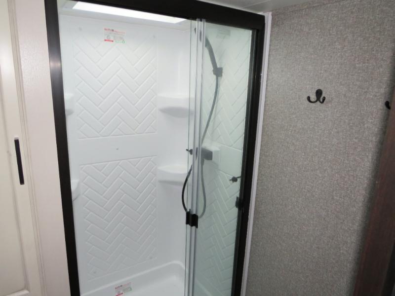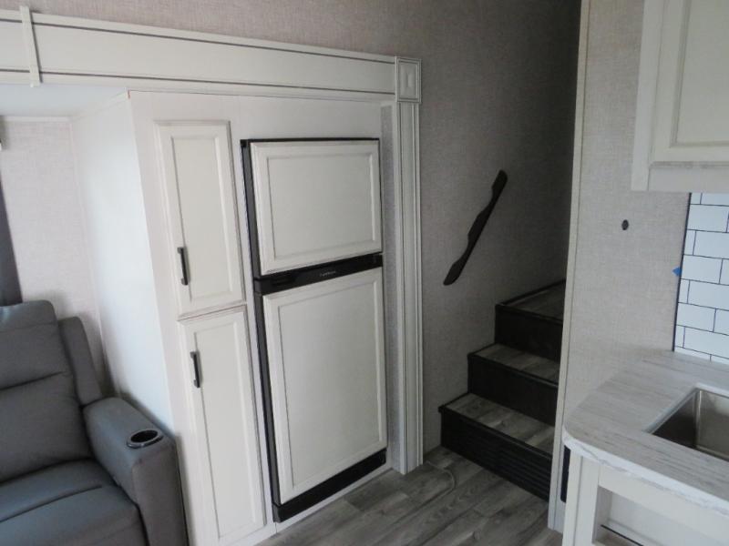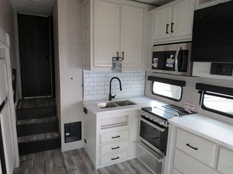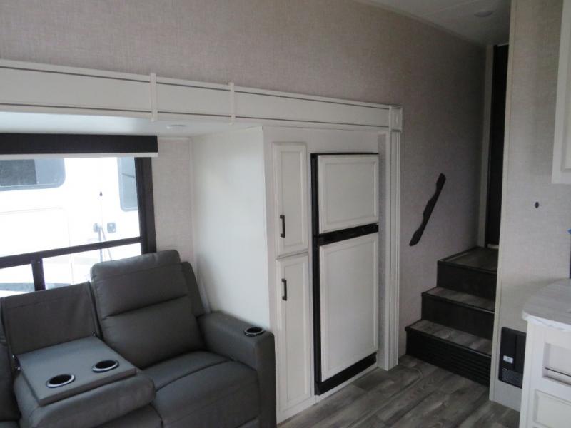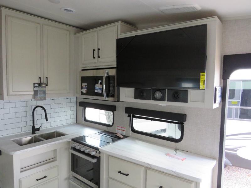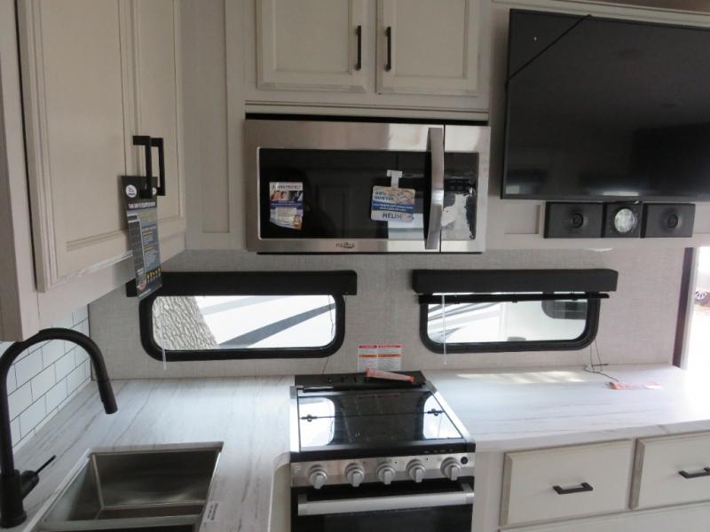 It will be so easy to enjoy camping trips in this spacious fifth wheel. There is a theater seat slide out across from the LED Smart HDTV, and the rear U-shaped dinette can be used to dine at, play games, and sleep additional guests. Prepare your meals with the stainless steel range or in the stainless steel 30" over-the-range microwave, and you can store food in the 12V refrigerator and pantry. You will feel more at home with a spacious bathroom that includes bathroom tile backsplash, a skylight, and a porcelain foot flush toilet. The front private bedroom includes a queen bed with gas-strutted under-bed storage, dual nightstands, and TV prep if you like to watch movies in bed.