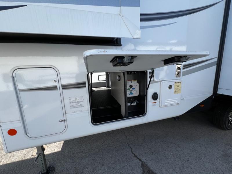 Once you step inside this fifth wheel, you won't want to camp any other way! It features a front private bedroom with a queen bed, a wardrobe slide with a dresser and linen closet, and an entrance into the dual entry bathroom which has a radius shower for you to freshen up in each morning. The rear living area has a tri-fold sofa for an extra sleeping space and theater seating across from the entertainment center with a fireplace for a cozy evening. You can prepare your best meals with the kitchen island and three burner stainless steel range then enjoy them at the free standing table and chairs. There is plenty of storage space throughout between the overhead cabinets, the coat closet/pantry, the two additional kitchen pantries, and the hutch for your dishes!