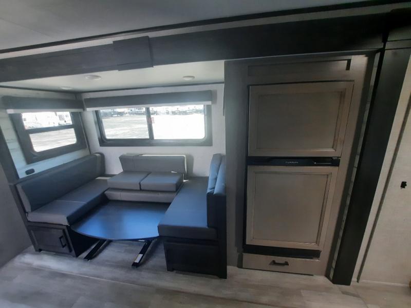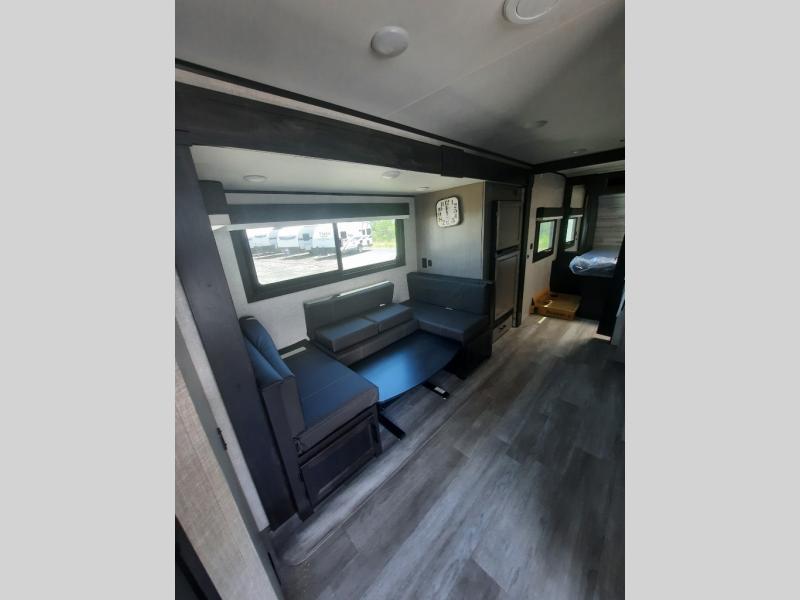 There is so much to love about this trailer from the double-size bunks in the rear with a ladder for easy access, plus the cargo door that allows you to stow larger items from the exterior to the interior underneath the bunks. You also have exterior storage compartments for outdoor gear. And the cook can choose to make meals using the outside kitchen including a fridge to store some cold items or the inside kitchen with full amenities including a 6 cu. ft. refrigerator and a flip-up counter for more space to prepare meals and dry the dishes. The walk-in pantry is a nice feature as well especially when you have a big crew. There is a private bedroom up front with the second exterior entry and a queen bed, plus the main area offers a U-shaped dinette and LED TV to watch. And you might like to add a few options such as an L-lounge or theater seats in place of the dinette, 12V heated tank pads if you plan to camp often in the cold weather, and/or the Solar Power package if you like staying off-grid.