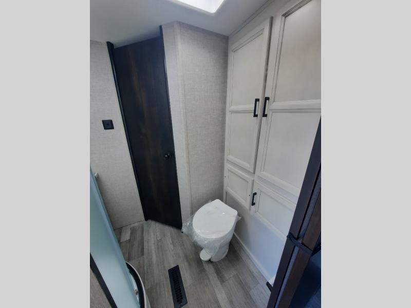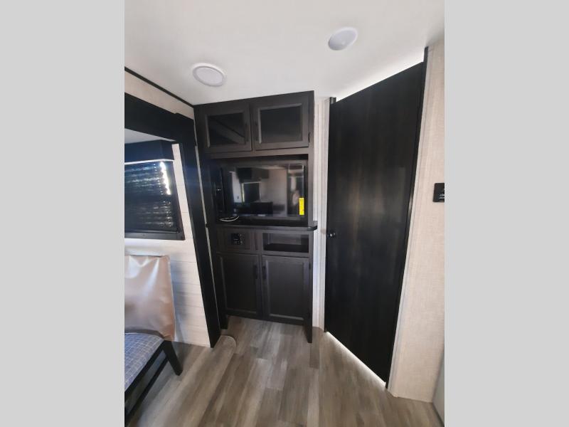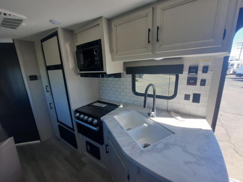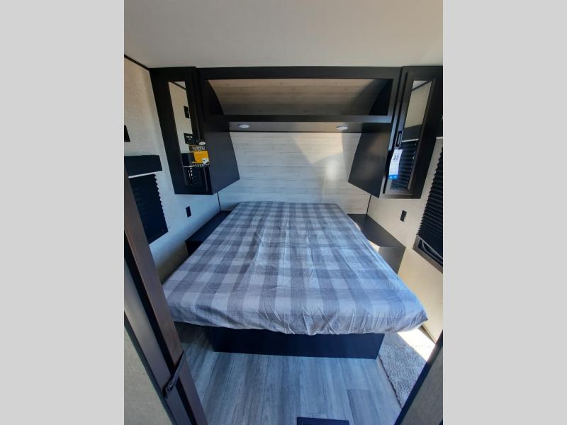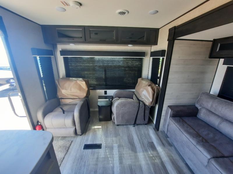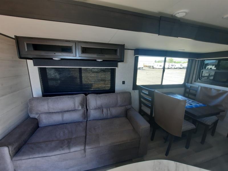 When you want to travel and see new places, this trailer gives you the flexibility to sleep two to four, plus offers a full walk-through bathroom with access from the main area and the front private bedroom. You will also appreciate having a second entry/exit door in the bedroom, a walk-around queen bed, plus dual wardrobes giving you your own side of the bed. The bathroom also has a radius shower and linen storage. The kitchen includes full amenities to make your own meals, and a pantry to keep your dry goods and snacks. You will love the rear swivel rockers with table in between to place your drinks, and the jack-knife sofa plus booth dinette offer more seating, sleeping space, and extra floor space since they are within a slide.