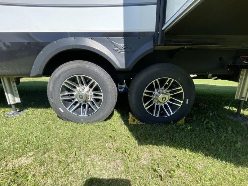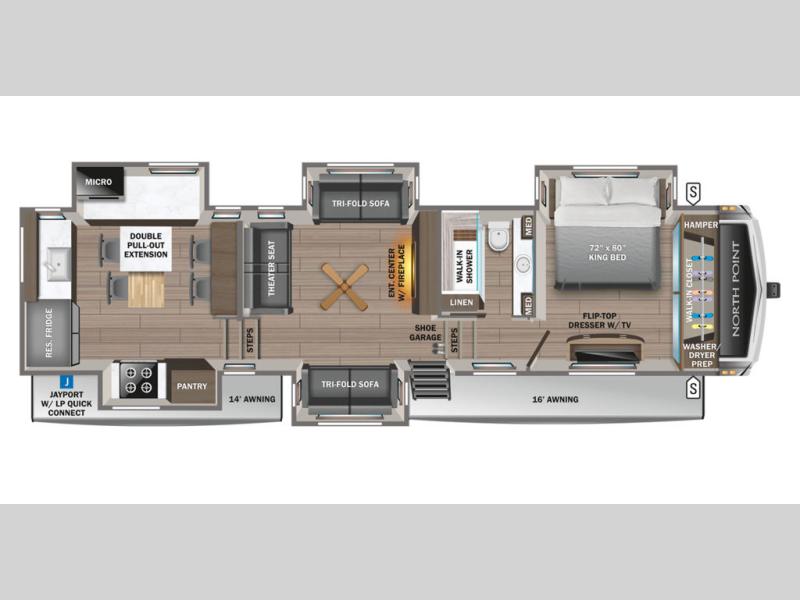 With any North Point fifth wheel by Jayco you begin with a strong foundation with a custom frame, designed and sized specifically to best support each unit. Constructed with Stronghold VBL™ aluminum framed, vacuum bond laminated walls and the Magnum Truss™ XL6™ roof system with a one-piece, seamless DiFlex II material which is the strongest tested roof in the industry. The 5-Star Handling package is included with Uniroyal tires, a MORryde rubber pin box, Dexter axles with Nev-R-Adjust brakes, MORryde CRE-3000 rubberized suspension and wet bolt fasteners and bronze bushings. The interior has handcrafted hardwood glazed doors and drawers, vinyl flooring throughout, a vessel bowl sink with high rise faucet in the main bathroom, plus so much more you just have to see one to believe it all!