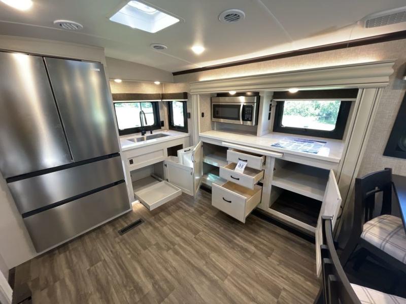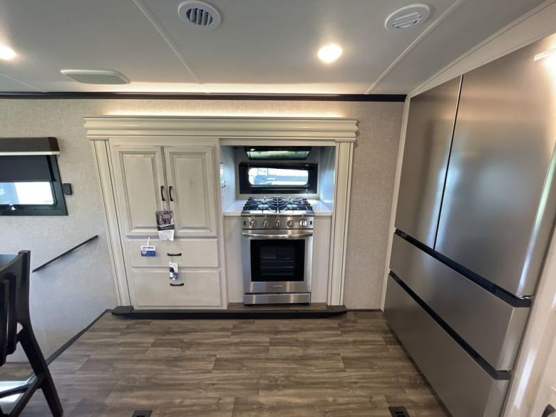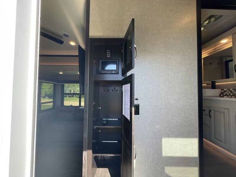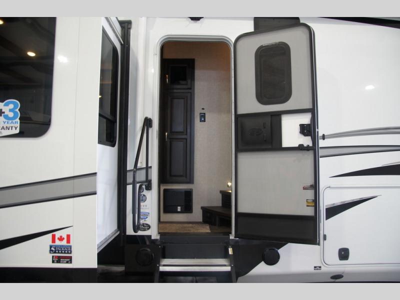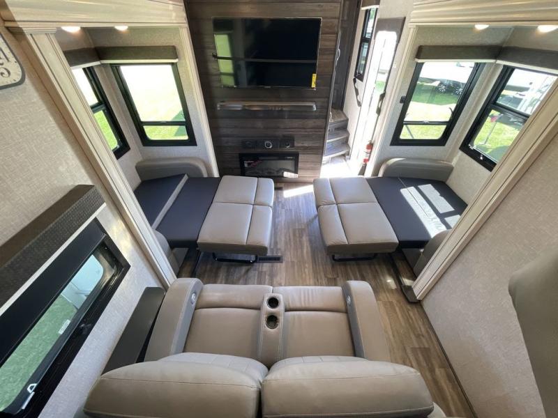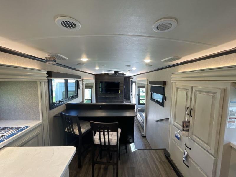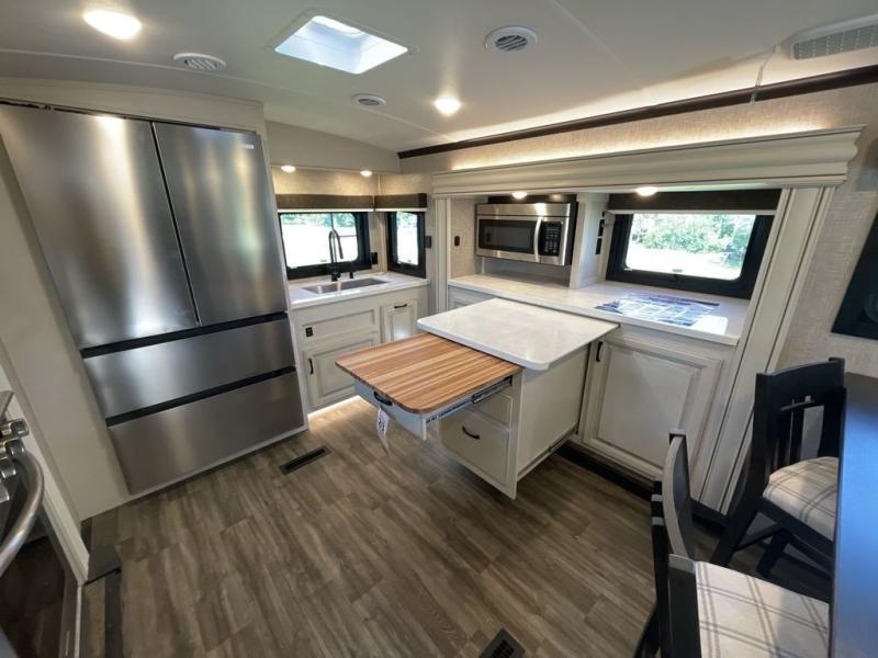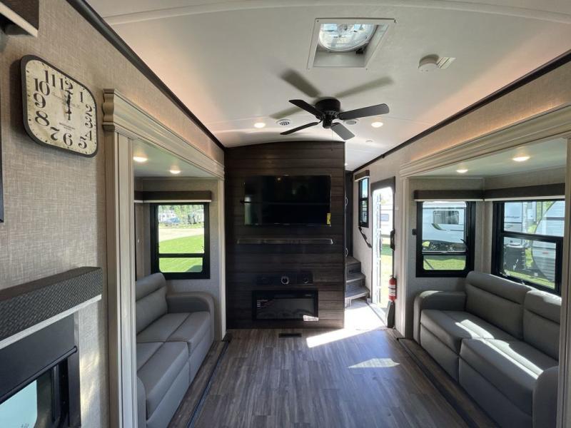 Convenience, comfort and style are found throughout this fifth wheel and a cook might call this a dream kitchen with the elevated area in the rear that includes two slide outs for maximum space, residential appliances including a 21 cu. ft. refrigerator, a double pull-out extension with two chairs and a breakfast bar top with two chairs allowing you to look into the middle living area. Here you will find two tri-fold sofa slides and theater seats, a ceiling fan to keep the air flowing, and a 50" Smart LED HDTV with fully digital HDMI output and home entertainment system with subwoofer. The fireplace makes the room cozy, the shoe storage under the interior steps is convenient, and the entry is a few steps away for you to be able to go outside to relax under the two awnings. When you are ready to retire for the evening, get cleaned up in the full bathroom and fall quickly to sleep on your own king bed slide after grabbing your pajamas from the flip-up dresser or the walk-in closet which also includes a hamper and a washer/dryer prepped space to add that option.