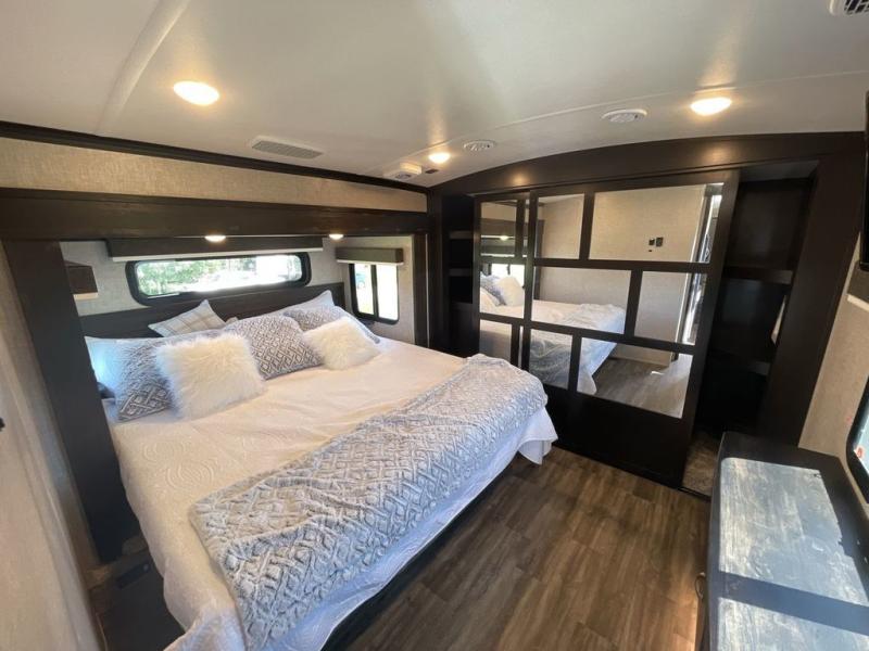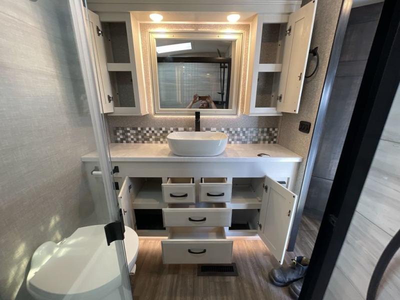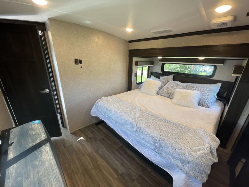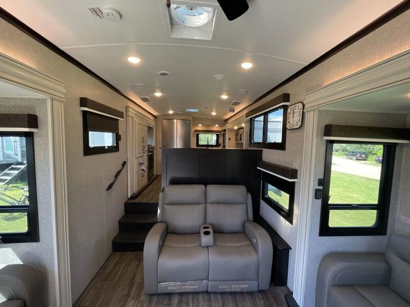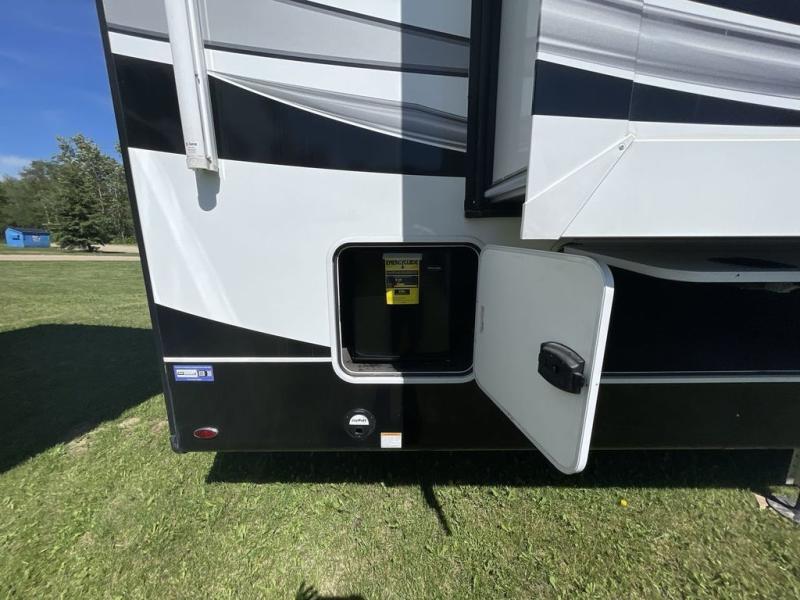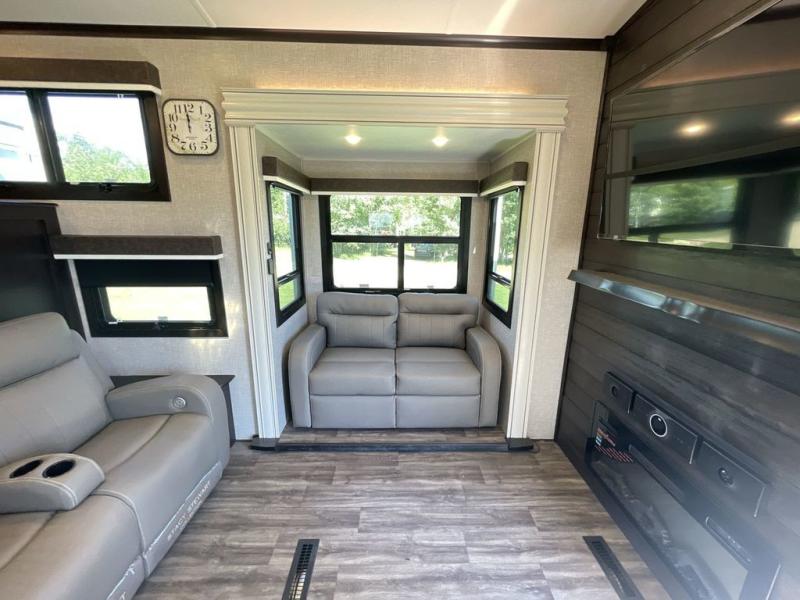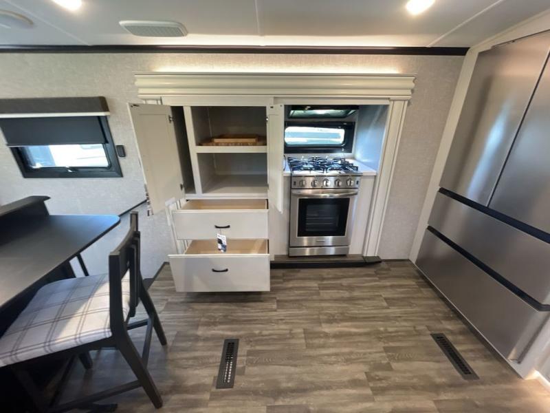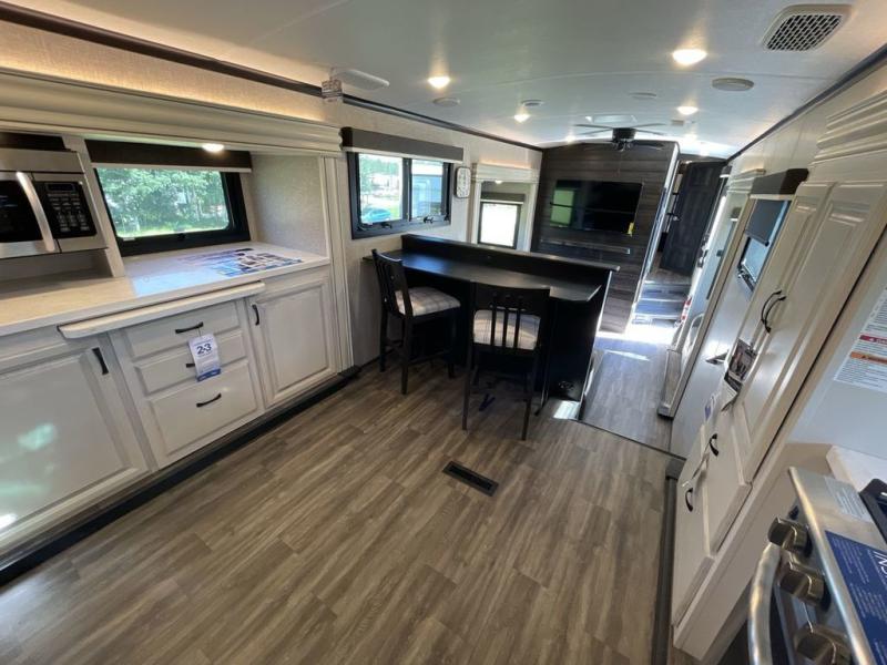 Convenience, comfort and style are found throughout this fifth wheel and a cook might call this a dream kitchen with the elevated area in the rear that includes two slide outs for maximum space, residential appliances including a 21 cu. ft. refrigerator, a double pull-out extension with two chairs and a breakfast bar top with two chairs allowing you to look into the middle living area. Here you will find two tri-fold sofa slides and theater seats, a ceiling fan to keep the air flowing, and a 50" Smart LED HDTV with fully digital HDMI output and home entertainment system with subwoofer. The fireplace makes the room cozy, the shoe storage under the interior steps is convenient, and the entry is a few steps away for you to be able to go outside to relax under the two awnings. When you are ready to retire for the evening, get cleaned up in the full bathroom and fall quickly to sleep on your own king bed slide after grabbing your pajamas from the flip-up dresser or the walk-in closet which also includes a hamper and a washer/dryer prepped space to add that option.