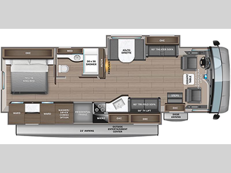The Jayco Precept Class A gas motorhome comes with some features that you'll only find on a Jayco product, like the JRIDE PLUS which offers you a powerful blend of precise handling and renowned stability on the road and the JAYCOMMAND system powered by Firefly which allows you to control your coach's operations from just about anywhere with your phone. You'll find two-point lap seatbelts in all designated seating locations, and the one-piece, seamless fiberglass front and rear caps resist wear and tear over the years. The Precept also offers you the lightest yet strongest construction in the industry with the Stronghold VBL lamination on the roof, floor, and sidewalls. You'll also be very pleased to find a 120" panoramic windshield (the largest in the industry), automatic hydraulic leveling jacks, an Onan® Marquis Gold Genset 5,500W gas generator with auto-gen start, and a Girard® tankless LP water heater.