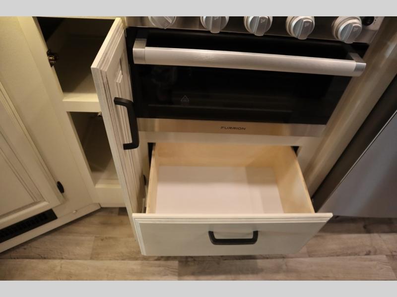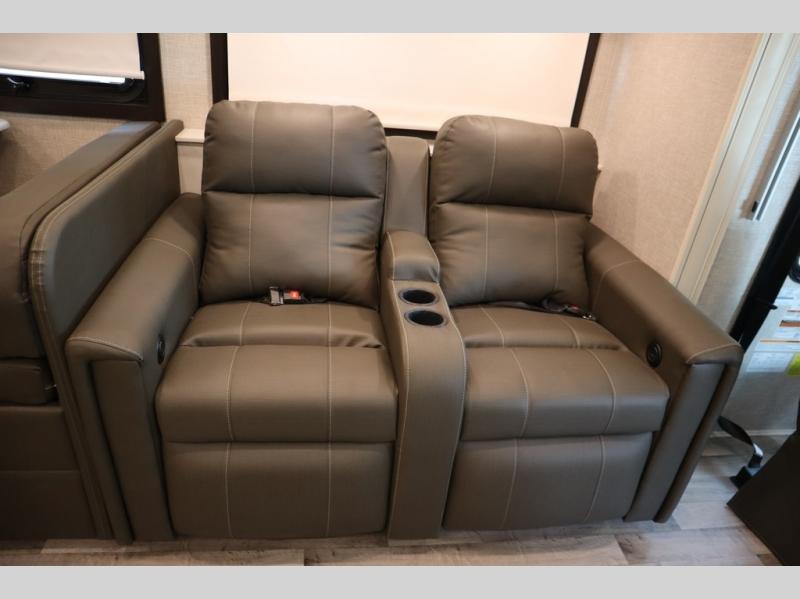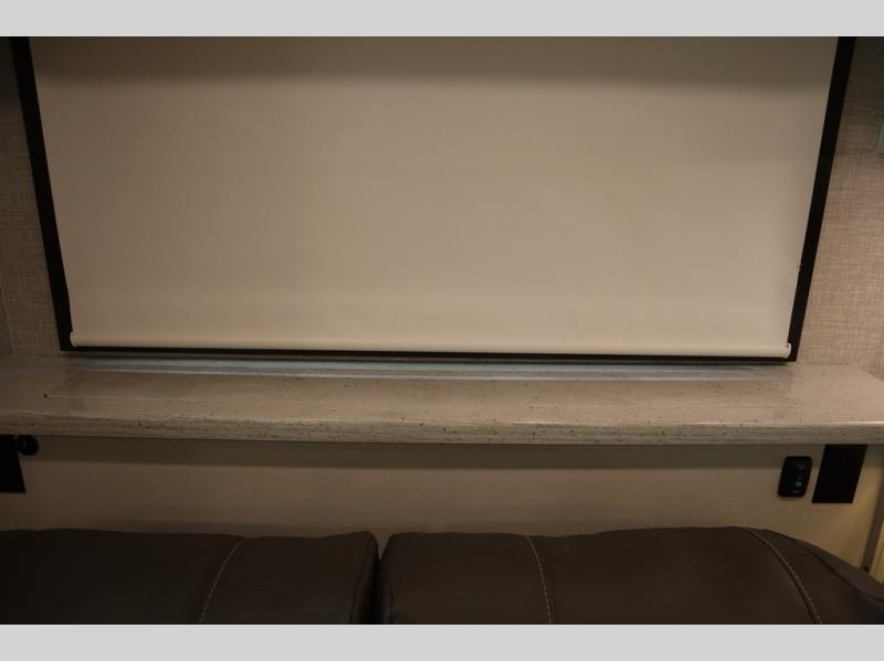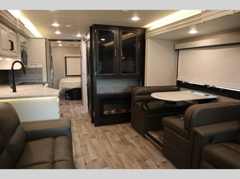 With its full-wall slide and additional slide in the living area, this Precept Class A gas motorhome is full of space! You'll have room to do the things you love, like cooking breakfast on the Furrion all-in-one cooktop and oven, relaxing on the theater sofa, cleaning up in the full bathroom, and playing card games at the booth dinette. You also won't be at a loss for entertainment because this coach offers you three TVs, and you'll even have an extra spot to relax once you turn the swivel cab seats around. In between the cab seats is a removable cockpit table that will allow you to set your glass of wine or cup of coffee down to talk, and you can add some more sleeping space to this coach by choosing the optional drop-down overhead bunk above the cab.