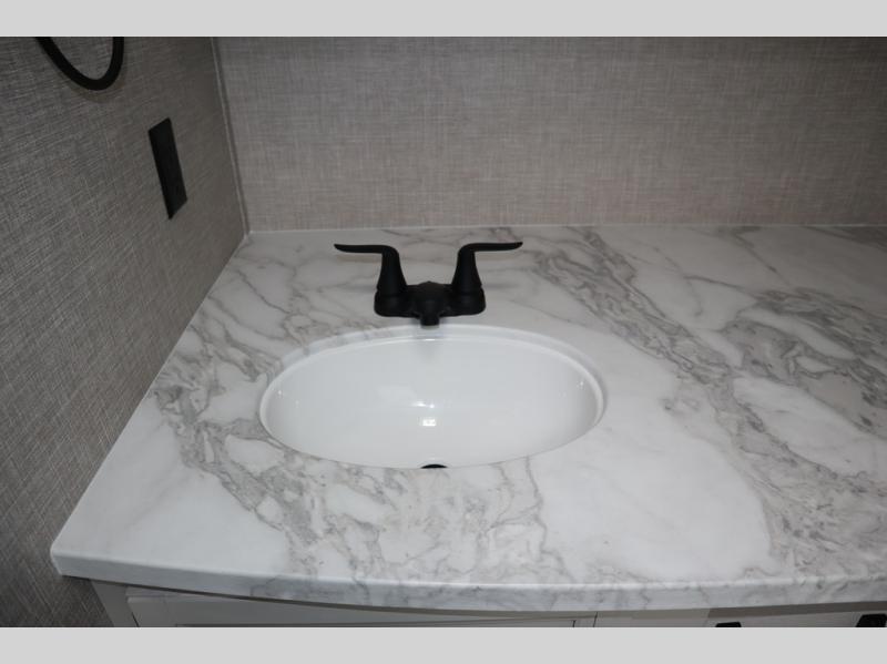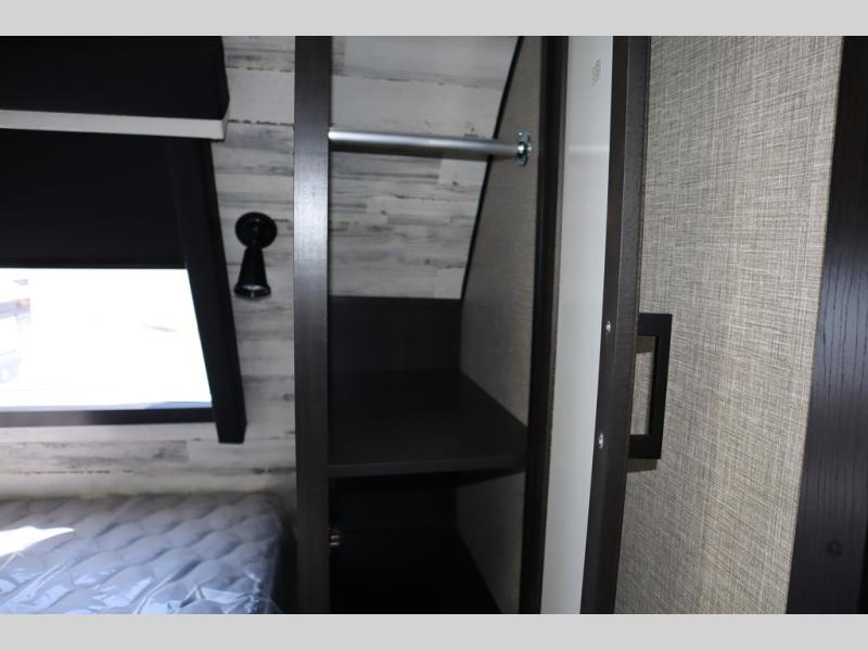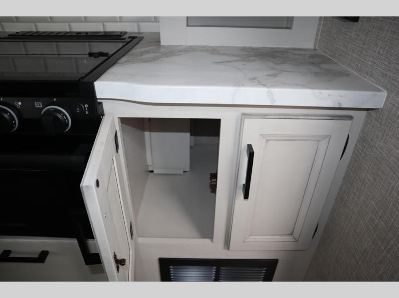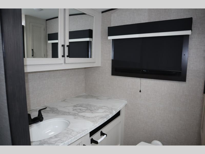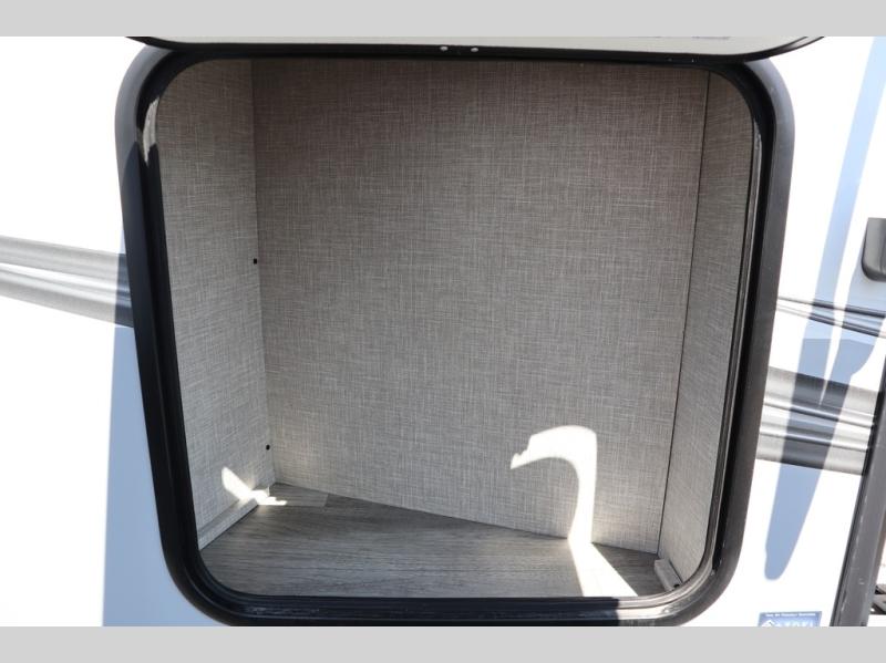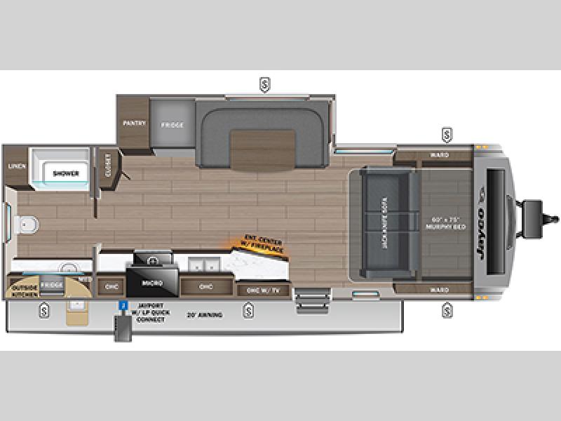 This versatile travel trailer is perfect for your family of four. The Murphy bed will provide comfortable sleeping space at night, and the jack-knife sofa will give you a place to relax during the day. Your crew can gather around the U-shaped dinette across from the fireplace, plus there is an LED TV here for movie night. This model also includes an outside kitchen under the 19' awning for an inviting outdoor living space, and two pass-through storage compartments for all your gear. And don't forget about the spacious full rear bath with plenty of counterspace, a medicine cabinet and a linen closet for clean towels!