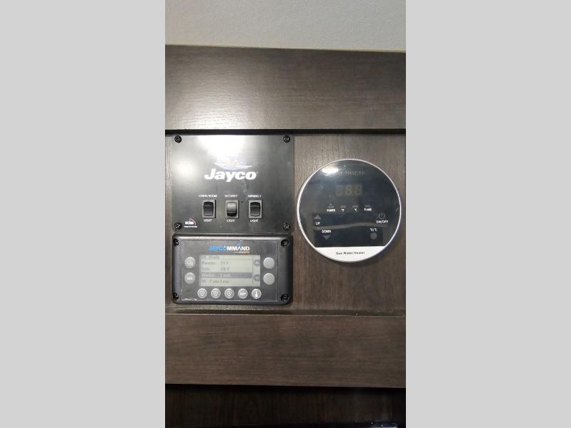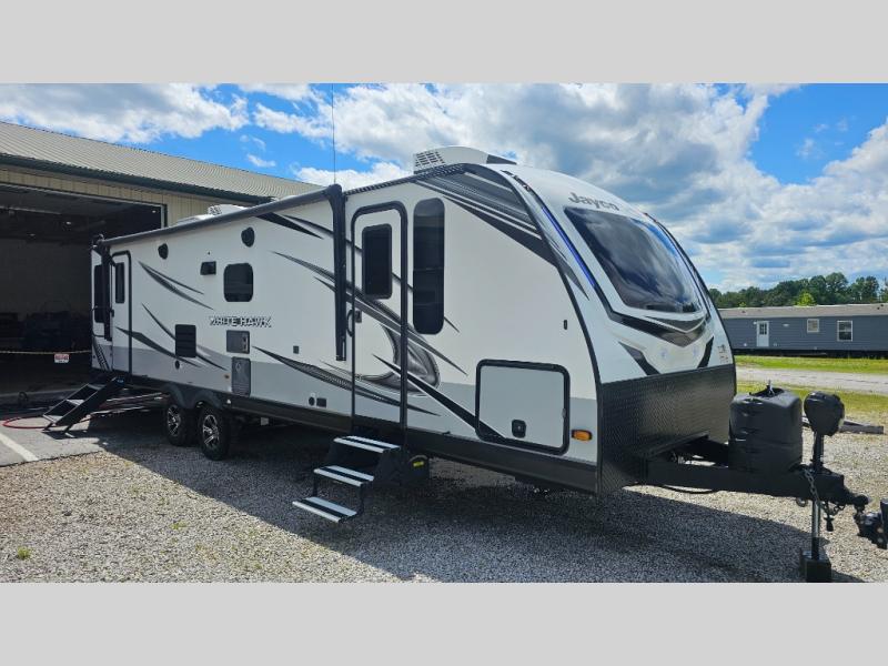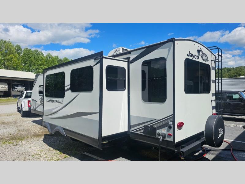 The lightweight White Hawk travel trailers by Jayco will blow you away with their roomy interiors, luxurious amenities, and durable construction. The Magnum Truss Roof System can withstand 50% more weight than the competition, and the Stronghold VBL lamination is the lightest, yet strongest in the industry. Each model includes the JAYCOMMAND "Smart RV" system with a tire pressure monitor system, plus American-made Goodyear tires for maximum durability and carrying capacity. You will love the sleek look of the front molded fiberglass cap with an automotive windshield and blue LED accent lighting, along with the frameless windows and automotive-style aluminum rims. The White Hawk travel trailers also include an arched interior ceiling, a kitchen skylight with a shade, residential vinyl flooring with cold crack resistance, and an electric fireplace.