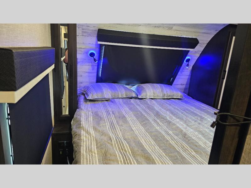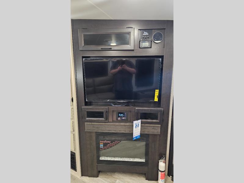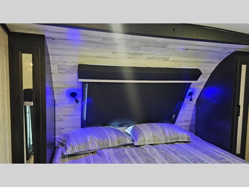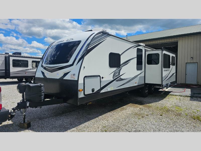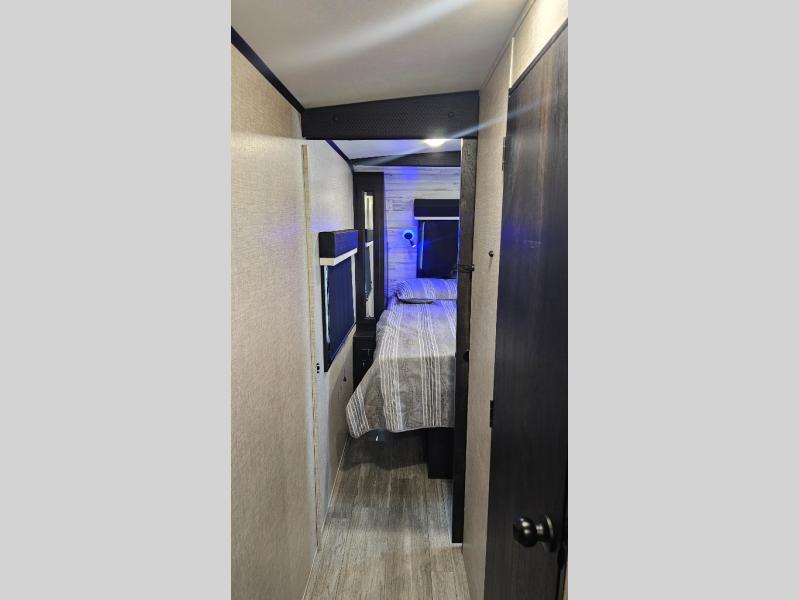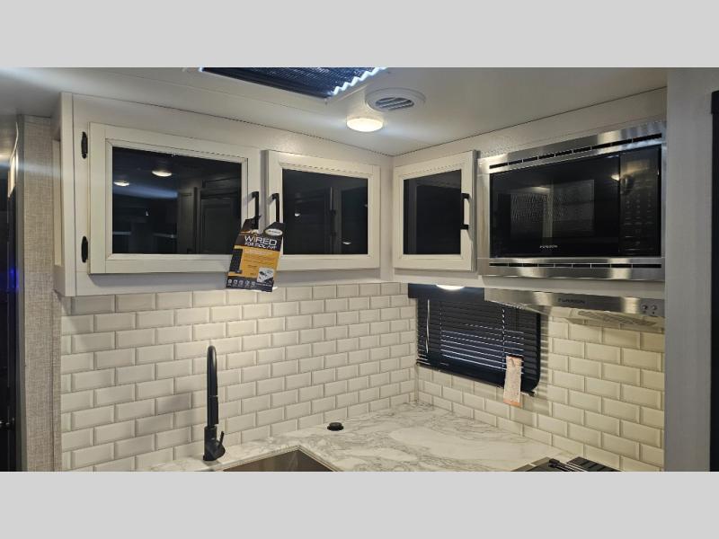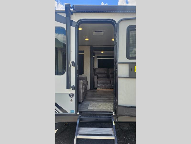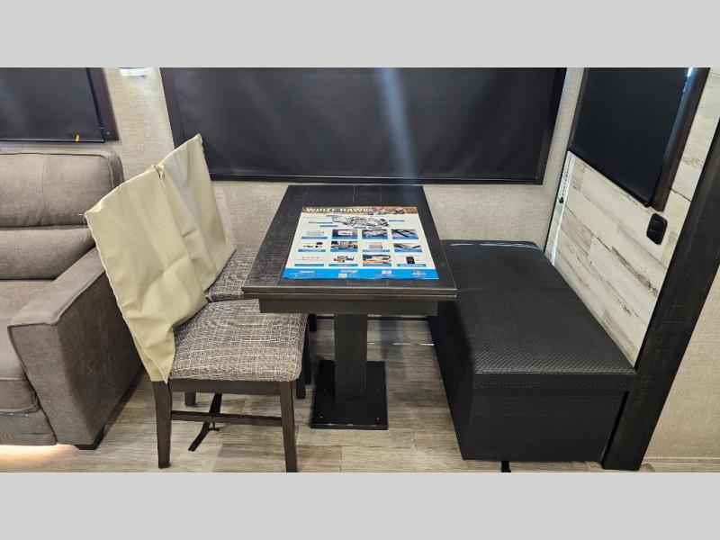 How does a dual entry travel trailer sound with sleeping space for five? Pack up and head to the lake because this model is the one! Once you arrive at your destination, set up the 20' power awning and a enjoy a cold drink in your camp chair. There is a convenient Jayport with an LP quick connect if you want to hook up your gas grill you brought along, and plenty of outside storage to bring along the fishing poles. Inside, your crew can relax on the tri-fold sofa, the booth dinette, or the rear theater seat, which is in great view of the LED TV and fireplace. Preparing meals will be easy in this White Hawk kitchen with plenty of counter space, a three burner cooktop, plus a microwave oven. The full bath includes a linen closet to store clean towels and a medicine cabinet to bring along your necessities. And don't overlook the front private bedroom with a queen bed, dual wardrobes, and its own exterior entry door for convenience!