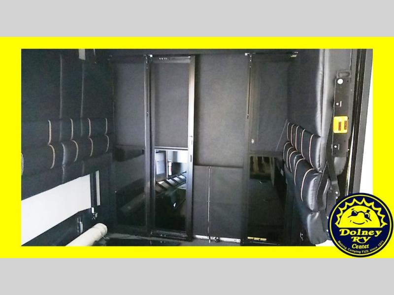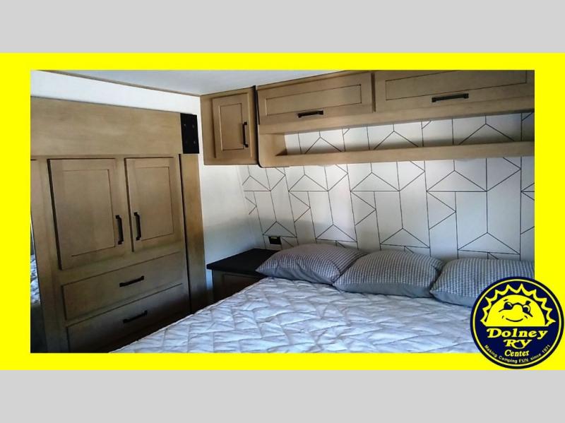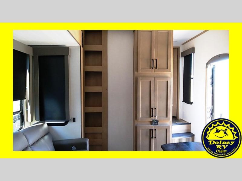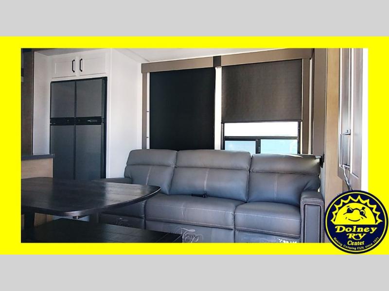 This tandem axle fifth wheel offers a 10' separate garage, two slide outs, dual entry and so much more giving you the ultimate experience while camping with your ATV, motorcycles, or whatever you want to haul in the garage. After unloading using the ramp door, you can easily set up the electric bed with dual opposing sofas to sleep or relax on, and the loft includes a twin bed and there is access from the main living and kitchen area. The U-shaped counter includes a large farmhouse style sink, kitchen appliances, and overhead cabinets. You can dine at the dinette table with bench seating, or while at the 97" sofa with recliners, and everyone can watch the 50" LED TV with surround sound. There is a full bathroom to get cleaned up in, and the front bedroom offers a queen bed, a wardrobe slide, plus wireless phone chargers, nightstands and wardrobes.