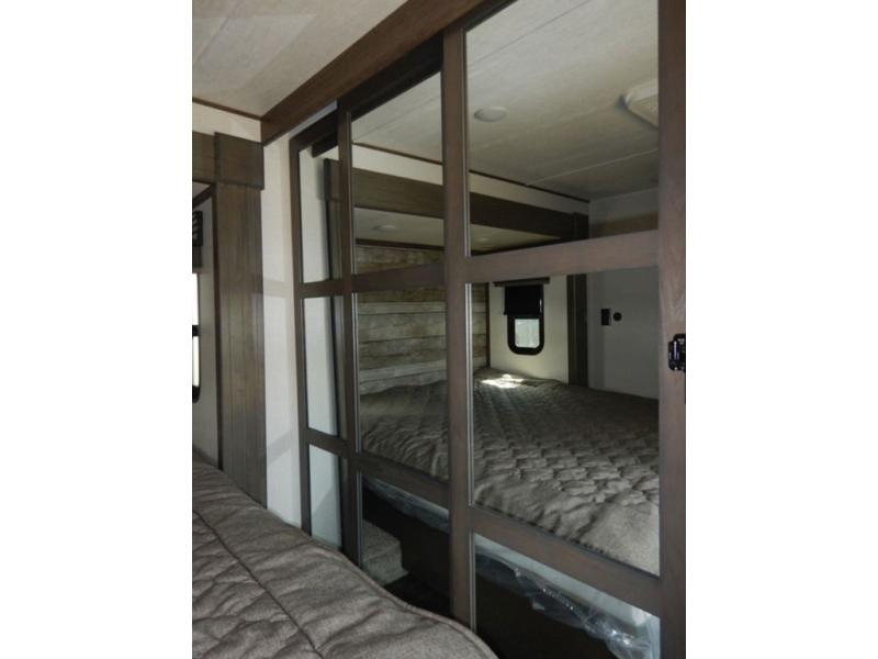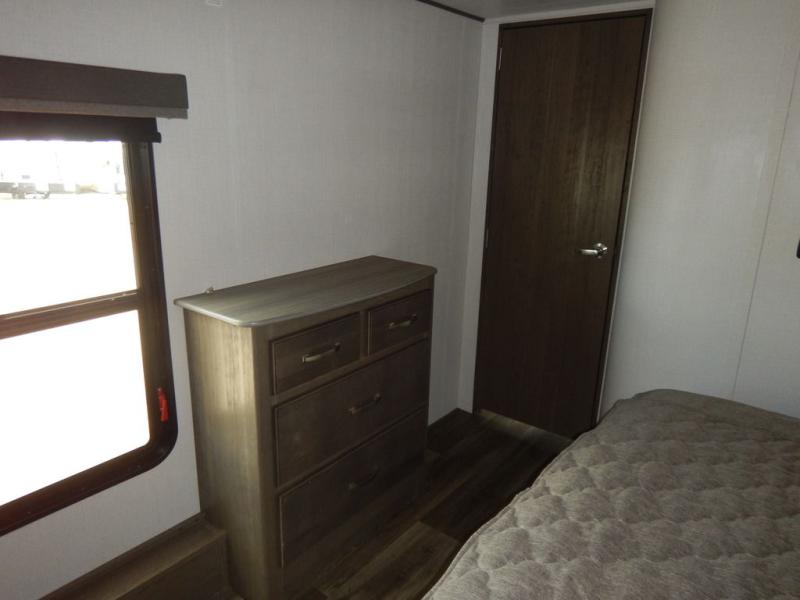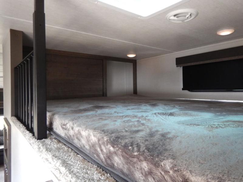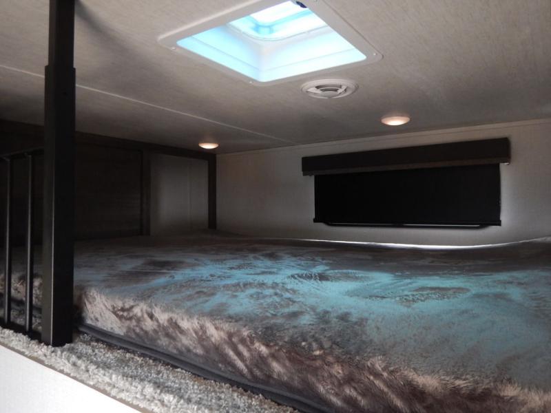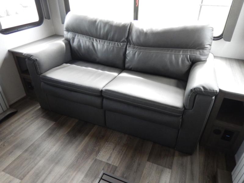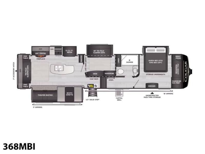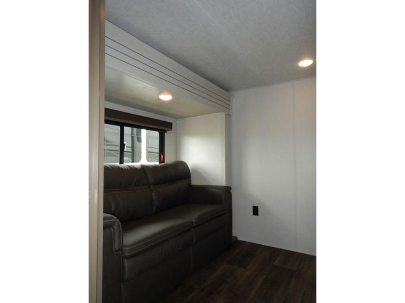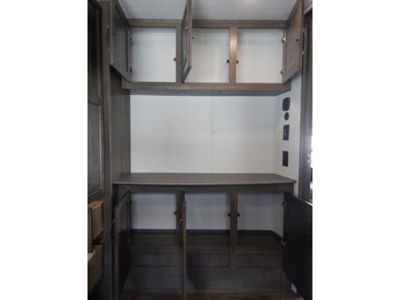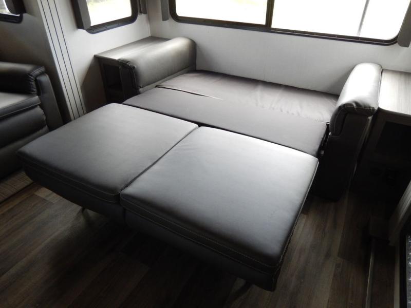You'll love having an extra room that you can decide what to do with on this Cougar fifth wheel! Since it has a 68" tri-fold sleeper sofa and a desk, it can serve as a bedroom, living room, or even an office. Above this room is a loft which adds more sleeping space without taking up precious interior living space. And speaking of space, you'll find more of it in the main living area when you push out the opposing slides. A second tri-fold sleeper sofa sits in the living area, and there is also theater seating that you can rest on in front of the fireplace and LED HDTV. Grab a snack from the pantry, or heat up some food in the microwave if you can't wait for dinner to be ready. The full bathroom has a linen closet for your towels and washcloths, and there is also great storage in the front private bedroom with the under-bed storage, dresser, and a full-height wardrobe.
