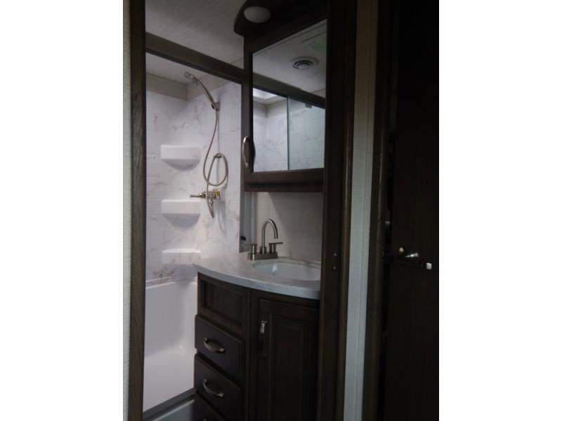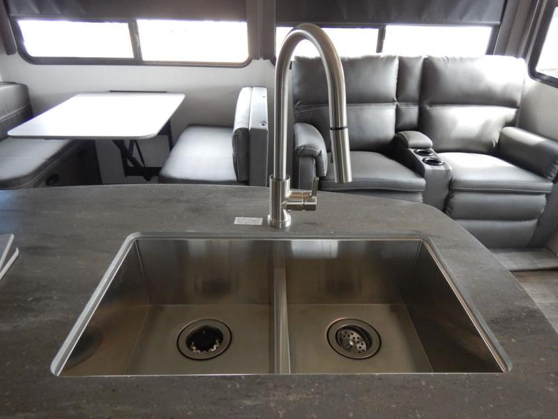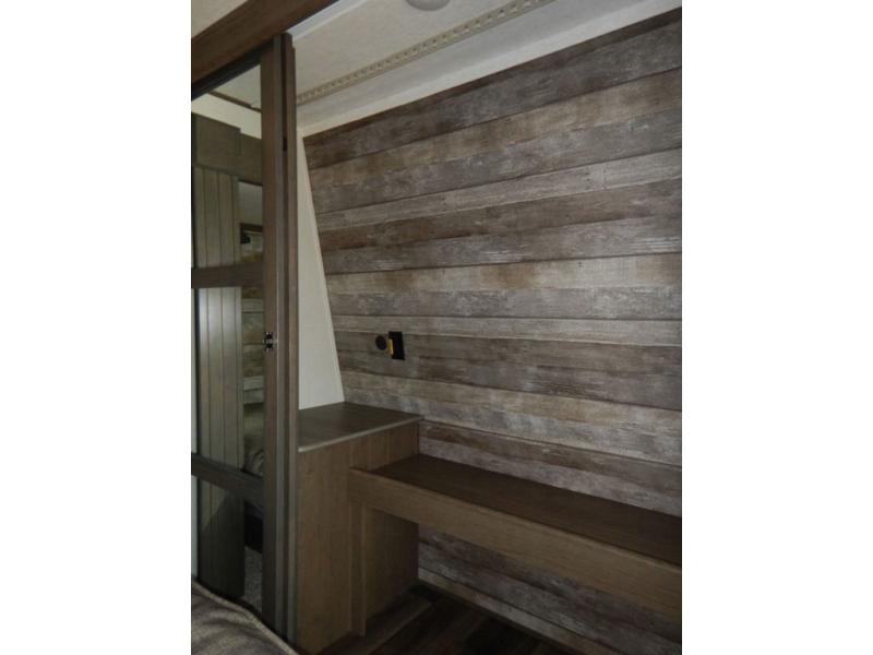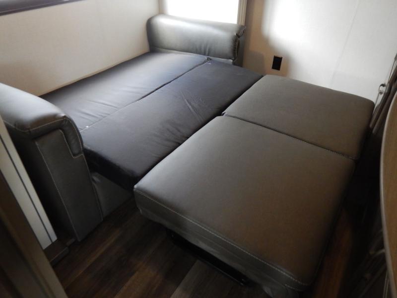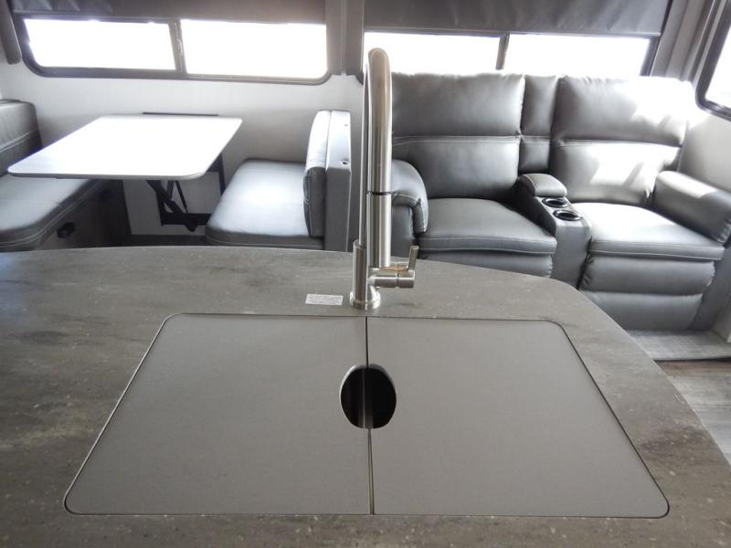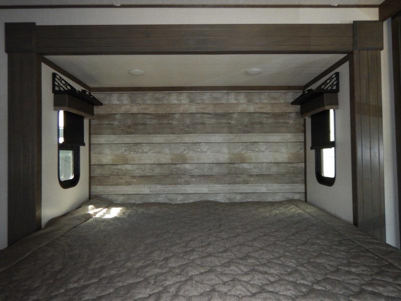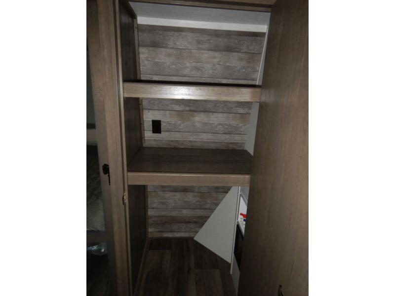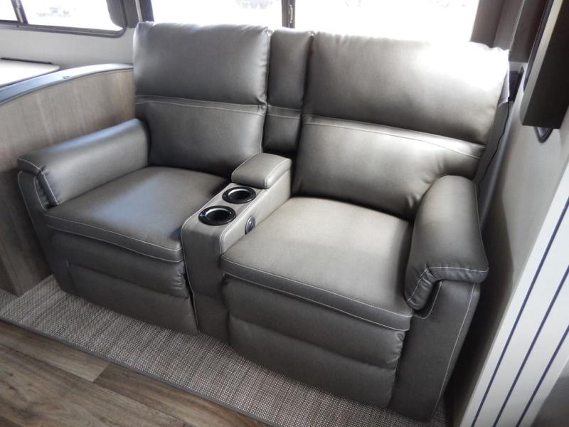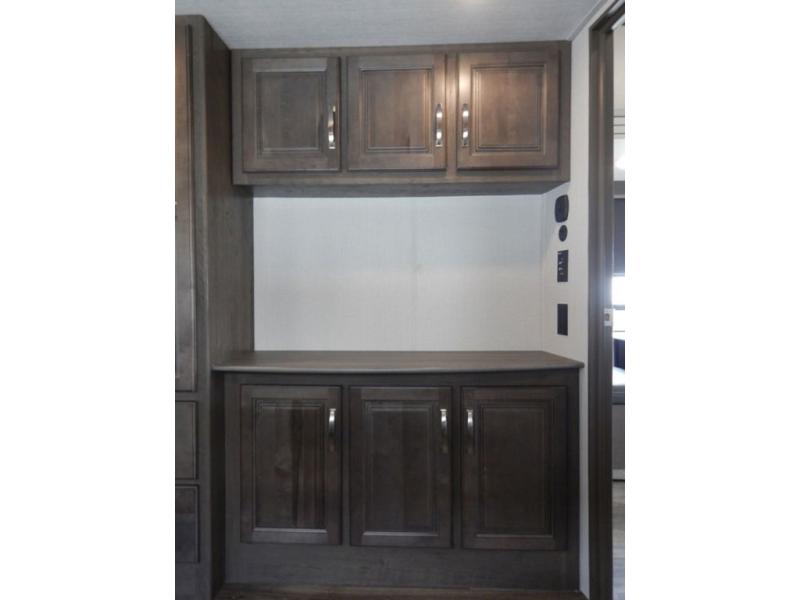 You'll love having an extra room that you can decide what to do with on this Cougar fifth wheel! Since it has a 68" tri-fold sleeper sofa and a desk, it can serve as a bedroom, living room, or even an office. Above this room is a loft which adds more sleeping space without taking up precious interior living space. And speaking of space, you'll find more of it in the main living area when you push out the opposing slides. A second tri-fold sleeper sofa sits in the living area, and there is also theater seating that you can rest on in front of the fireplace and LED HDTV. Grab a snack from the pantry, or heat up some food in the microwave if you can't wait for dinner to be ready. The full bathroom has a linen closet for your towels and washcloths, and there is also great storage in the front private bedroom with the under-bed storage, dresser, and a full-height wardrobe.