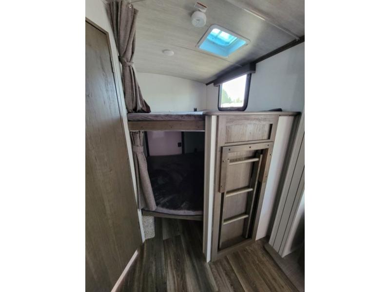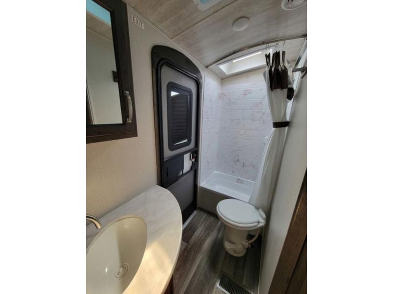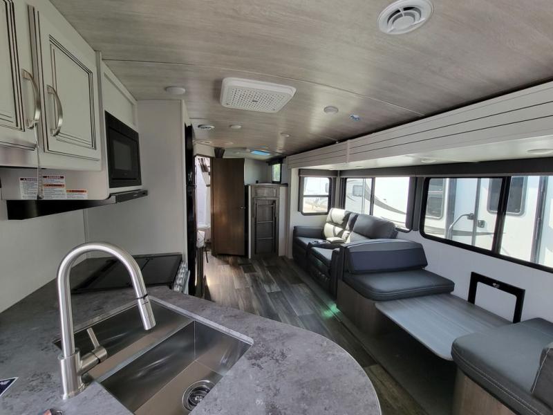 There are so many reasons to love this Cougar Half-Ton travel trailer! One of the reasons you'll love it is because it can sleep nine people comfortably each night with the double-size bunks, 68" tri-fold sleeper sofa, booth dinette, and king-size bed. Another reason that this trailer will be one of your favorites is that there is a second entry door that leads directly into the rear corner bathroom so that you don't have to trample all throughout the interior when you need to go.
