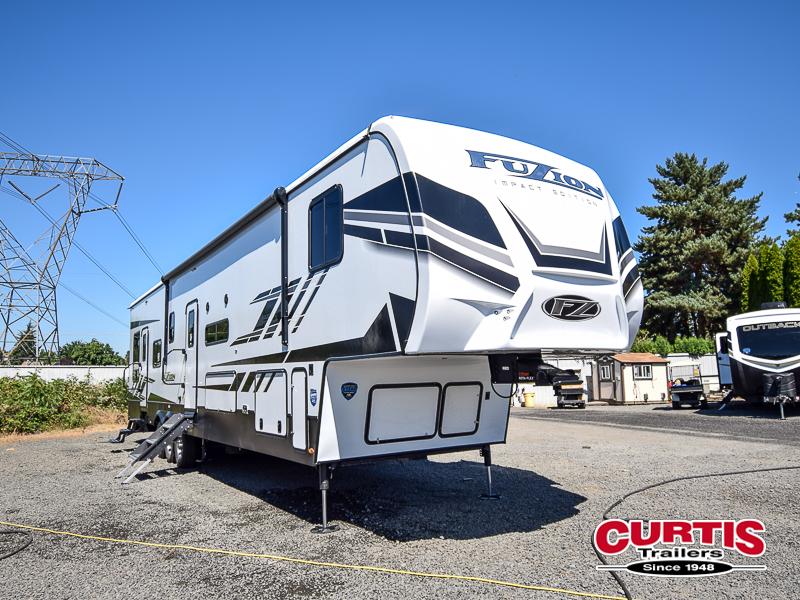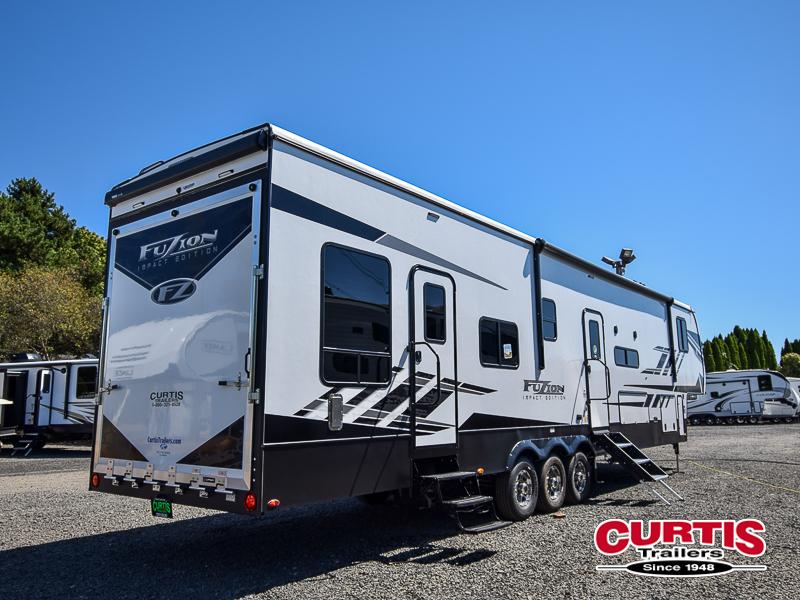 With any Fuzion Impact Edition toy hauler, the robust construction gives you years of enjoyment, and the unexpected conveniences and technology allow you to enjoy the indoors while exploring outdoors on a budget! Some standout features include the blade high-performance air flow system delivering an average of 20% more cooling power, and the 5k Interlock tie downs rated up to 5,000 lbs. each. The SolarFlex 200 delivers affordable, high quality solar energy and you can choose an option to upgrade if you like. While indoors, you will appreciate full-extension ball bearing drawer guides, pressed countertops, hardwood cabinetry, and bedside outlets/USB to keep your electronics charged. Choose an easy-to-tow, value-minded and impactful Fuzion Impact Edition toy hauler travel trailer or toy hauler fifth wheel today!
