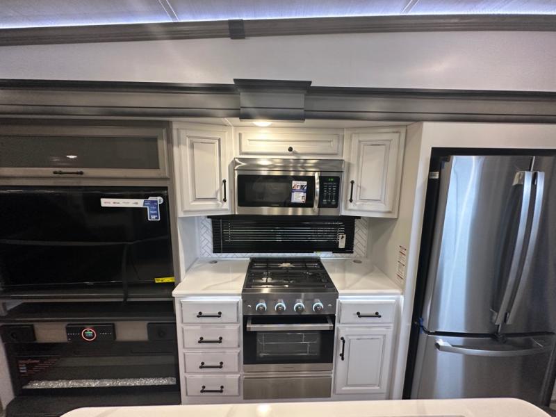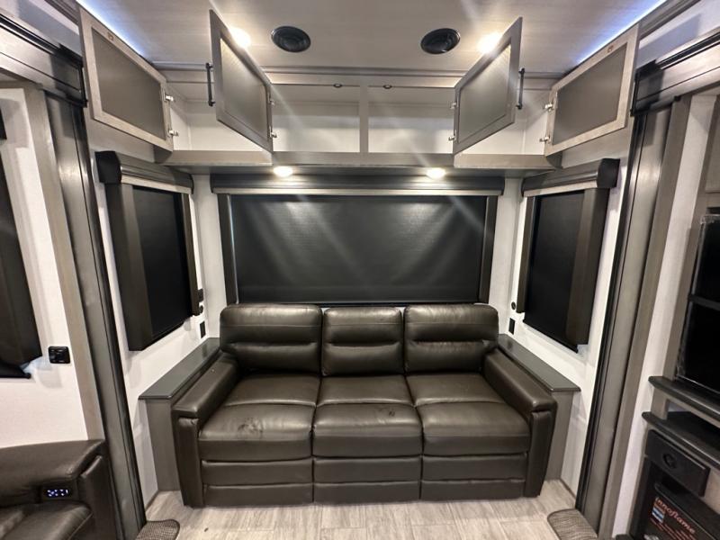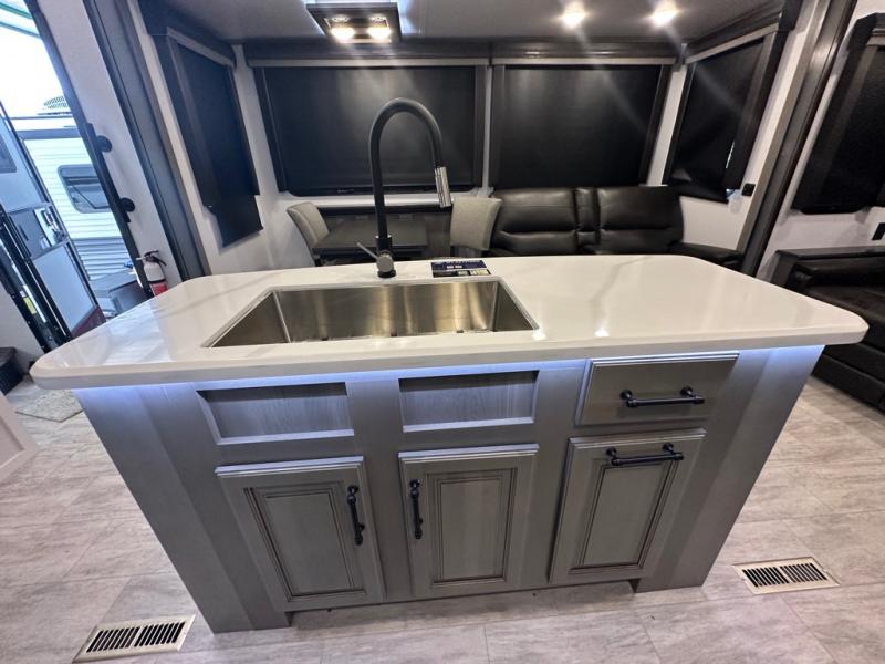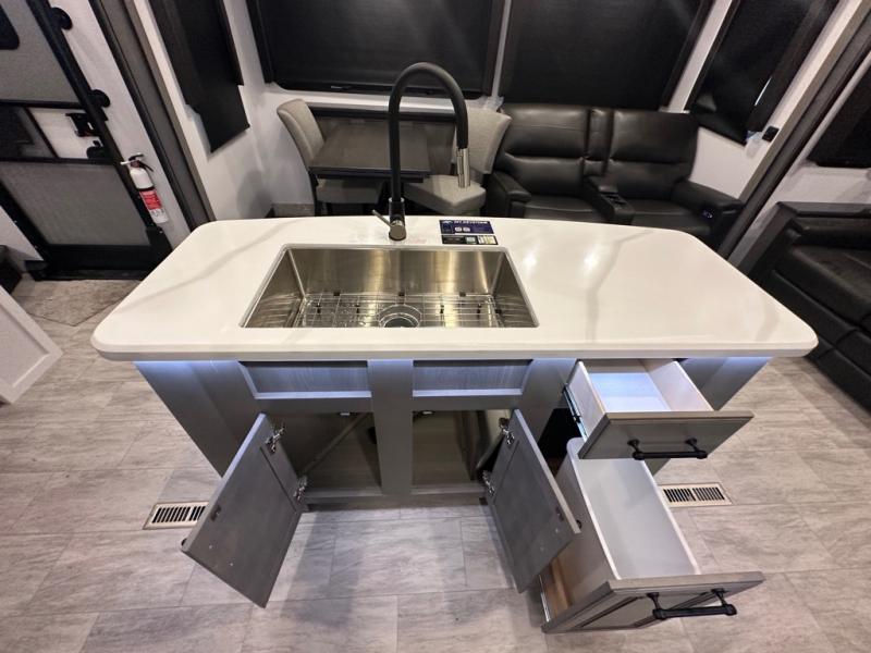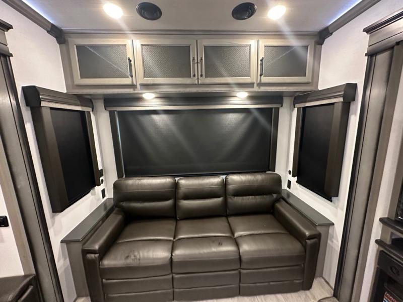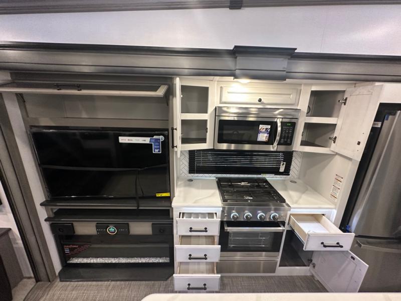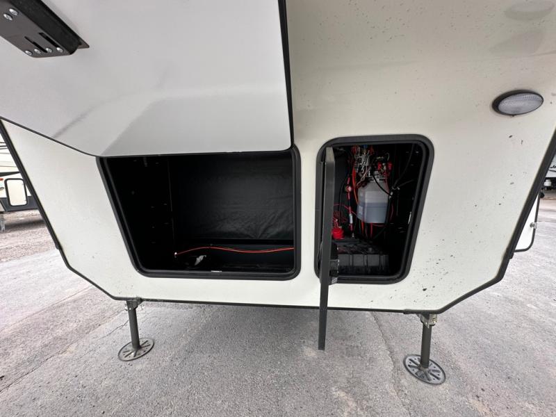 You will have everything you need for a comfortable camping trip and then some with this fifth wheel! The kitchen island will make your meal prepping easier, the pull-down spice rack makes it easier to season your meals, and the designated coffee station will be a big hit for the coffee lovers. Your delicious meals can be enjoyed at the free standing legless dinette with leaf, chair buddy strut, two luxury chairs, and two folding chairs, plus 110V outlets to charge your electronics. Relax on either the rear hide-a-bed sofa or the power Thomas Payne theater seating across from the entertainment center with a 50" LCD HDTV and 5,000 BTU decorative fireplace heater. The front private bedroom has a king bed slide with storage underneath for extra blankets and a front closet that has a clothing hamper to keep your dirty clothes out of the way before washing them in the stackable washer and dryer if you chose to add that option.