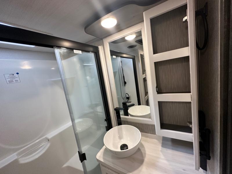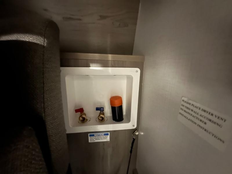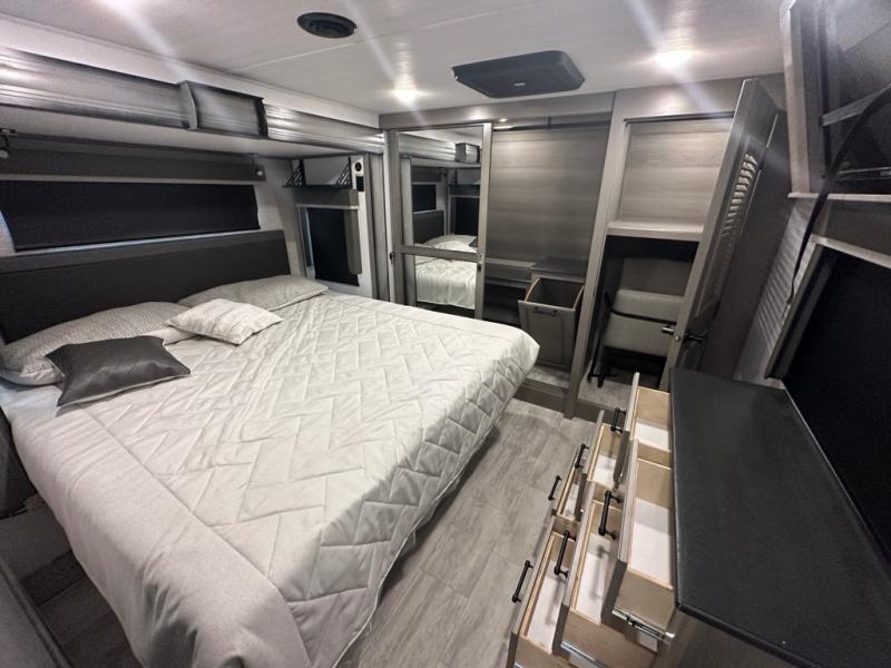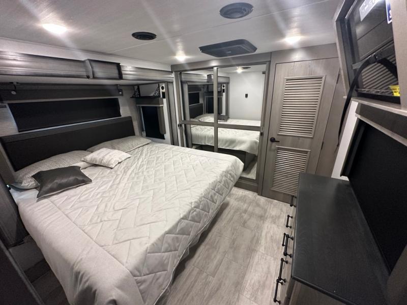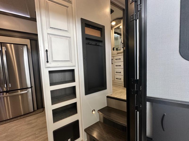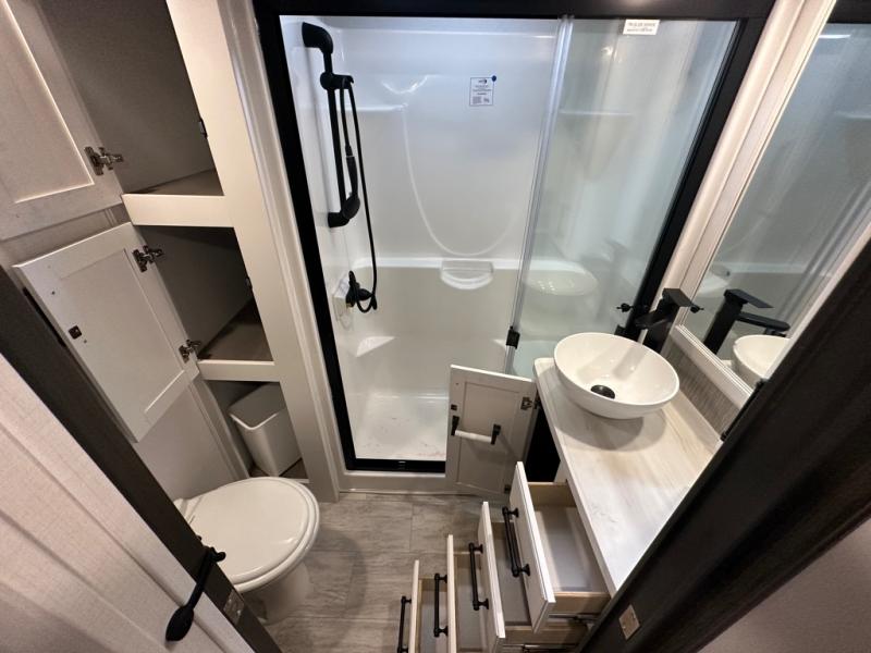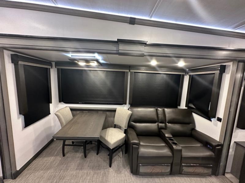 You will have everything you need for a comfortable camping trip and then some with this fifth wheel! The kitchen island will make your meal prepping easier, the pull-down spice rack makes it easier to season your meals, and the designated coffee station will be a big hit for the coffee lovers. Your delicious meals can be enjoyed at the free standing legless dinette with leaf, chair buddy strut, two luxury chairs, and two folding chairs, plus 110V outlets to charge your electronics. Relax on either the rear hide-a-bed sofa or the power Thomas Payne theater seating across from the entertainment center with a 50" LCD HDTV and 5,000 BTU decorative fireplace heater. The front private bedroom has a king bed slide with storage underneath for extra blankets and a front closet that has a clothing hamper to keep your dirty clothes out of the way before washing them in the stackable washer and dryer if you chose to add that option.