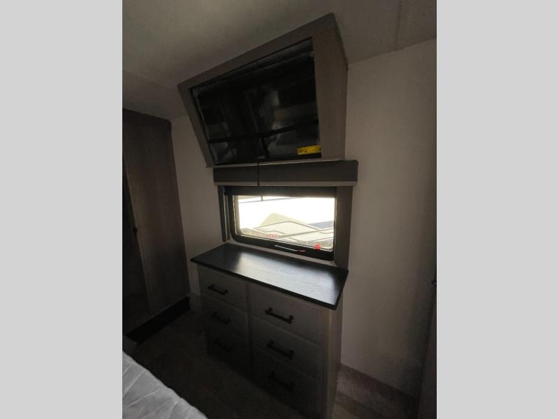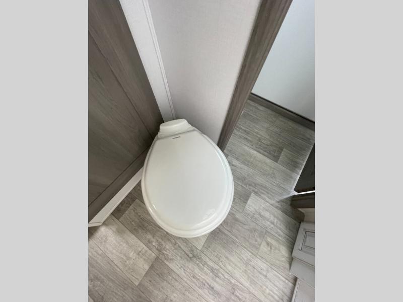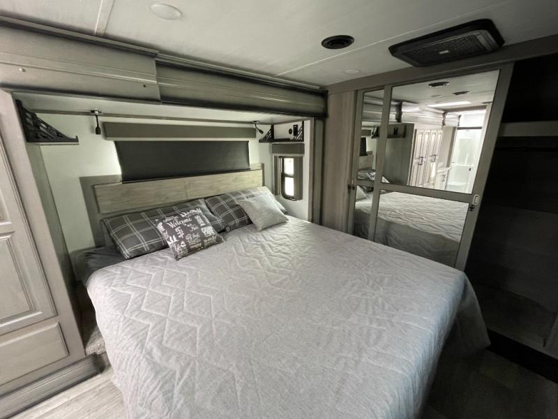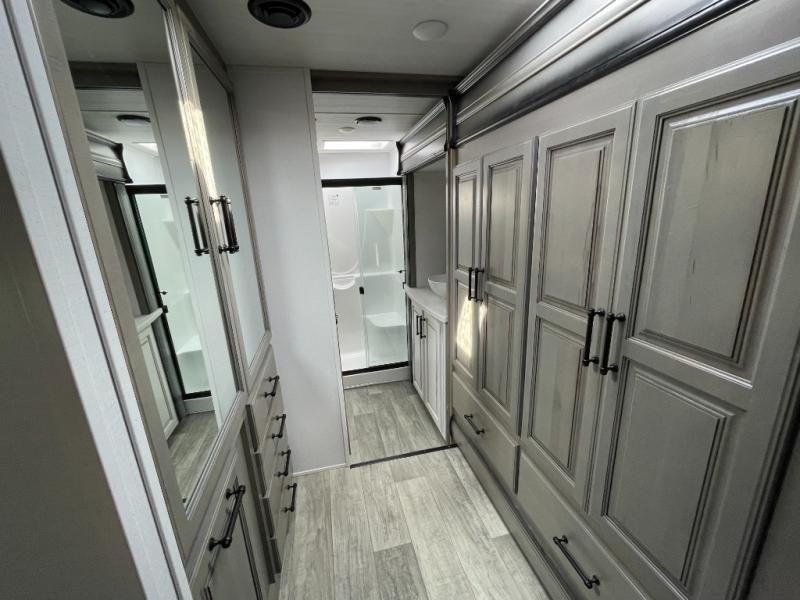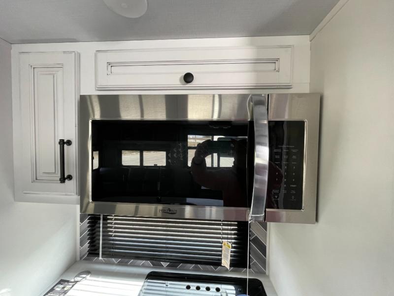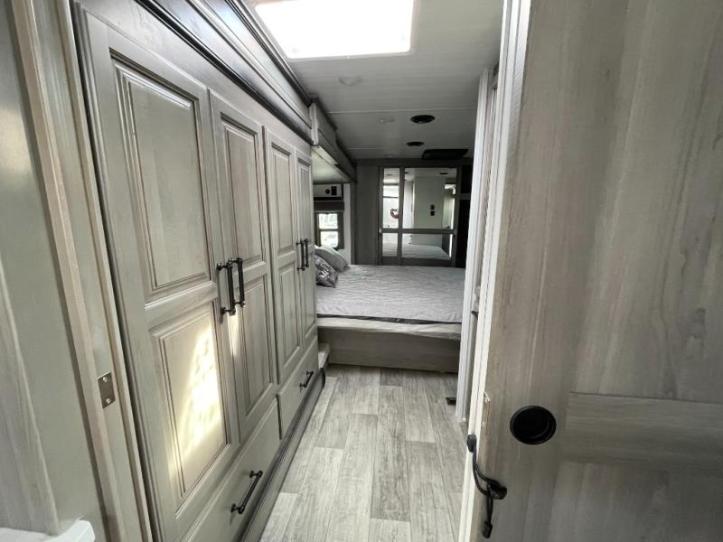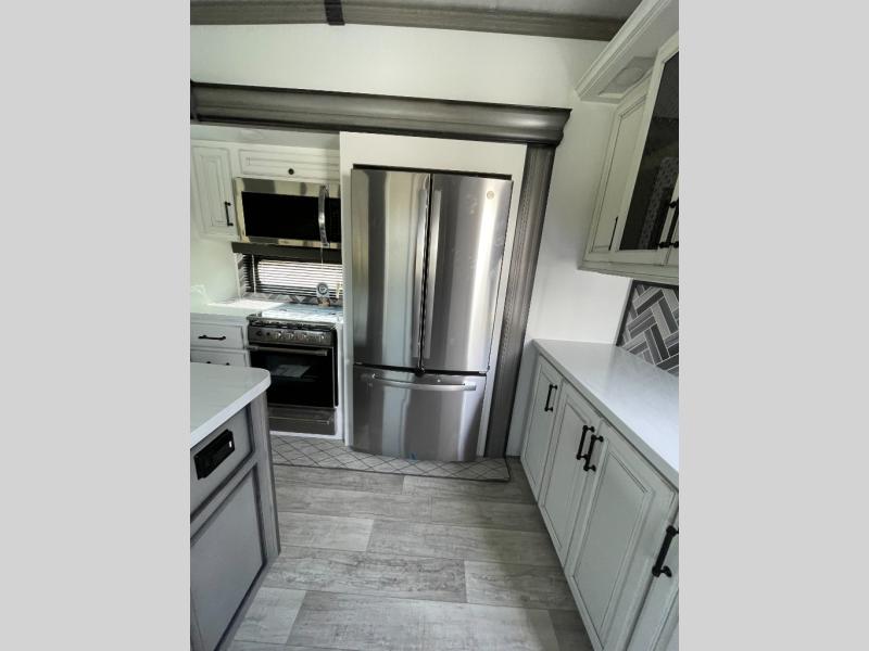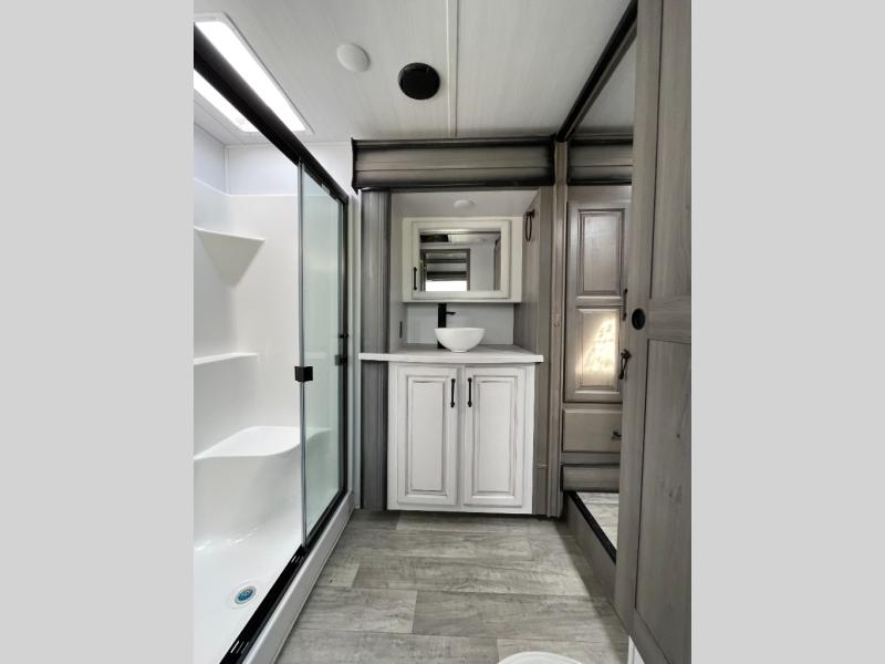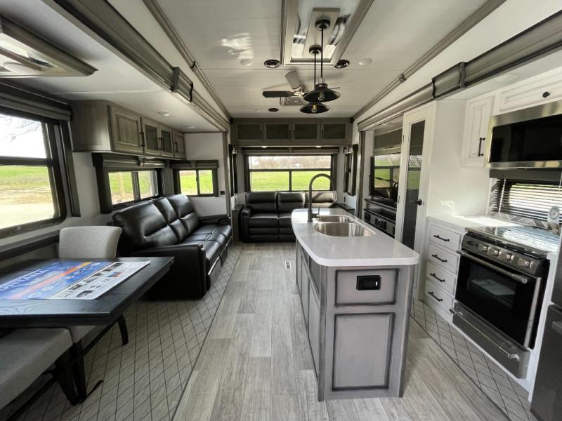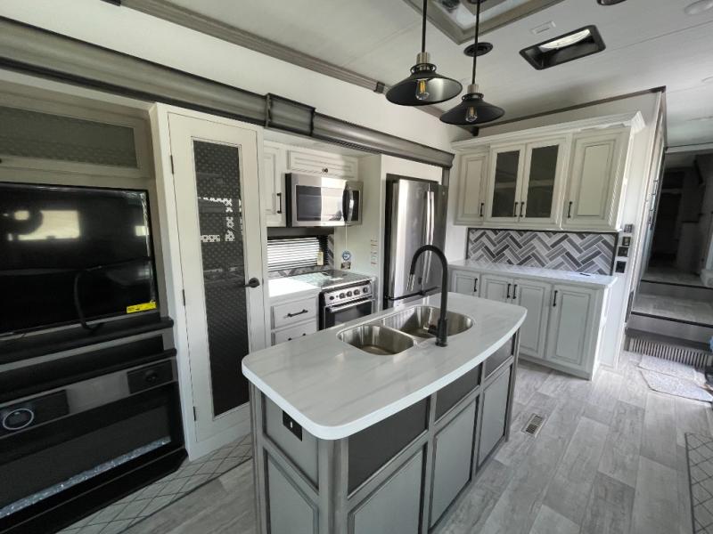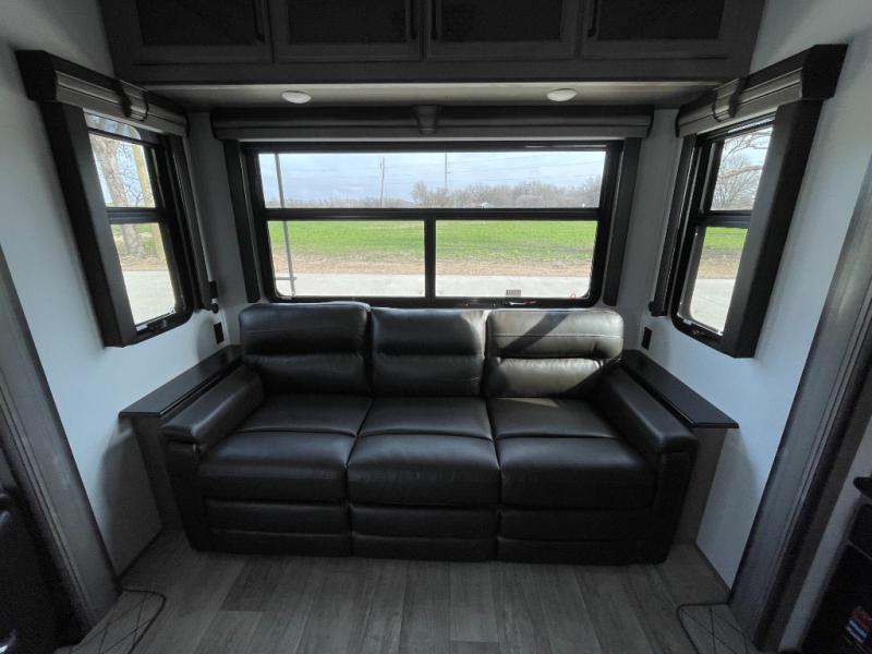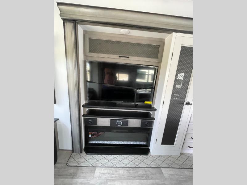 Sleep like royalty in the front master suite of this fifth wheel! It features a king bed slide with storage underneath, a front large closet, an area prepped to add an optional washer and dryer, a walk-in closet with a wardrobe, and an entrance into the dual entry bathroom. The chef can prepare their best meals with the glass top range, the pull-down spice rack, the kitchen island, and the hutch with countertop space below it. Enjoy your meals at the free standing legless dinette and then head to the rear living area for a relaxing evening watching your favorite movie on the 50" LCD HDTV while a fire goes in the 5,000 BTU decorative fireplace heater across from the power Thomas Payne theater seating and rear hide-a-bed sofa which can also transform into an extra sleeping space!