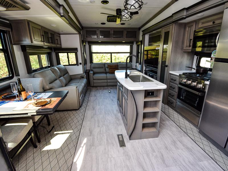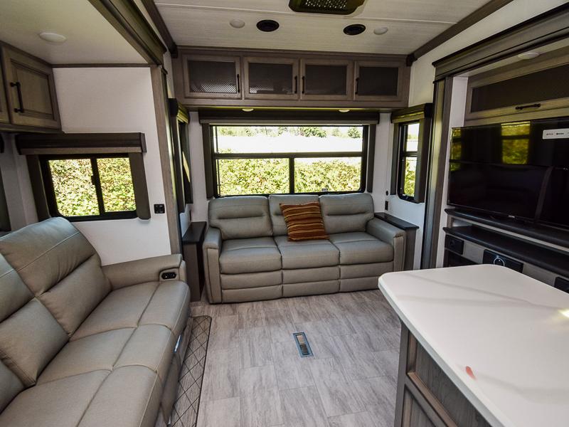 Pack your bags and hitch up this fifth wheel for a fun weekend getaway! The front full bathroom will have you feeling right at home with a large front closet with shelves on either side, a second closet, a bench seat, a 48" x 30" fiberglass shower with a seat and skylight above, and a dual sink vanity for two to get ready at once. It even leads into the master suite where you will find a king bed slide with CPAP shelves above it and storage underneath. There is much to love about the kitchen from the coffee station next to the area prepped for an optional washer and dryer to the kitchen island, the glass top range with a pull-down spice rack above it, and the half bathroom. Enjoy your meals at the free standing legless dinette with storage and 110V outlets then relax on either the rear hide-a-bed sofa or power Thomas Payne theater seating across from the entertainment center with a 5,000 BTU decorative fireplace heater and 50" LCD HDTV to watch your favorite movies!