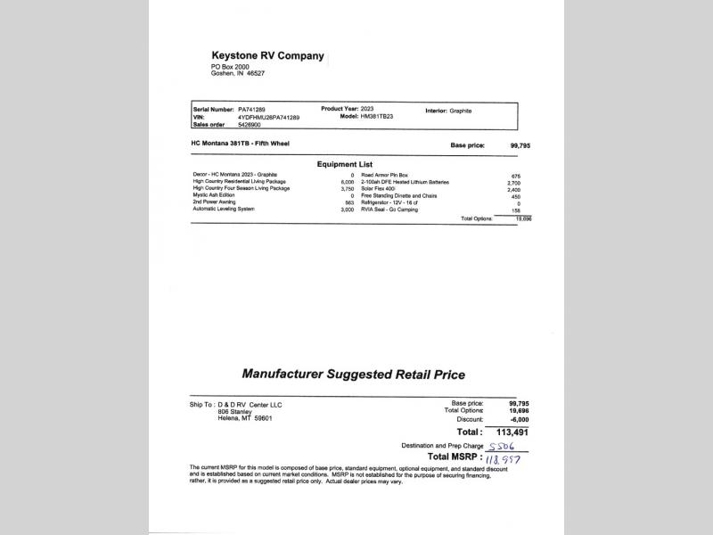 This Keystone Montana High Country fifth wheel 381TB includes these options: