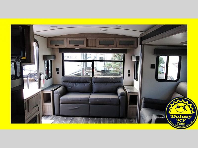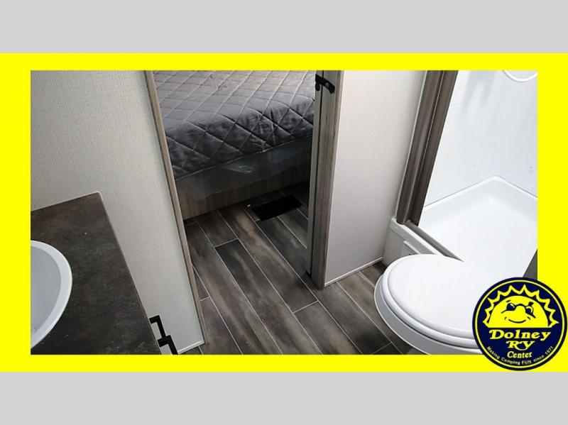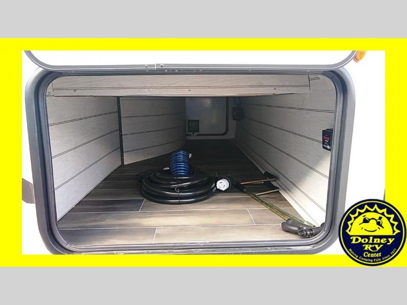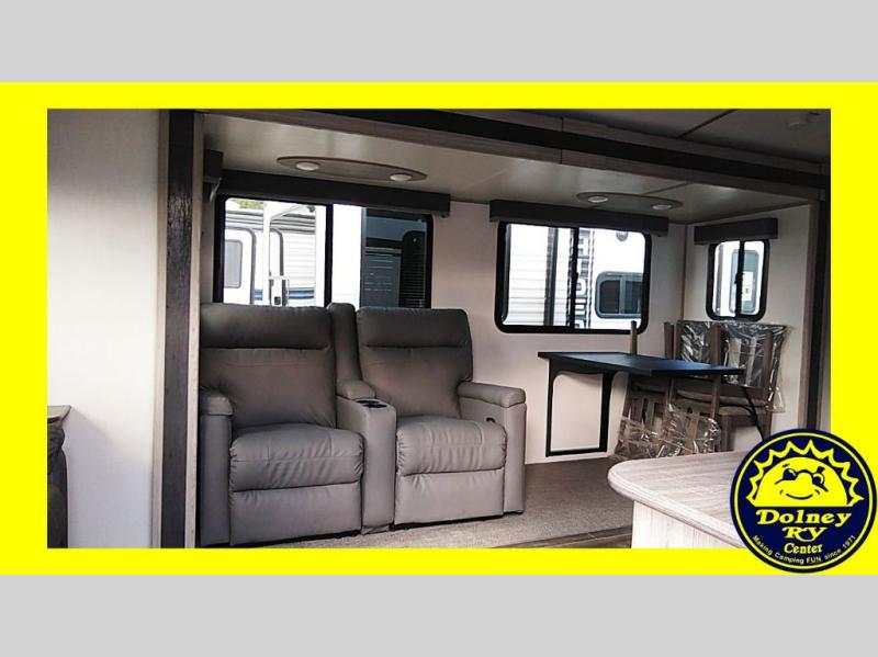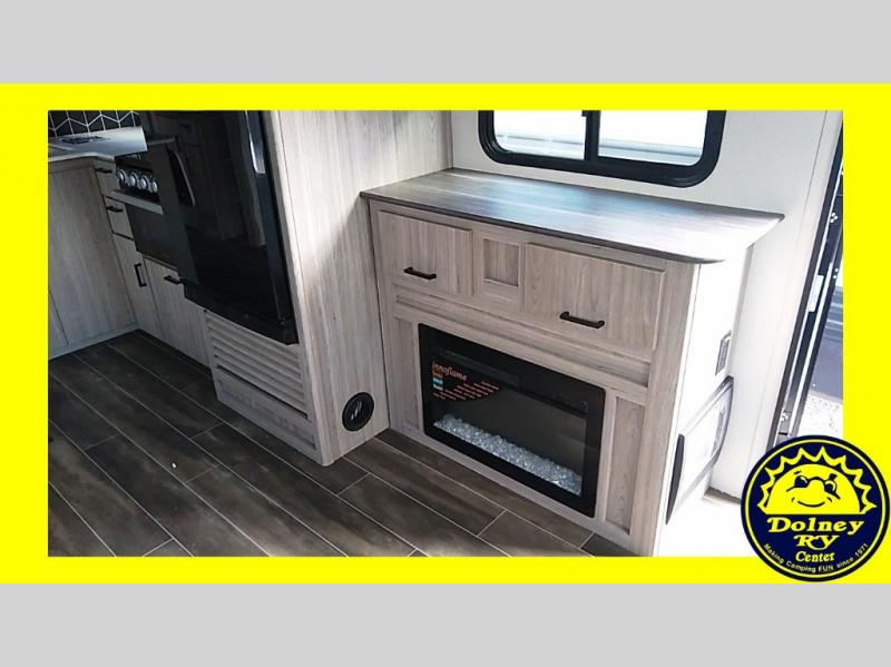 It will be easy to enter and exit this travel trailer with dual entry doors! Relax each evening in the rear living area with the tri-fold sofa sleeper that has end tables to set your drinks on and theater seats across from an entertainment center with a fireplace. The kitchen has everything you need to make your best home cooked meals including a flip-up countertop for more prepping space. Enjoy your meals at the booth dinette or switch it out for the optional free standing dinette. A walk-through bathroom makes it easy for everyone to access especially those staying in the front private bedroom. Inside the bedroom there is a queen bed to lay your head at night with wardrobes and nightstands on either side, a TV prep area, and an entrance/exit door to the unit so you can quietly slip out for an early morning fishing trip!