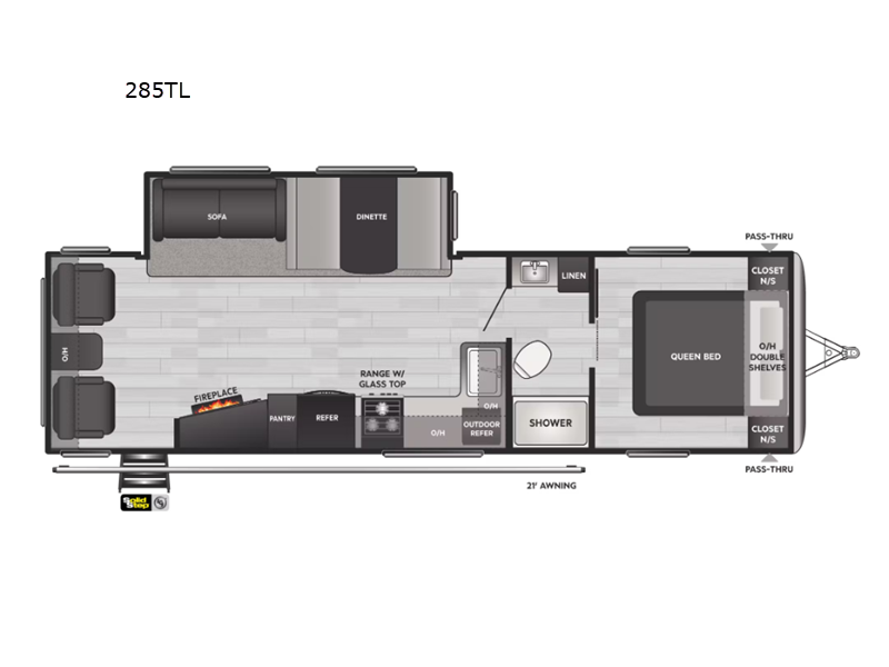 If you want a quick weekend trip or a longer week in the woods, this travel trailer is going to be your best choice because it has everything needed to enjoy your time away! There is a large slide in the main living area to provide you with some extra floor space to relax on the sofa, and the booth dinette will be a cozy spot to sit down with a hot meal. You can use the three-burner range to prepare that meal, the L-shaped counter to serve your meals from, and you can store some canned goods and snacks in the pantry. The fireplace makes this combined space cozy especially during those chilly camping evenings. And the 21' power awning is available for use whenever you want to relax outdoors, just grab your camping chairs from the front pass-through compartment.