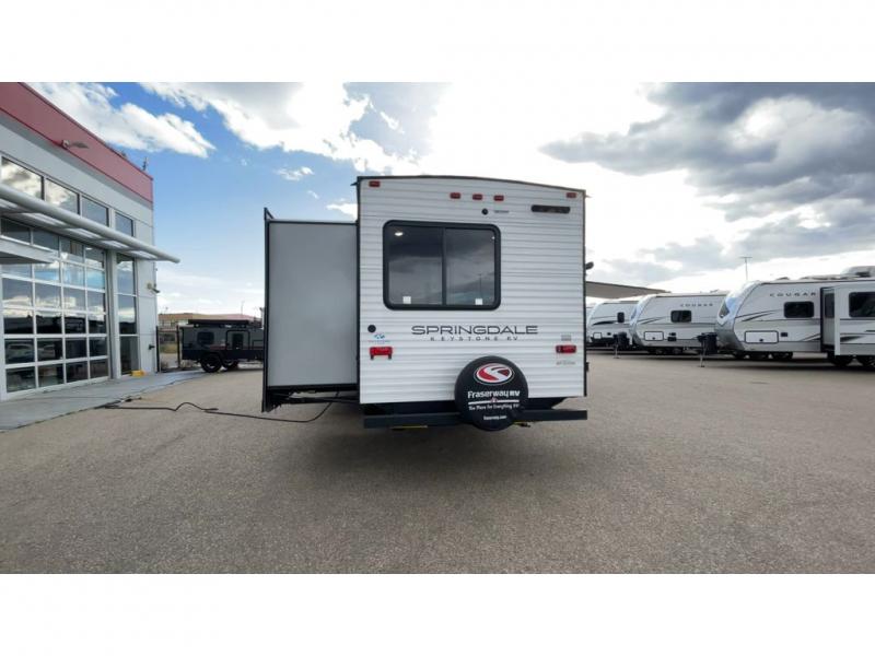 Lots of space, a bunkhouse for the kids or your friends, an interior kitchen and an outdoor kitchen for the chef in the family, two entry doors, and so much more makes this Keystone Springdale travel trailer perfect for a larger family or group of friends to enjoy. The perfect feature for those who love cooking and dining outside is the outdoor kitchen. The second exterior entry makes accessing the bath easy from the outside, and the private bunkhouse features a flip-up bunk above a Fun Lounger, as well as another bunk above an entertainment center on the opposite side. And in the private front bedroom, you can enjoy a bit of seclusion from the rest of the trailer and get a great night's sleep.