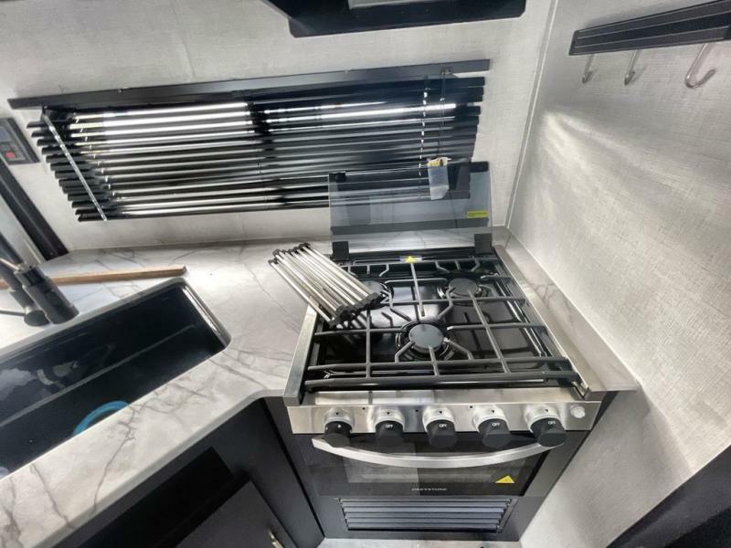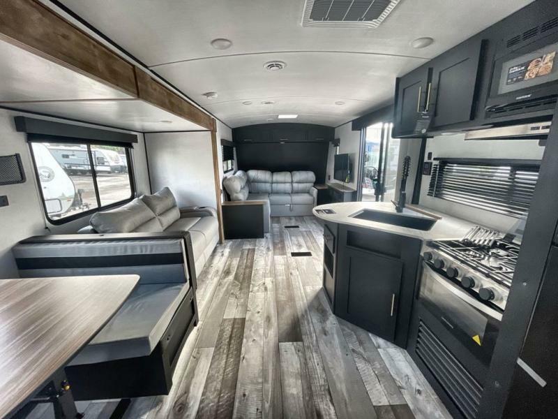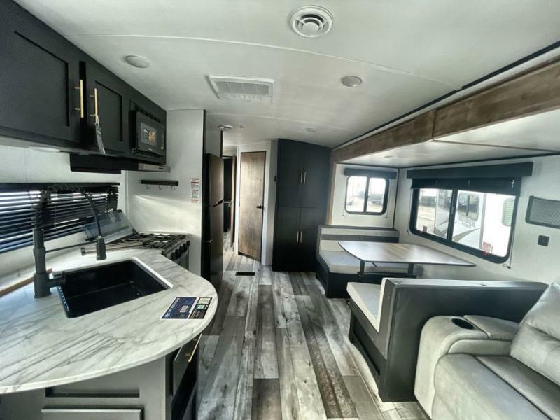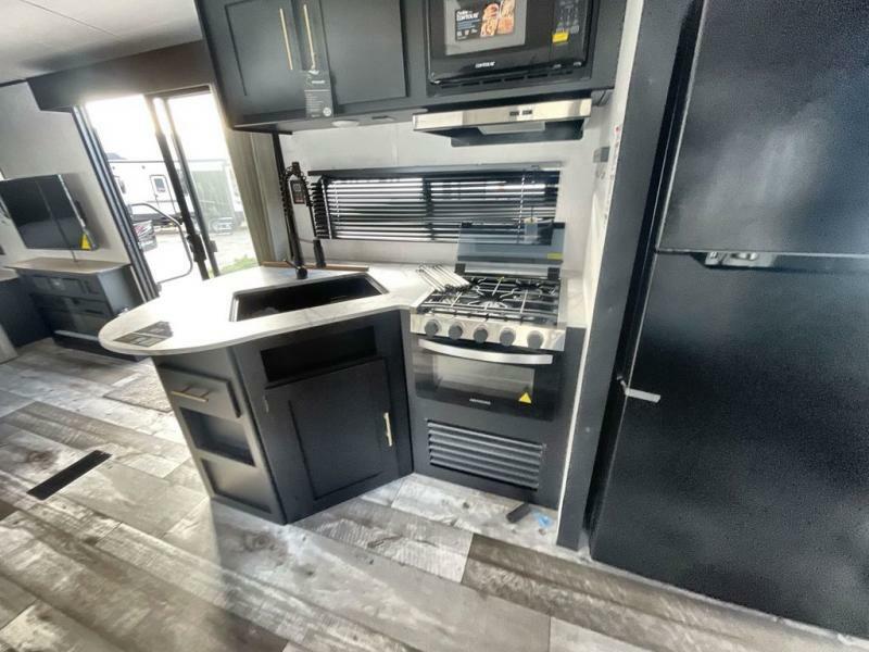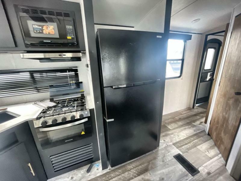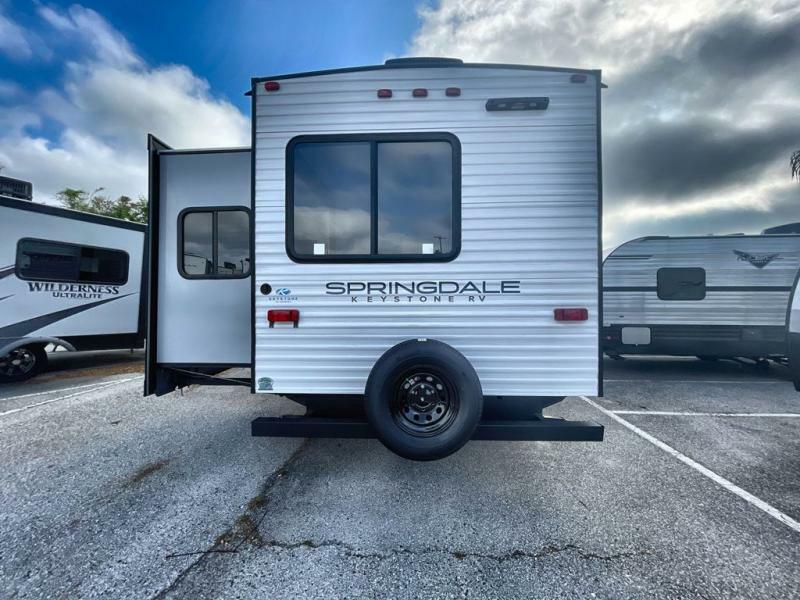 This spacious Keystone Springdale destination trailer allows you to escape to your favorite place be it the lake or the ranch. The front living area offers an L-shaped mega tri-fold sofa, an entertainment center, an LED TV and a fireplace making this area both cozy and comfortable. This is the perfect space to hang out and enjoy a conversation or a movie with family and friends. You will find more seating space in the slide out on the booth dinette and tri-fold sofa, both provide extra sleeping space as well. The kitchen offers all that you need to prepare and cook for your hungry crew for a weekend or longer. There is a large kitchen sink making cleaning up easy, a three-burner range for cooking your meals, and two pantries for dry good storage. And at night, you will have your own queen bed slide in the rear bedroom which offers storage and the second exterior entry for convenience.