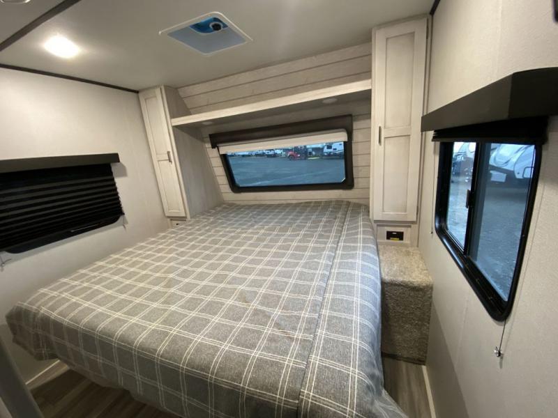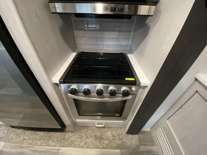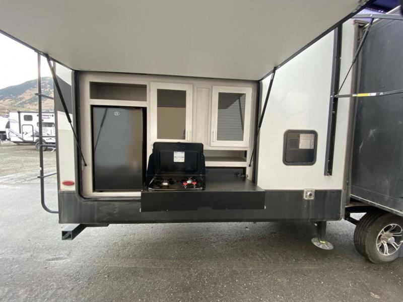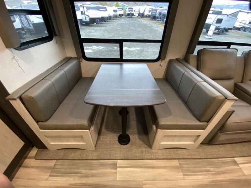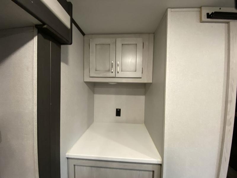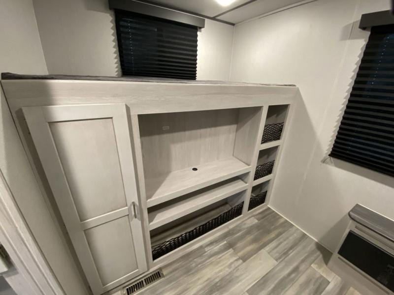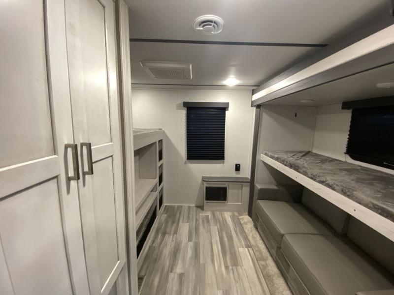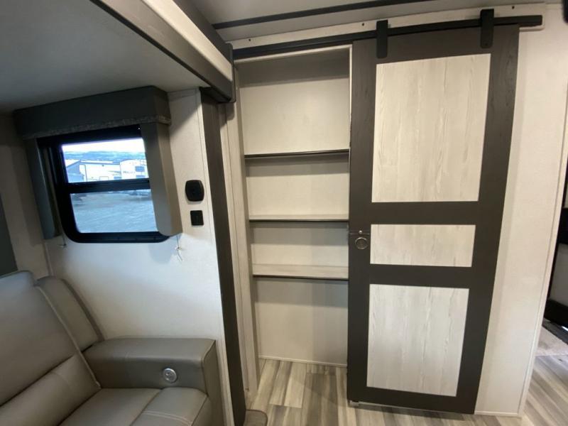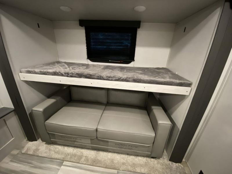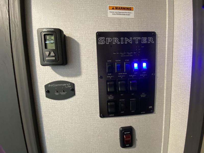 This Sprinter Limited travel trailer is a comfortable trailer that offers you a private sleeping space in the front, and it also offers your friends or your kids their own space in the back with the private bunkhouse. This bunkhouse includes a slide out, a sleeper sofa with storage below a bunk, a 36" x 74" bunk on the other side of the room, a closet, a wardrobe, and a barn door to shut it off from the rest of the trailer. The main living area has opposing slides to add more space for gathering together in the kitchen around the island, and you can rest on the full-reclining theater seating with massage, lights, and USB as you watch the pop-up 50" LED HDTV. You have a booth dinette with hinged storage access so that you can keep your board games and kitchen essentials hidden away, and the full bathroom includes a residential shower to ensure that you have enough room to get clean.