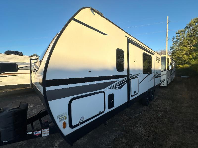 Camping can be comfortable when you park this trailer at the campsite! You will have sleeping space for eight between the popular double-size bunks next to the full bathroom, the queen Murphy bed up front with a sofa to utilize during the daytime, and the U-shaped dinette within the slide out which also includes a wardrobe/storage cabinet. The cook has a galley kitchen with full amenities including a pantry and L-shaped counter with a large sink. They also have the choice of making meals outdoors on the outside kitchen with a griddle. You will find outside storage in the front pass-through compartment for your larger outdoor gear, plus the trunk door allows access to the interior.