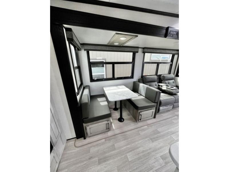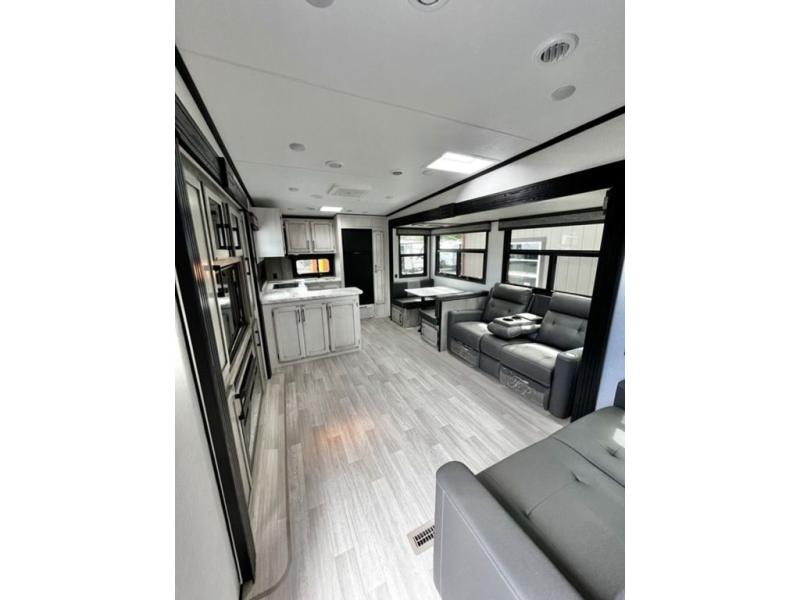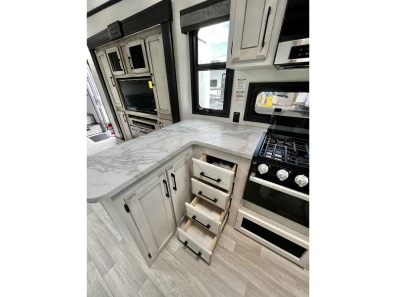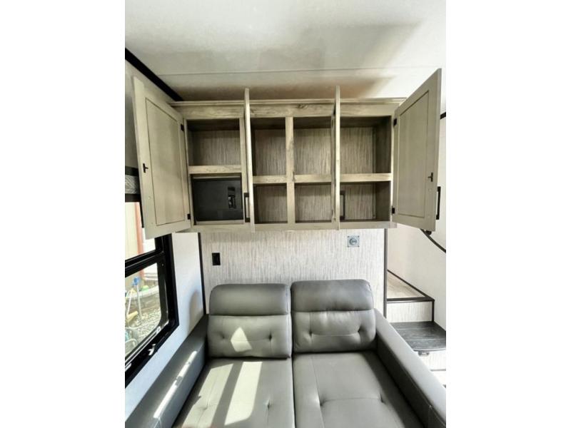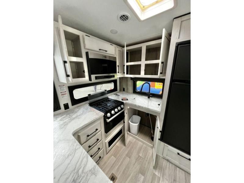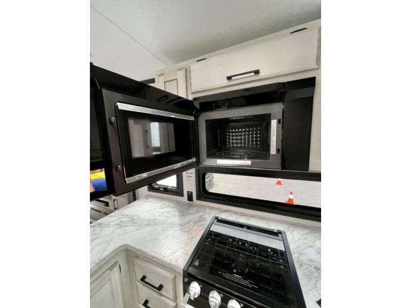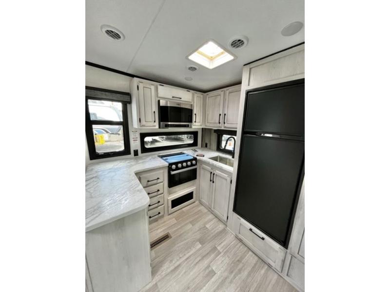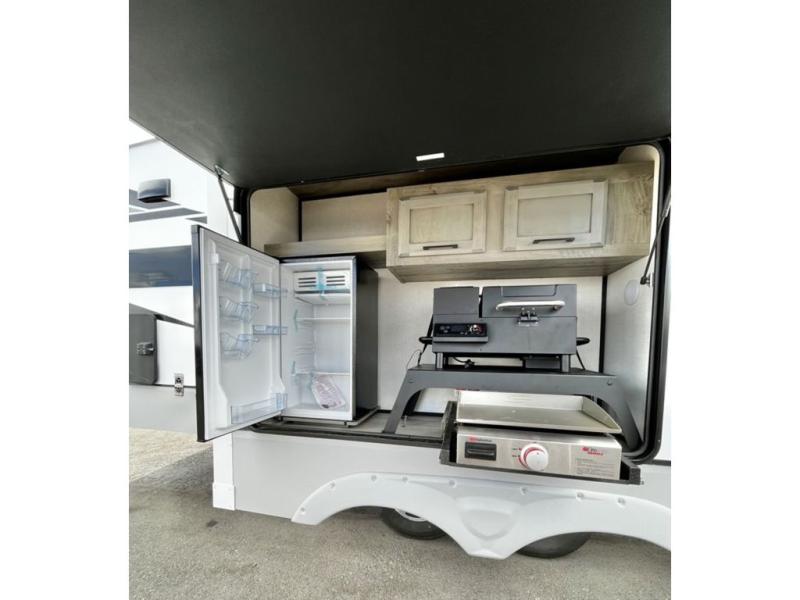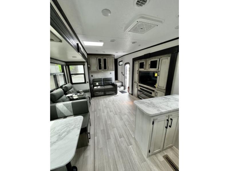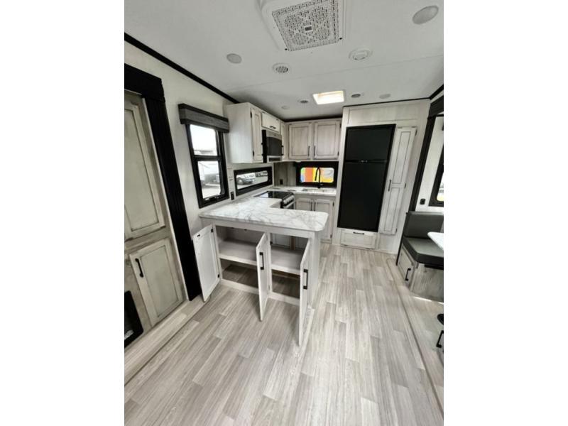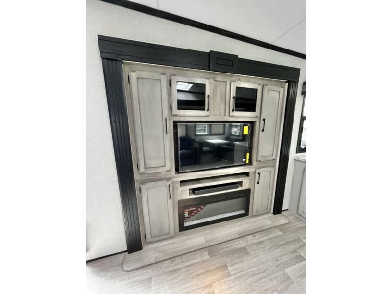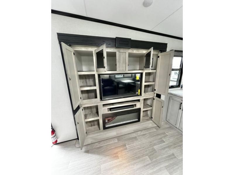 Escape the hustle and bustle of city life for weekends in this cozy fifth wheel. The dual opposing slides in the main living area will create an open floorplan, and you can choose an optional 40" fireplace here for a more at-home feel. There is also an entertainment center and a 43" Smart LED TV for movie night. If the weather is nice, head outdoors to relax under the 14' power awning while the chef of your group cooks on the outside kitchen. The rear kitchen inside features tons of counter space, an 8 cu. ft. gas/electric refrigerator, plus a pantry for dry goods. And don't overlook the front private bedroom with its slide out wardrobe, a closet with washer and dryer prep, and a queen bed!