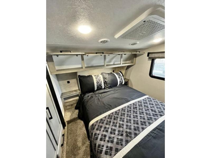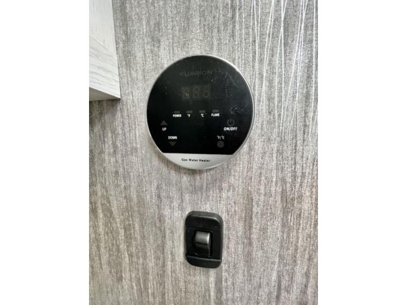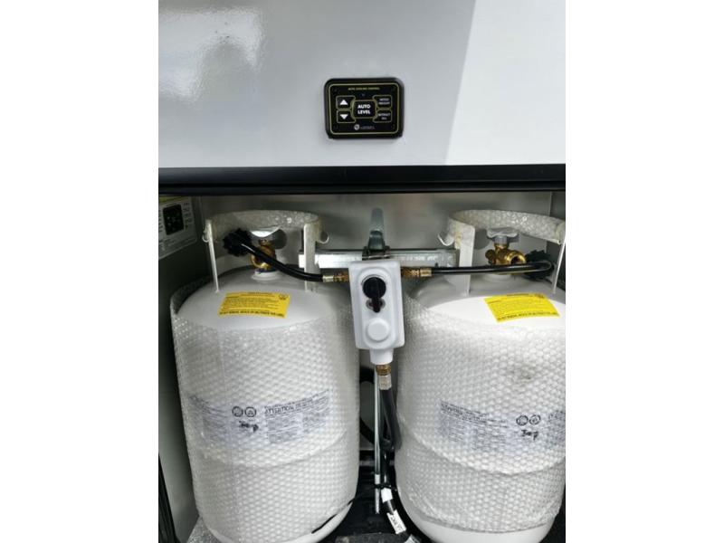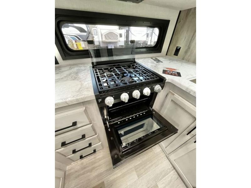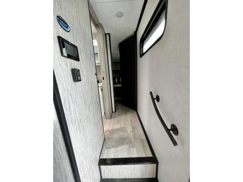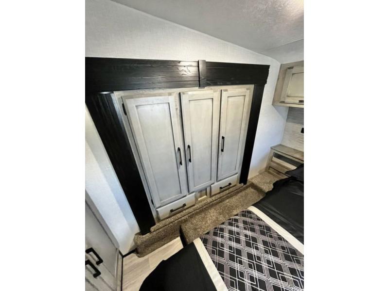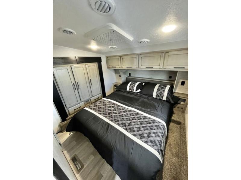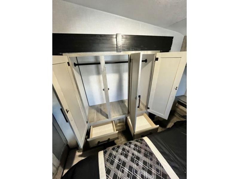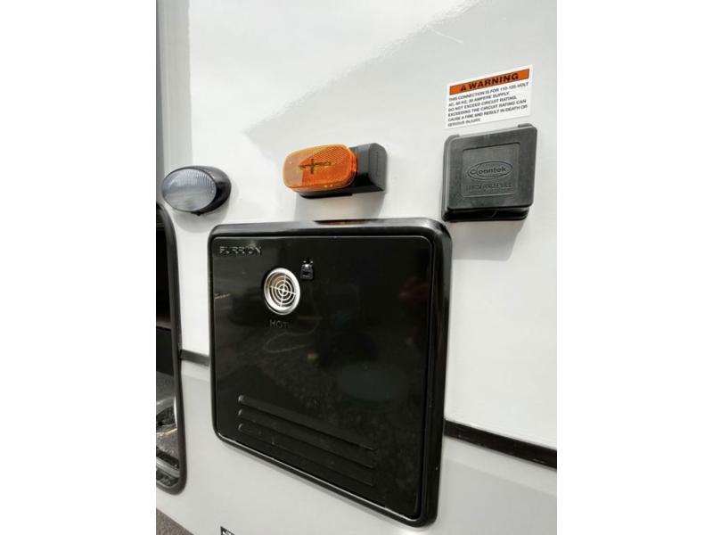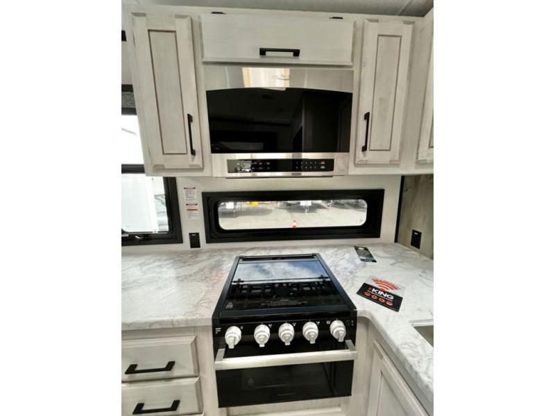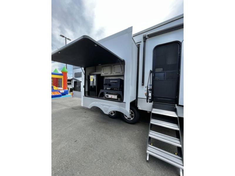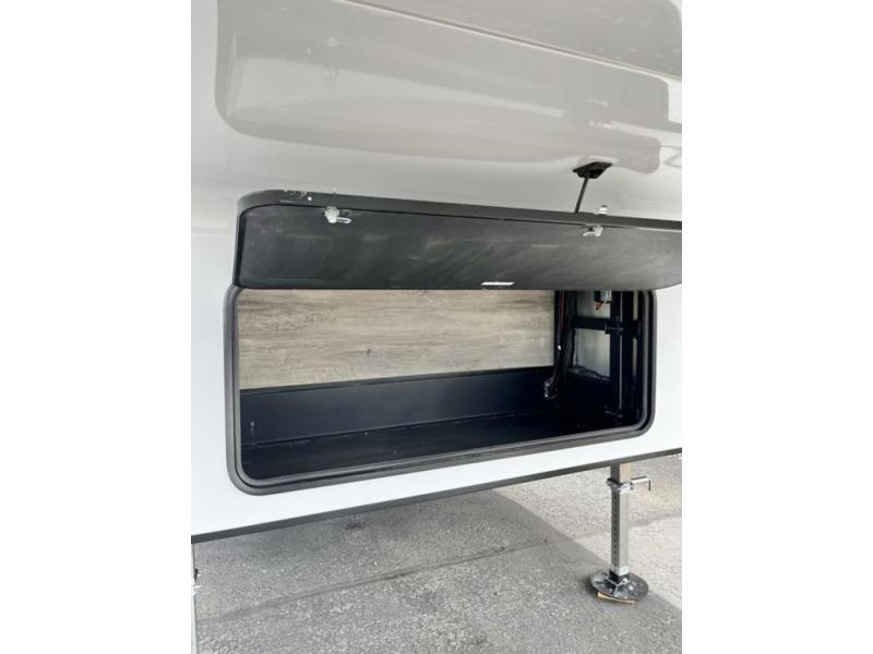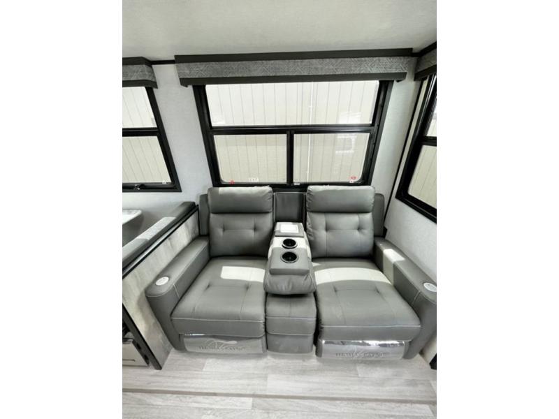 Escape the hustle and bustle of city life for weekends in this cozy fifth wheel. The dual opposing slides in the main living area will create an open floorplan, and you can choose an optional 40" fireplace here for a more at-home feel. There is also an entertainment center and a 43" Smart LED TV for movie night. If the weather is nice, head outdoors to relax under the 14' power awning while the chef of your group cooks on the outside kitchen. The rear kitchen inside features tons of counter space, an 8 cu. ft. gas/electric refrigerator, plus a pantry for dry goods. And don't overlook the front private bedroom with its slide out wardrobe, a closet with washer and dryer prep, and a queen bed!
