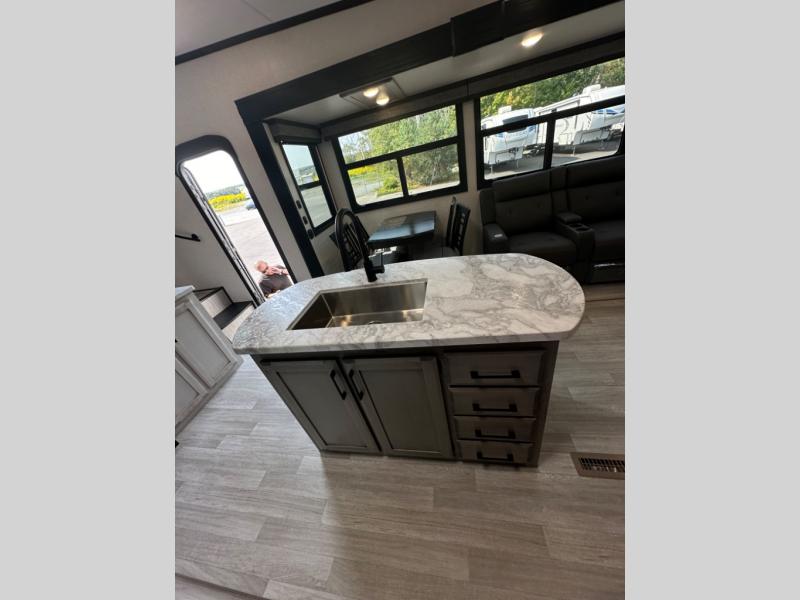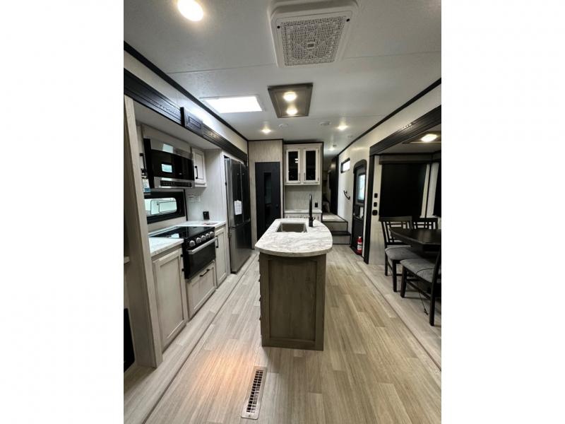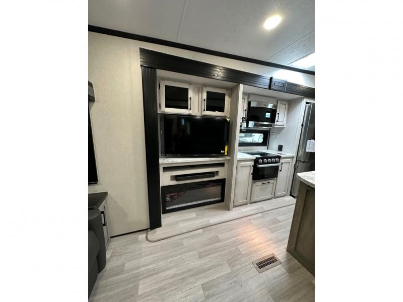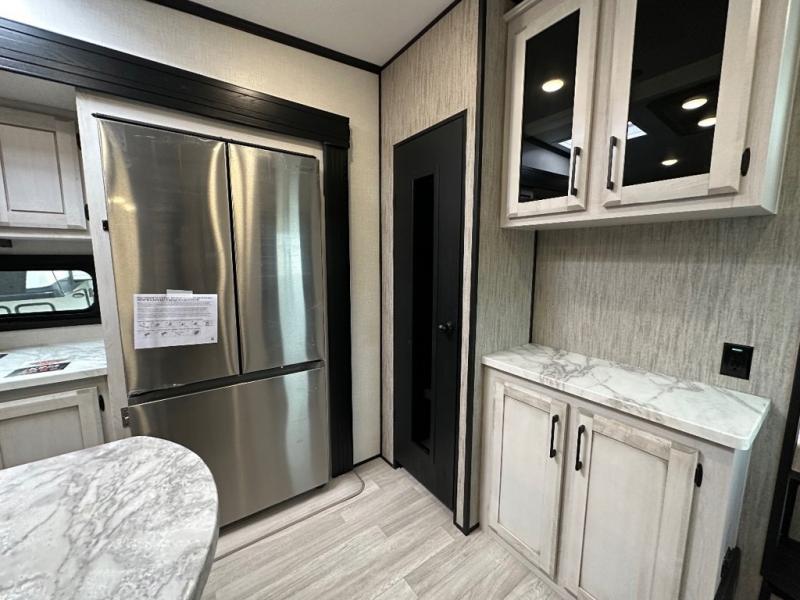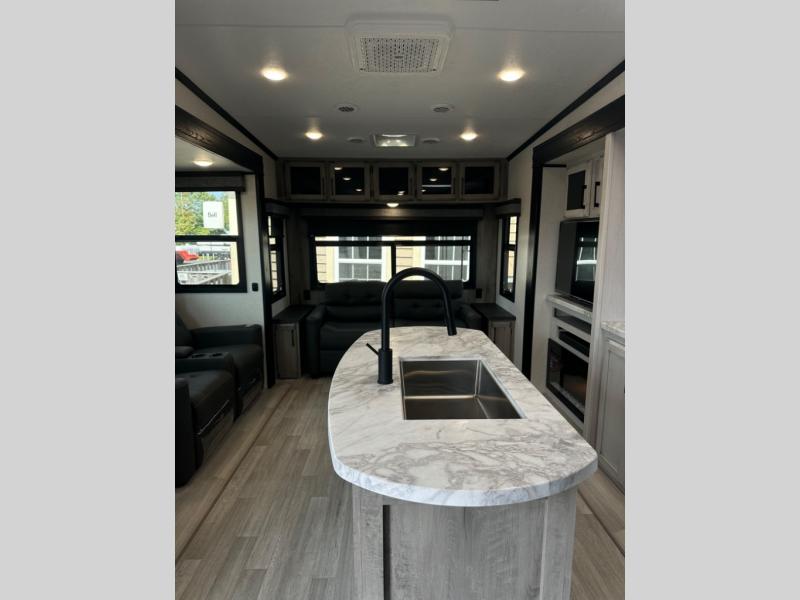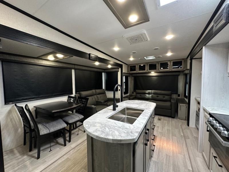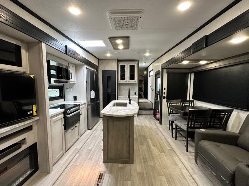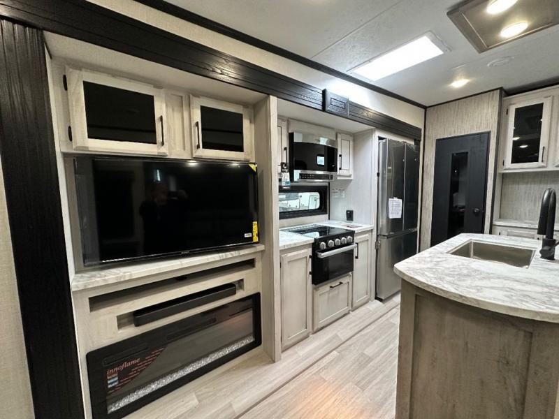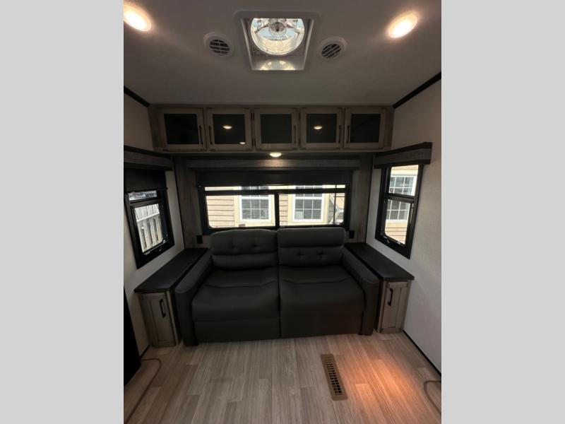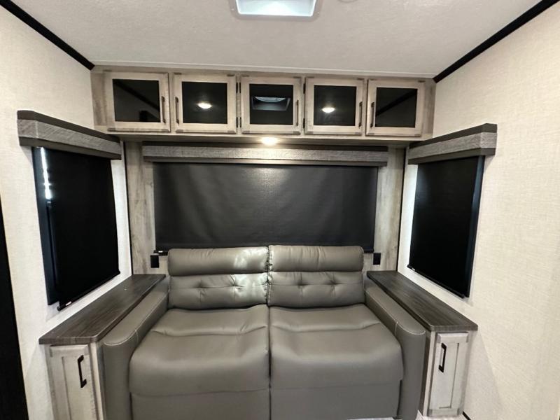 This fifth wheel will feel just like home with its kitchen island, theater seating, and front private bedroom! If you have any overnight guests, they can sleep on the rear hide-a-bed sofa or on the booth dinette. This model also includes an entertainment center with a 43" Smart LED TV and an optional 40" fireplace can be added for more comfort. You will love the extra features that have been added, like the hutch in the kitchen for extra counter and storage space, the shower skylight in the spacious full bath, and the slide out wardrobe in the front bedroom!