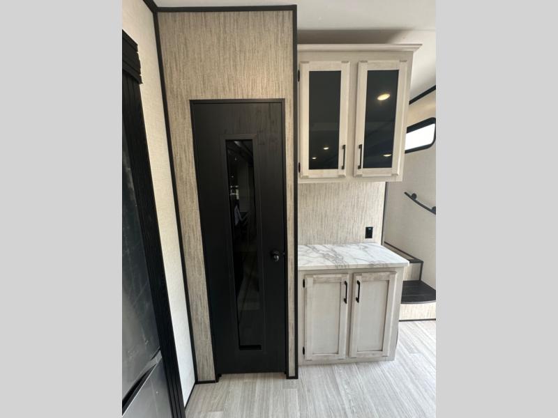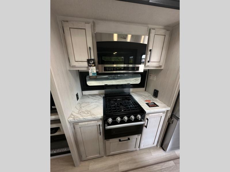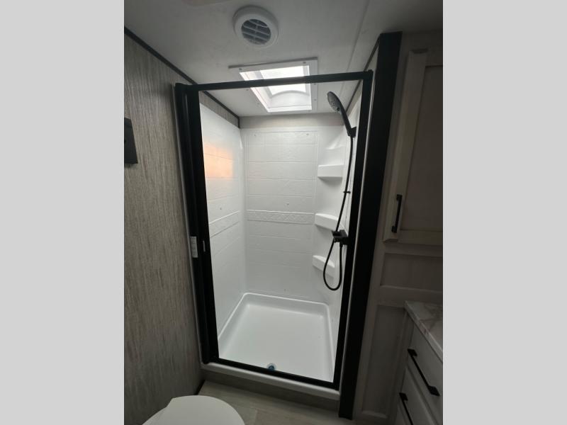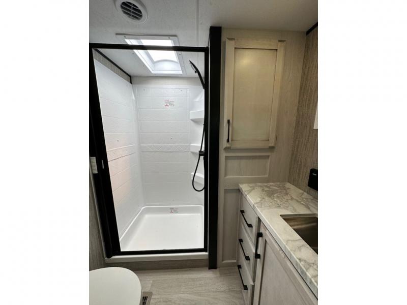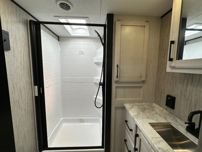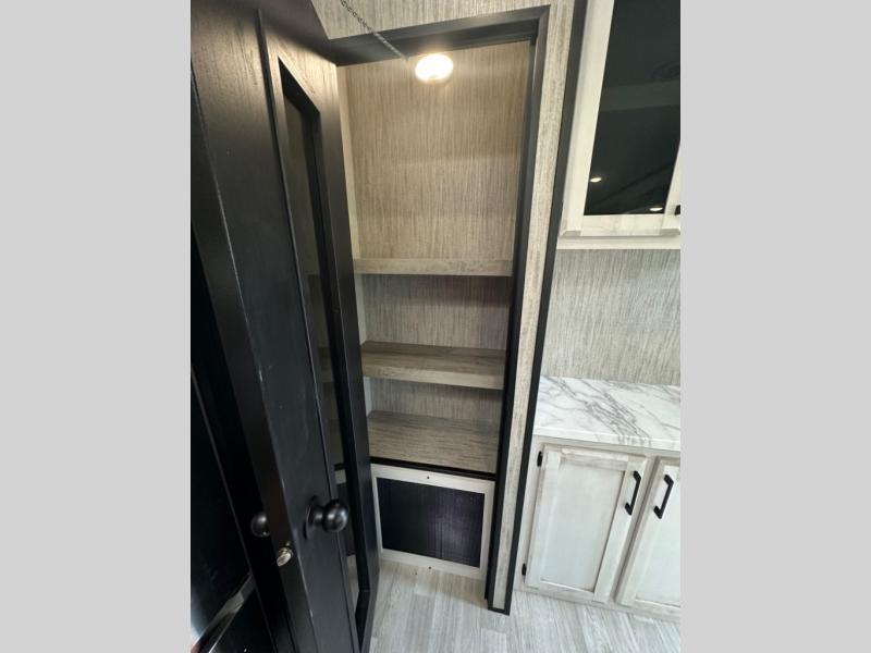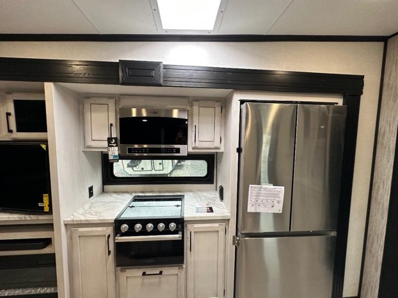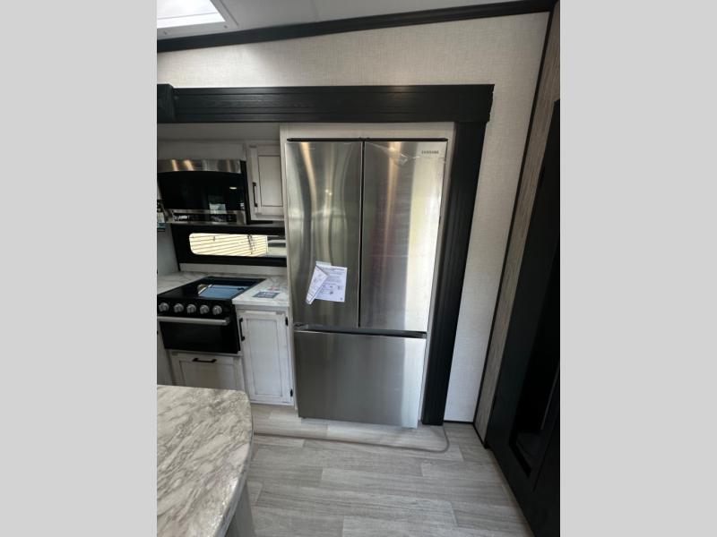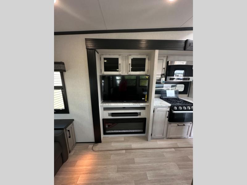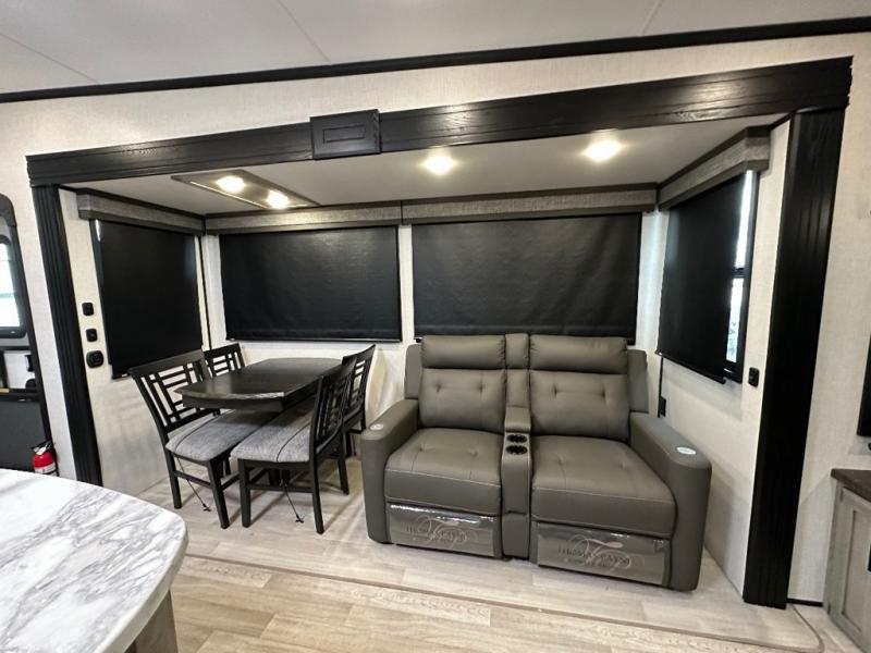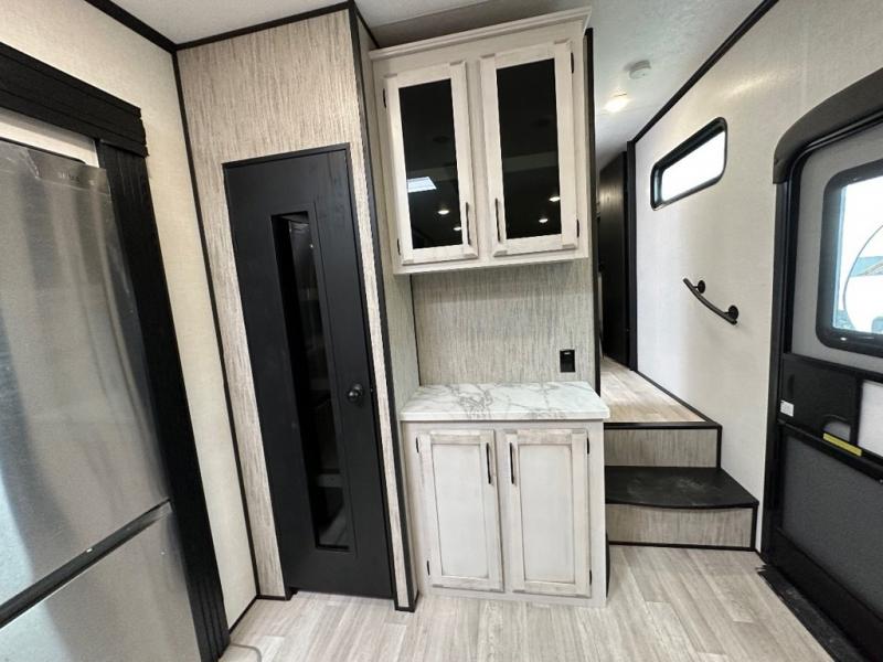 This fifth wheel will feel just like home with its kitchen island, theater seating, and front private bedroom! If you have any overnight guests, they can sleep on the rear hide-a-bed sofa or on the booth dinette. This model also includes an entertainment center with a 43" Smart LED TV and an optional 40" fireplace can be added for more comfort. You will love the extra features that have been added, like the hutch in the kitchen for extra counter and storage space, the shower skylight in the spacious full bath, and the slide out wardrobe in the front bedroom!