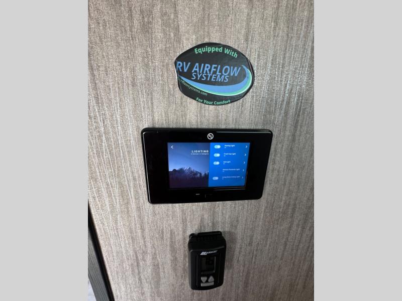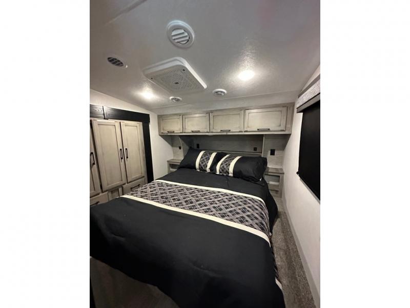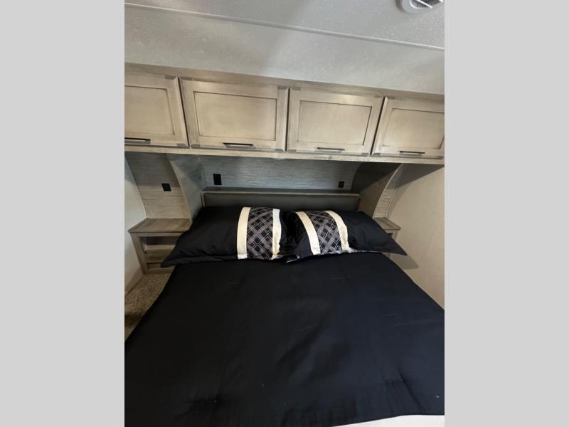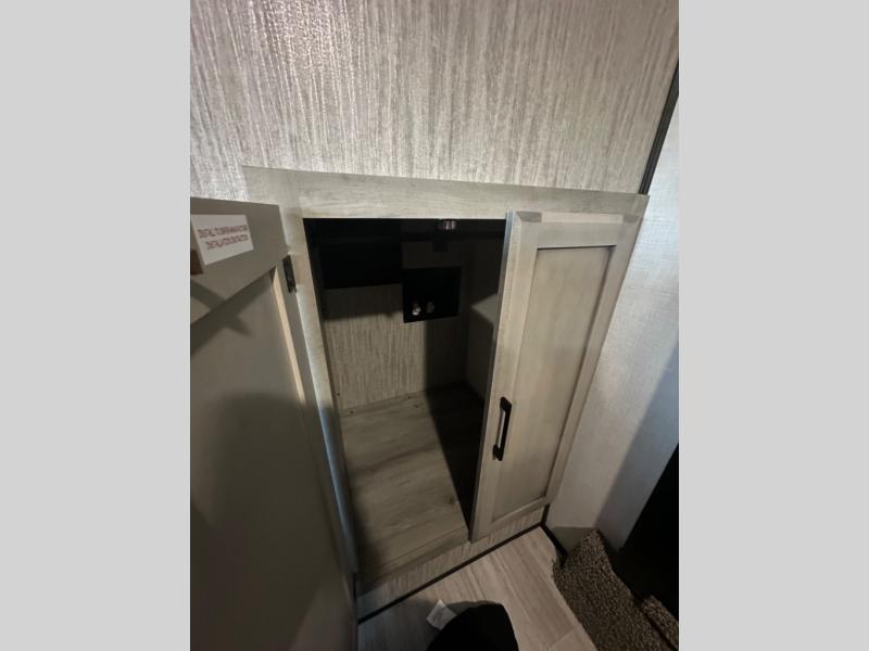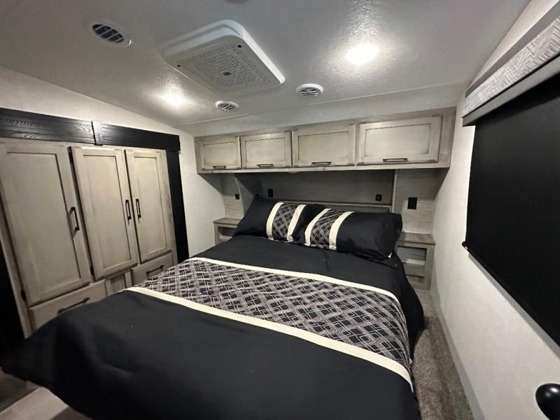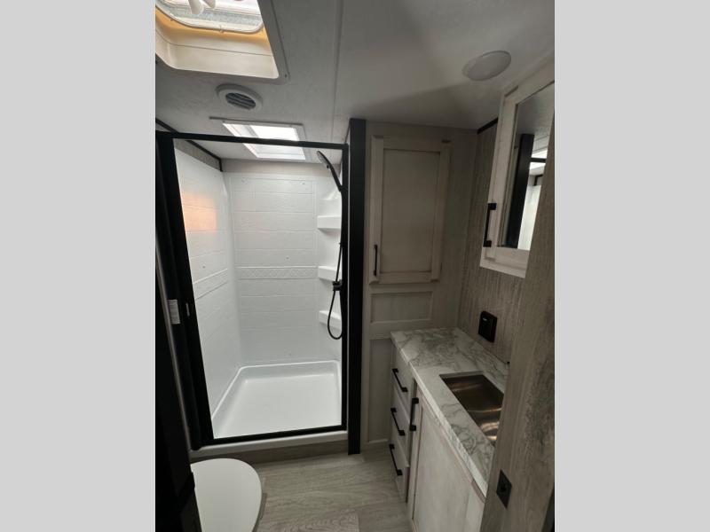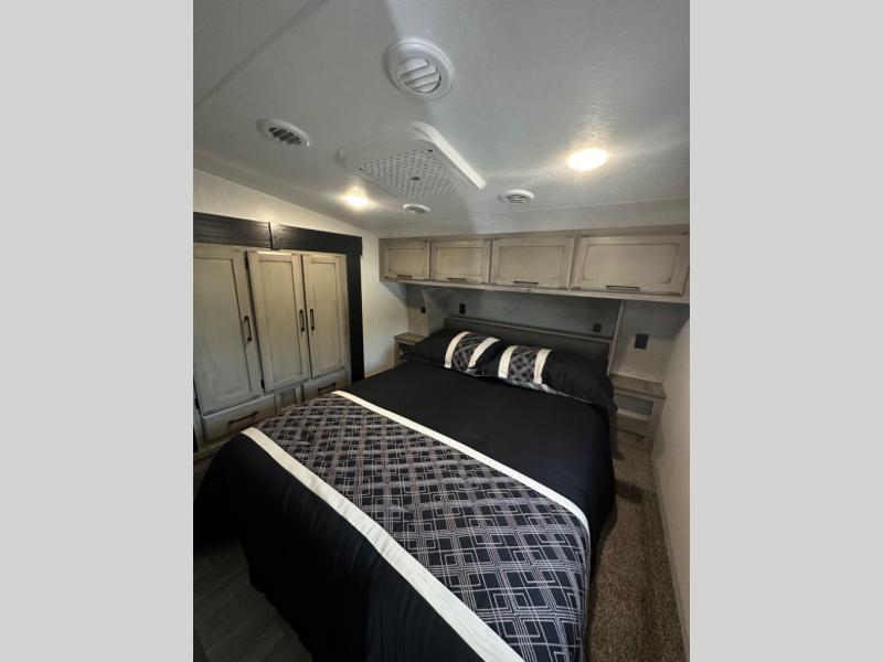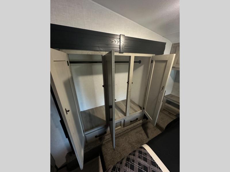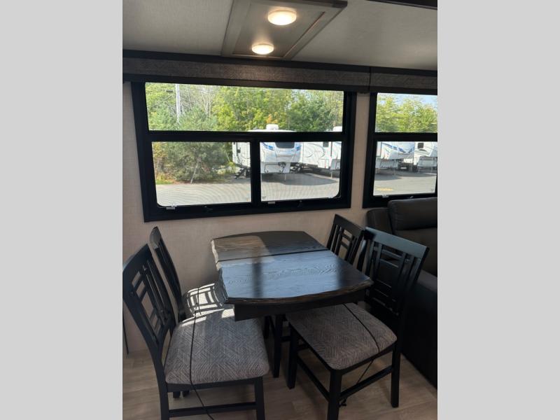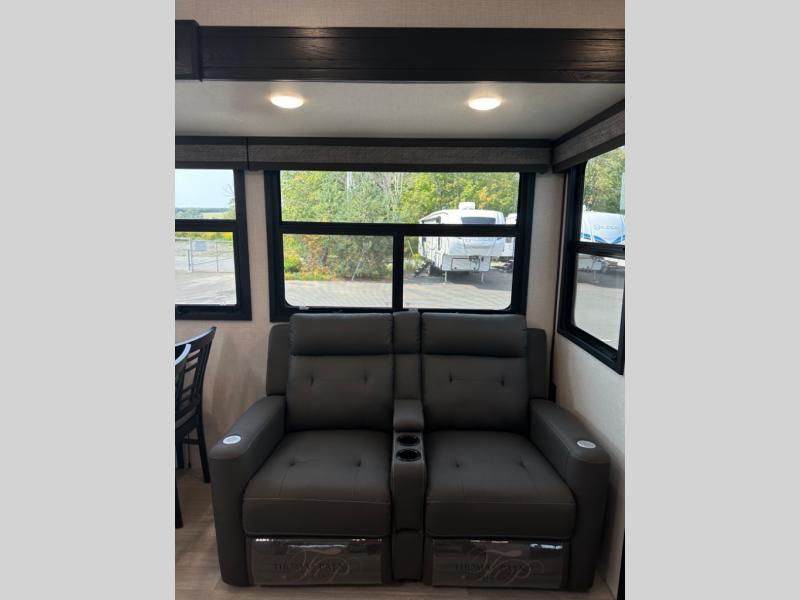 This fifth wheel will feel just like home with its kitchen island, theater seating, and front private bedroom! If you have any overnight guests, they can sleep on the rear hide-a-bed sofa or on the booth dinette. This model also includes an entertainment center with a 43" Smart LED TV and an optional 40" fireplace can be added for more comfort. You will love the extra features that have been added, like the hutch in the kitchen for extra counter and storage space, the shower skylight in the spacious full bath, and the slide out wardrobe in the front bedroom!