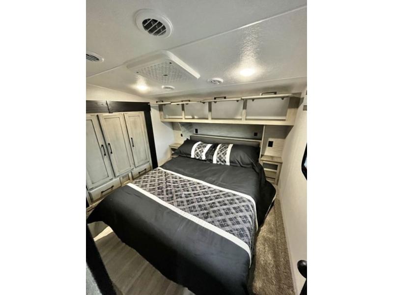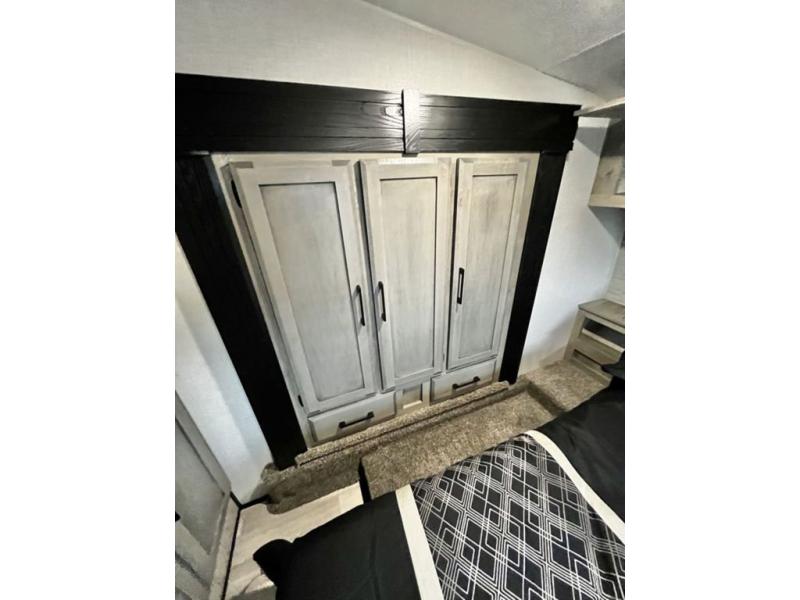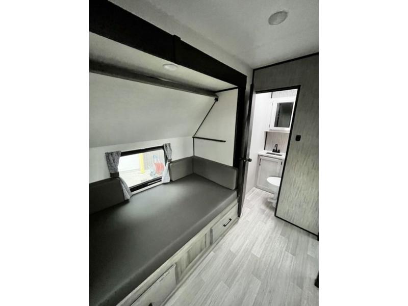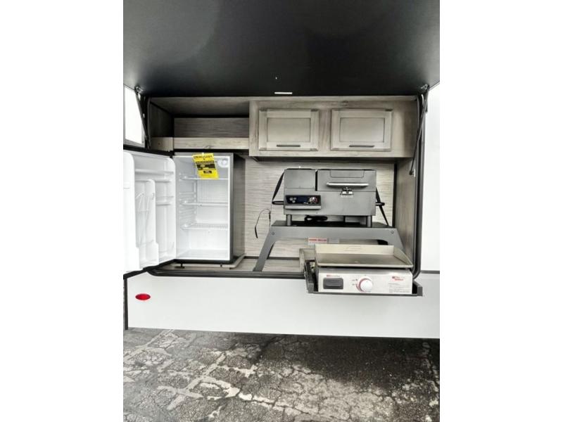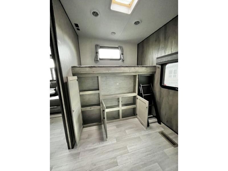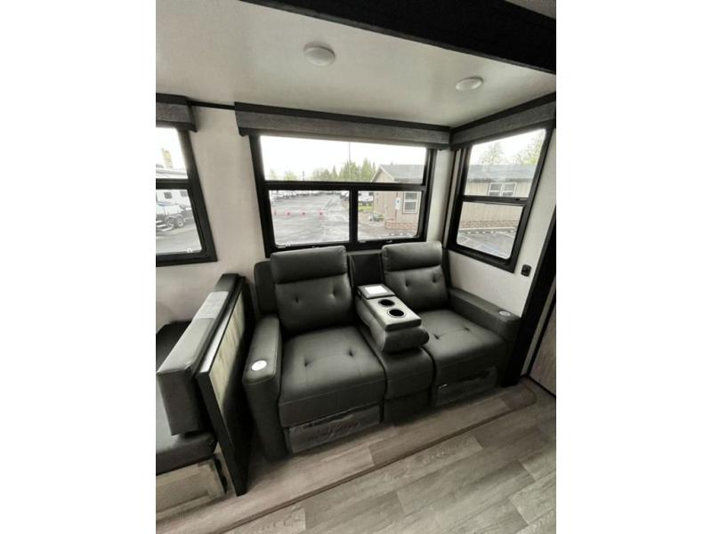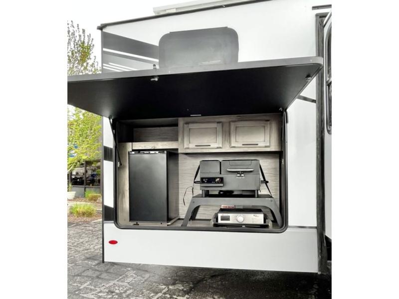 Your guests will feel right at home when they go camping with you since they will have their own bunkhouse suite with a half bath! There are three bunks here, plus an entertainment center if they choose to add a TV. The spacious full bath is up by the front private bedroom, and here you'll enjoy a queen bed, a slide out wardrobe, plus a closet with washer and dryer prep. Everyone can meet in the main living area at the booth dinette, or on the theater seating, plus this area includes a 43" Smart LED TV and an optional 40" fireplace can be added. Head outdoors to cook on the outside kitchen that includes a griddle, a sink, plus a refrigerator. There is also a 13' power awning here, and a second optional 11" awning can be added for even more shade!