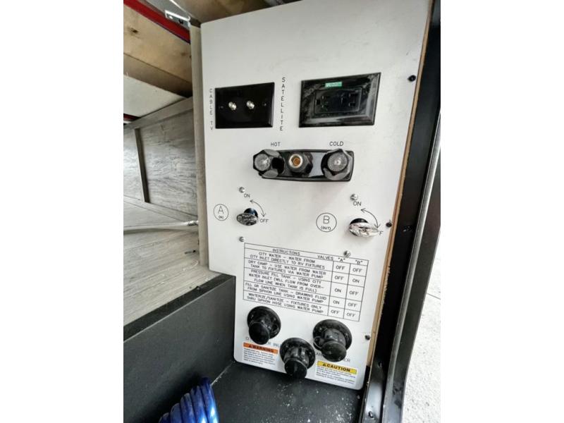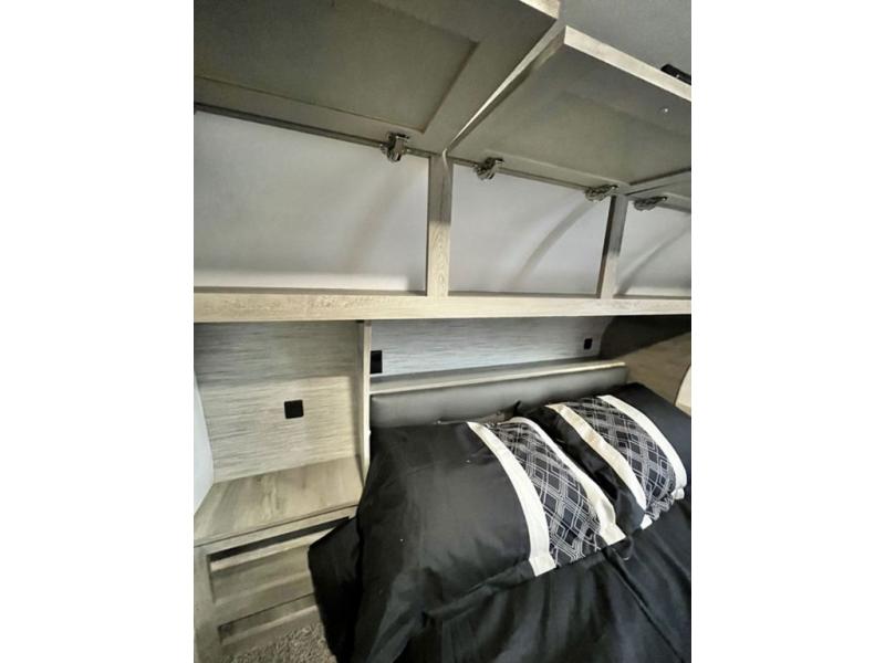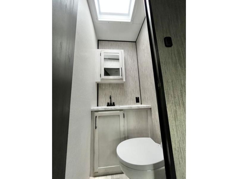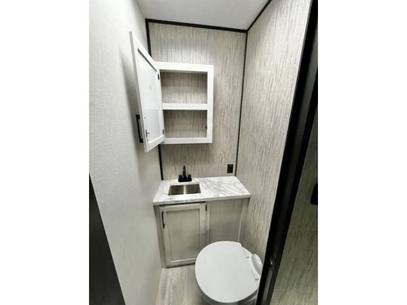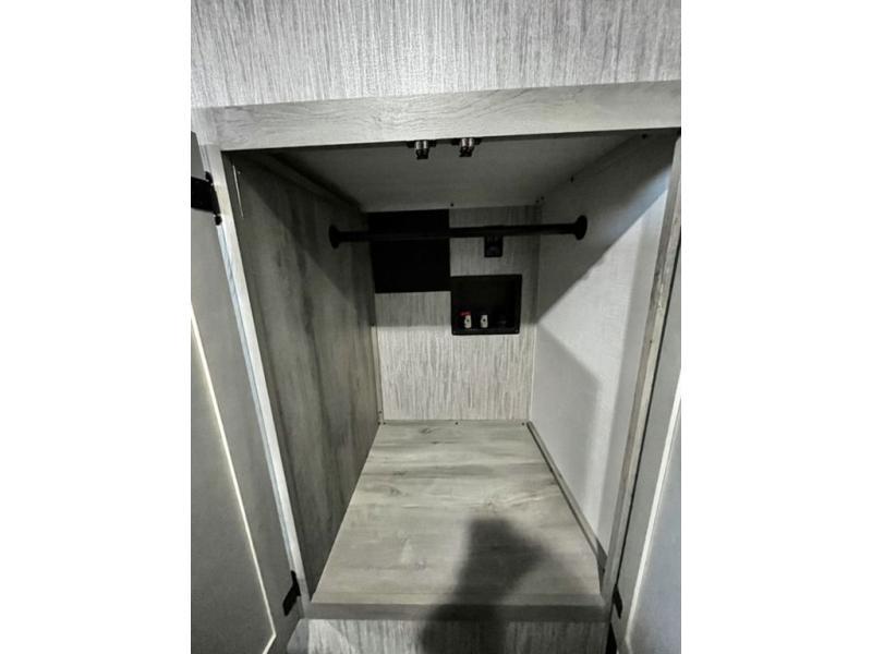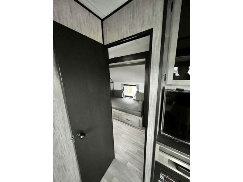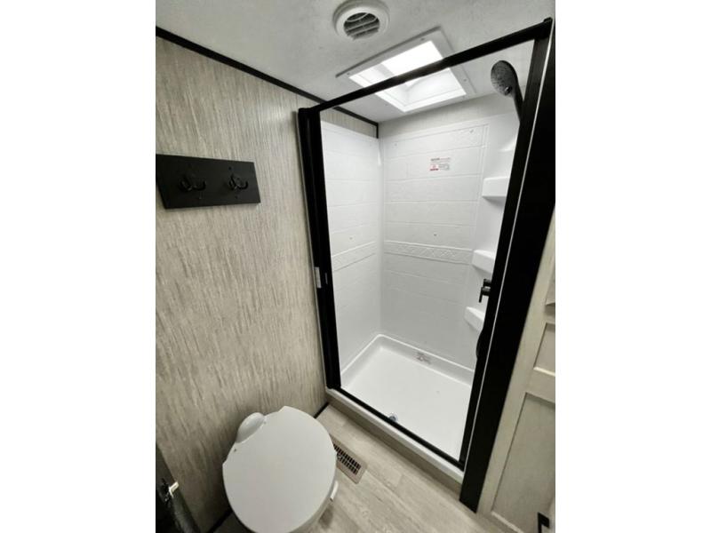 Your guests will feel right at home when they go camping with you since they will have their own bunkhouse suite with a half bath! There are three bunks here, plus an entertainment center if they choose to add a TV. The spacious full bath is up by the front private bedroom, and here you'll enjoy a queen bed, a slide out wardrobe, plus a closet with washer and dryer prep. Everyone can meet in the main living area at the booth dinette, or on the theater seating, plus this area includes a 43" Smart LED TV and an optional 40" fireplace can be added. Head outdoors to cook on the outside kitchen that includes a griddle, a sink, plus a refrigerator. There is also a 13' power awning here, and a second optional 11" awning can be added for even more shade!