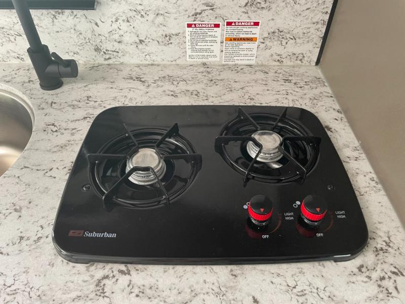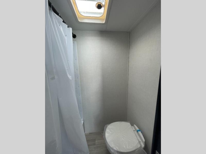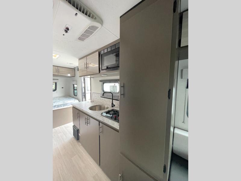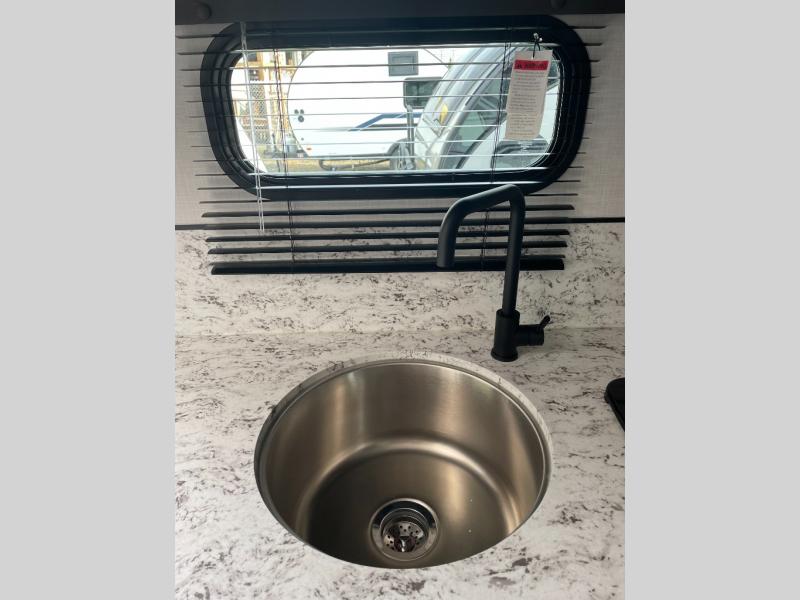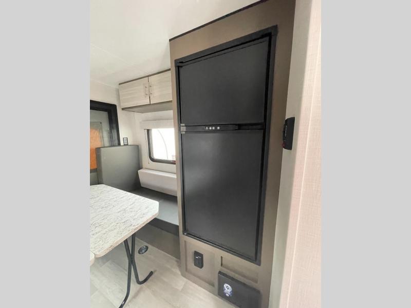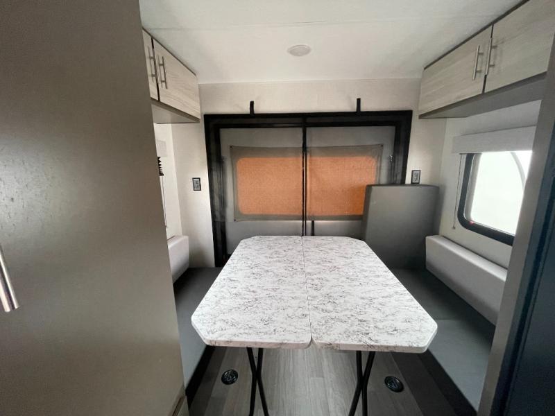 With a hatch door, you can bring the outdoors to the inside of this travel trailer! This model was awarded "Best New Model" of 2021 by RV Pro. The front 54" x 80" bed offers a comfortable place to lay your head at night with a wardrobe next to it to keep your clothes looking their best. Start your mornings feeling clean and fresh by showering in the private bathroom then head to the kitchen and fry up some bacon on the two burner cooktop. The kitchen also has seamless countertops which will be easy to clean, a stainless steel round sink for clean up, a pantry for snacks, and a 8 cu. ft. 12V refrigerator for your perishables. The opposing single booth with dinettes in between provide a comfortable dining area, as well as sleeping area once converted.