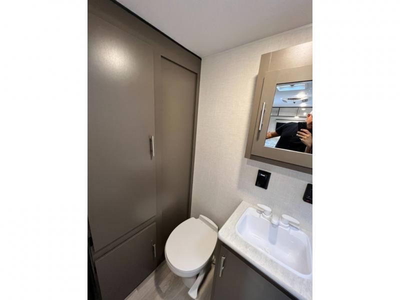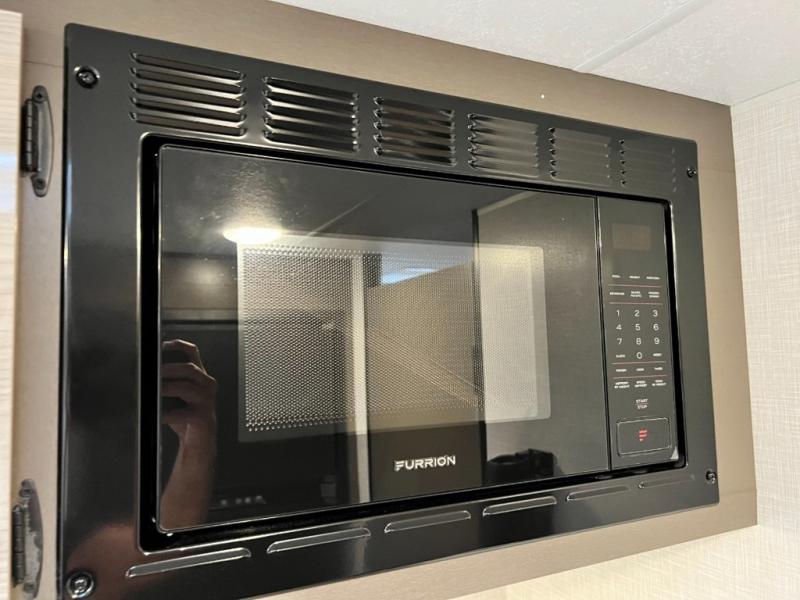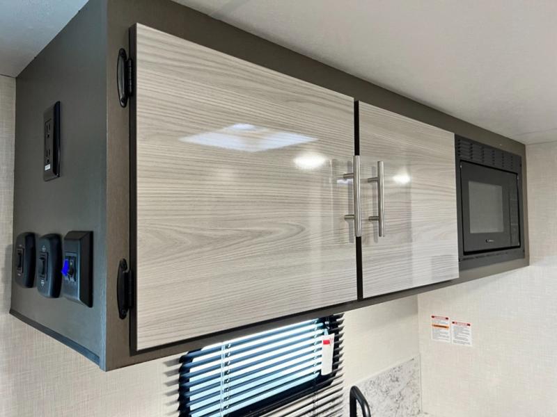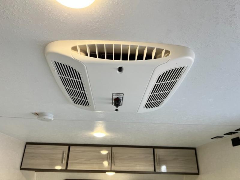 Two people will have the time of their life camping in this travel trailer! Wake up feeling refreshed every morning after sleeping on the front queen bed with nightstands on either side to set your glass of water. The full rear bathroom has a shower for you to clean up in after a fun day at the beach and a wardrobe to store your clothes and towels. The kitchen has a two burner cooktop to fry bacon, seamless countertops for easy cleaning, a stainless steel round sink for washing, and a 8 cu. ft. 12V refrigerator to keep your perishables fresh. You can enjoy your meals at the booth dinette slide, as well as transform into an extra sleeping space.