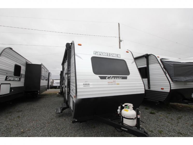 With any Sportsmen Classis travel trailer, expandable, or toy hauler by KZ you will find durable construction materials, like the 3/8" full-walkable roof and the one-piece seamless Tufflex material. Each model includes scissor-style stabilizer jacks, a Key-Alike program for baggage and entry doors, and a Leash Latch with a bonus beverage opener. You will find interior and exterior speakers plus backup camera prep and solar prep. The Sportsmen Classic is designed to make you feel at home with LED interior lights, rail-style cabinet doors, residential grade linoleum, and plenty of storage space for all your belongings.
