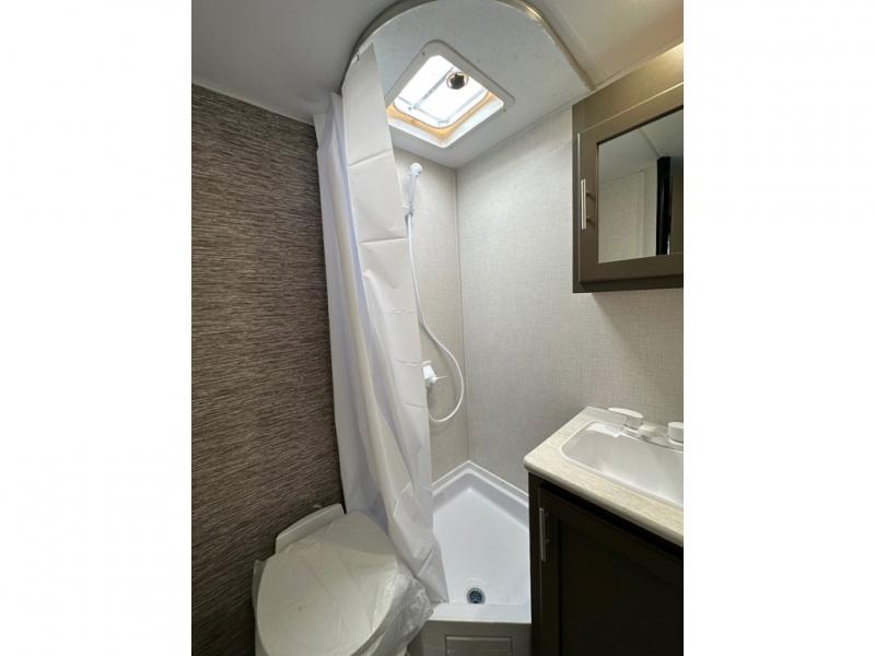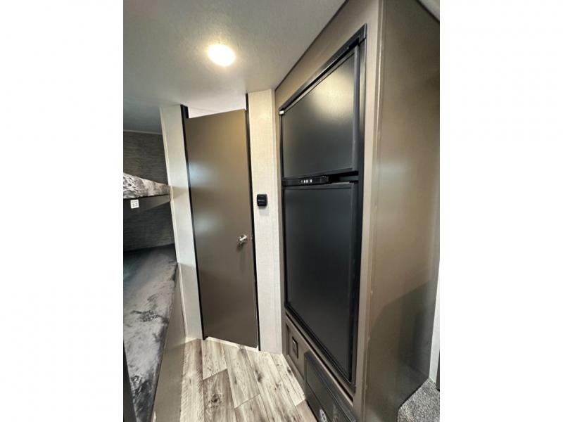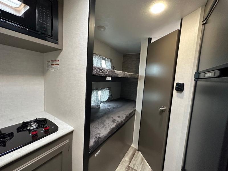You're going to love camping in this spacious travel trailer that can sleep five people each night. When you arrive at your destination, set up the 14' power awning and start lunch on the outside kitchen. The little ones will love the bunk beds, and you will have the front RV queen bed all to yourselves. This model also includes a full bath that will allow you to stay clean!