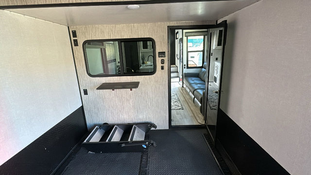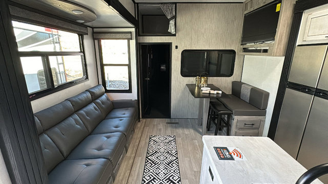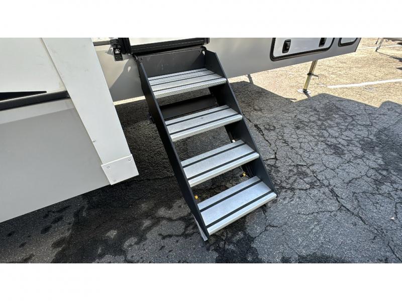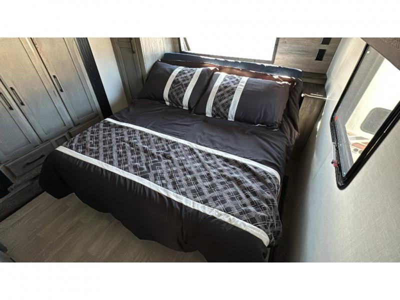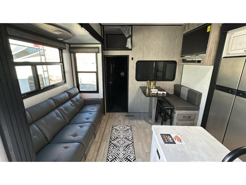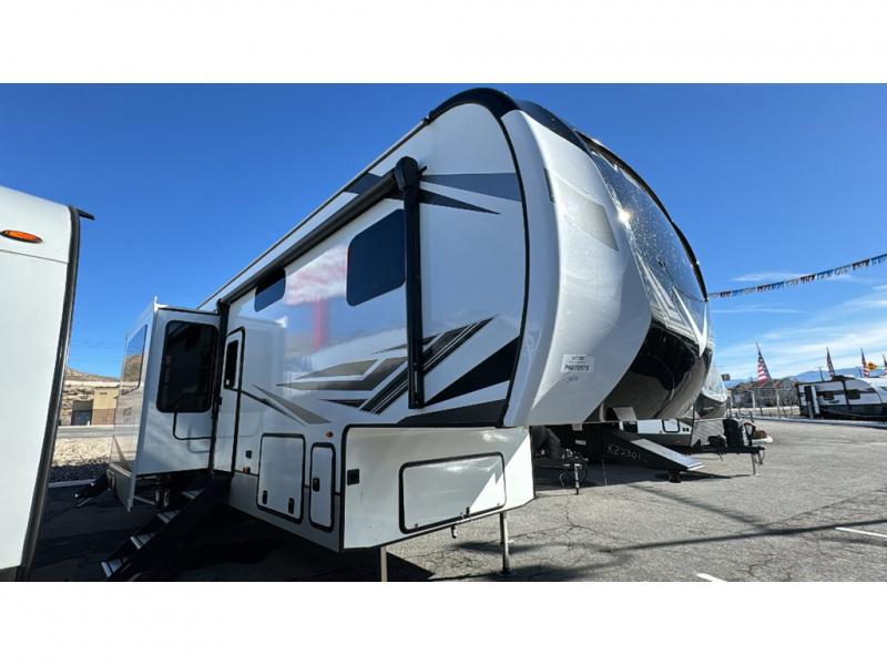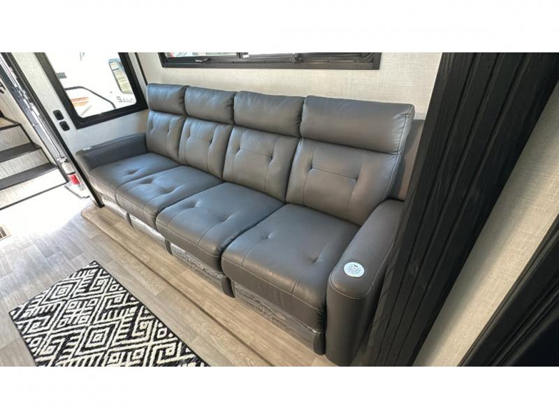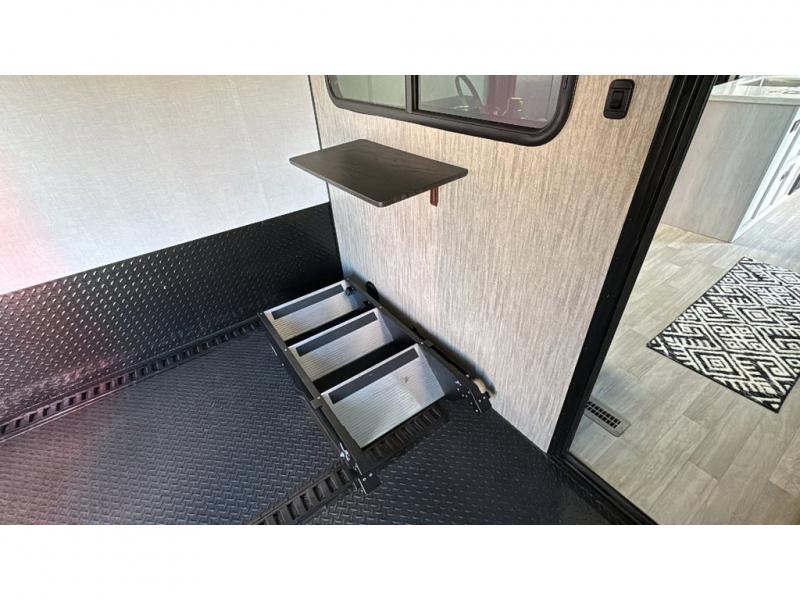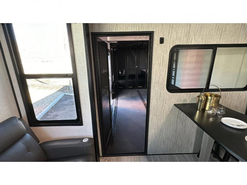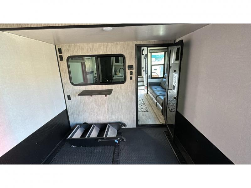 Spacious, luxurious and convenient are a few words you will be thinking each trip you take with this fifth wheel in tow! From the 15'9" separate garage to load up every toy you want, and the dual slides in the main living and kitchen area to the front master bedroom with a slide out wardrobe, there is lots of floor space. The garage also offers storage, access to the loft bed, plus the option to add a power bed with Sit and Sleep making this space a great area to relax after the rides. The 30 gallon fuel tank will keep the toys running, and the side man door is handy when you have the ramp cargo door closed. In the main living and kitchen area you can relax on the four-person super sofa with footrests, dine at the table with booth and chair seating, and watch the 43" Smart LED TV. The cook will love the counter peninsula to prepare and serve meals, and all the kitchen appliances in the slide out. Everyone can take turns getting cleaned up in the full bathroom, and you can retire to the master bedroom with a walk-around electric-tilt king bed or choose the queen option, and there is plenty of storage for your clothing plus a closet prepped for a washer/dryer option. You will find even more storage in the pass-through compartment along the exterior.