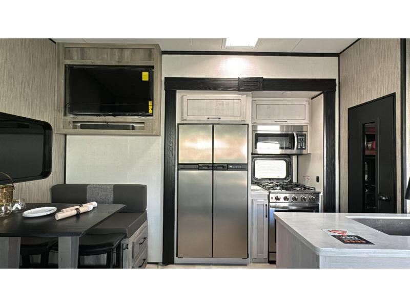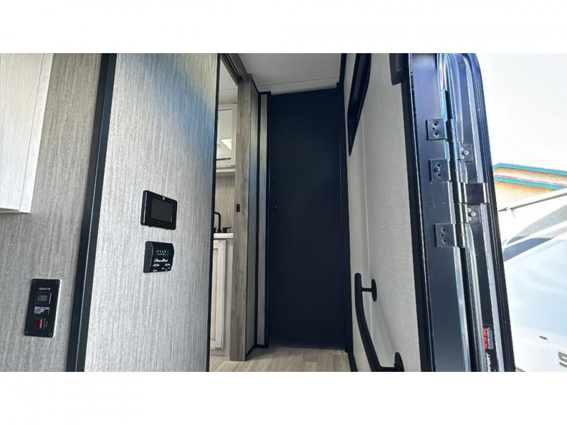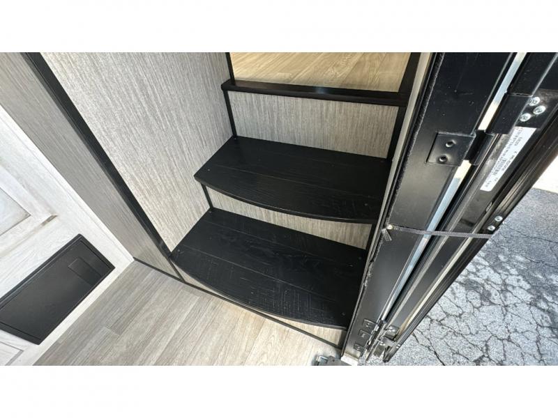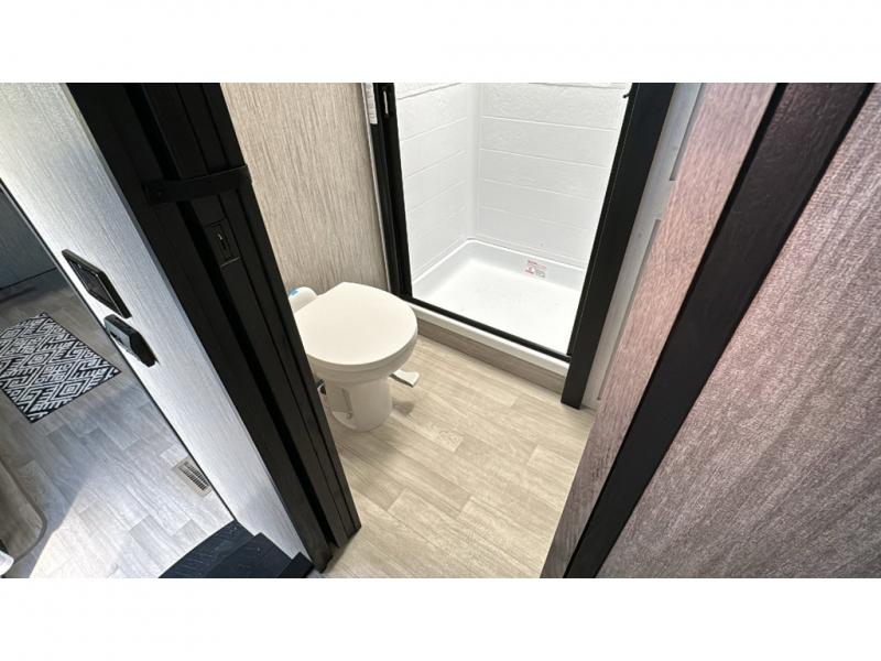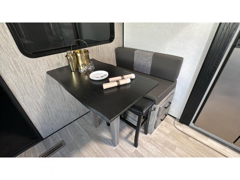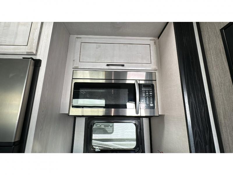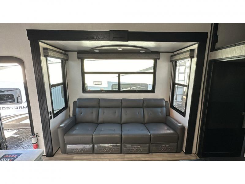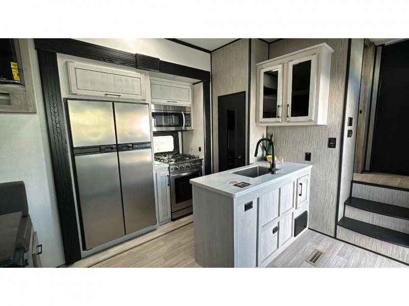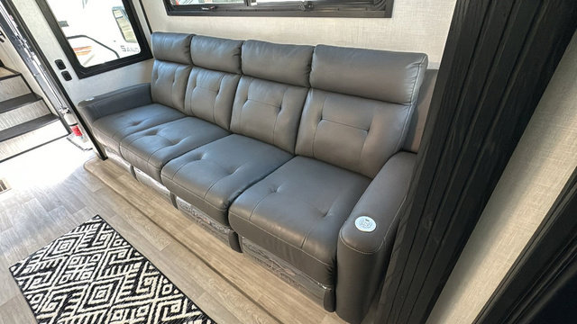 Spacious, luxurious and convenient are a few words you will be thinking each trip you take with this fifth wheel in tow! From the 15'9" separate garage to load up every toy you want, and the dual slides in the main living and kitchen area to the front master bedroom with a slide out wardrobe, there is lots of floor space. The garage also offers storage, access to the loft bed, plus the option to add a power bed with Sit and Sleep making this space a great area to relax after the rides. The 30 gallon fuel tank will keep the toys running, and the side man door is handy when you have the ramp cargo door closed. In the main living and kitchen area you can relax on the four-person super sofa with footrests, dine at the table with booth and chair seating, and watch the 43" Smart LED TV. The cook will love the counter peninsula to prepare and serve meals, and all the kitchen appliances in the slide out. Everyone can take turns getting cleaned up in the full bathroom, and you can retire to the master bedroom with a walk-around electric-tilt king bed or choose the queen option, and there is plenty of storage for your clothing plus a closet prepped for a washer/dryer option. You will find even more storage in the pass-through compartment along the exterior.