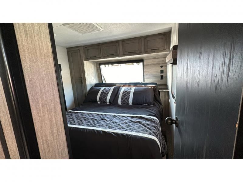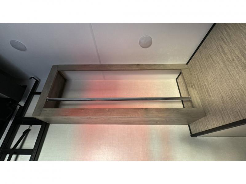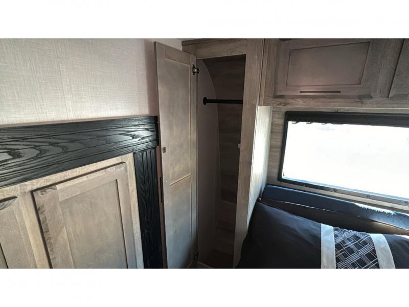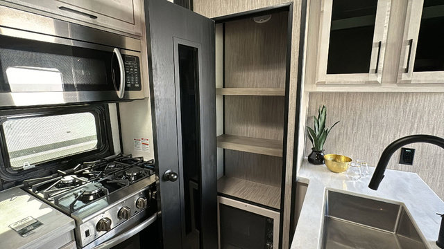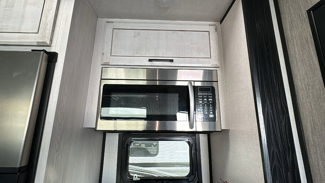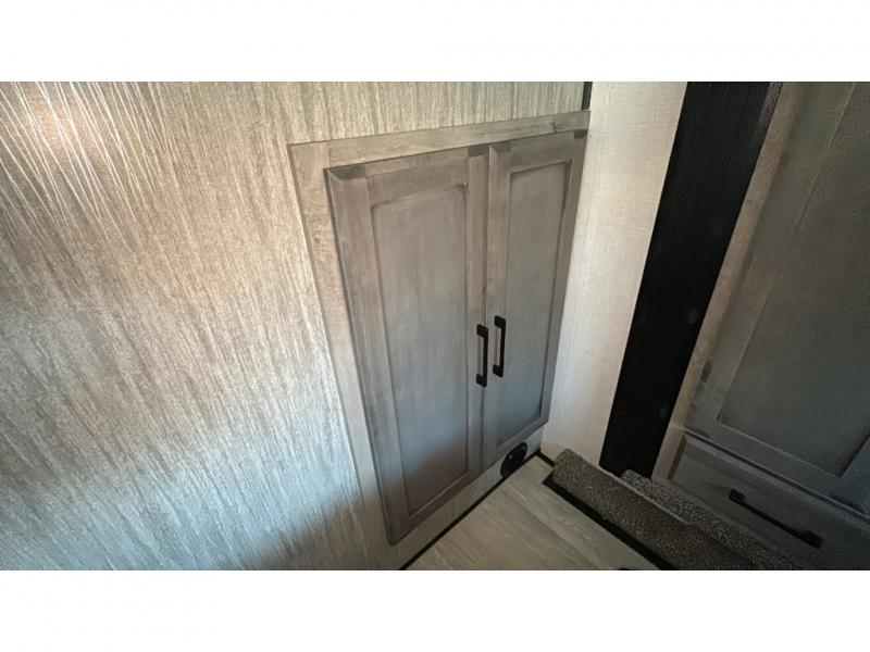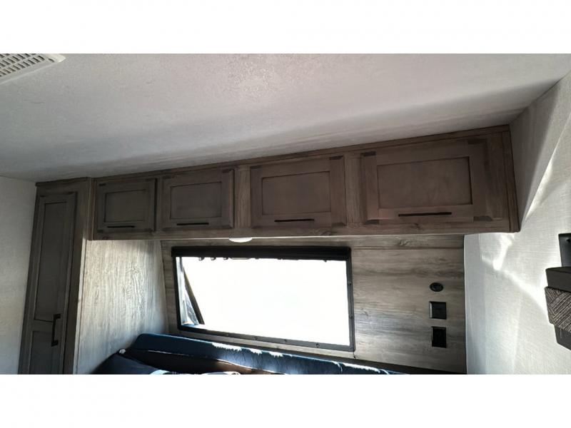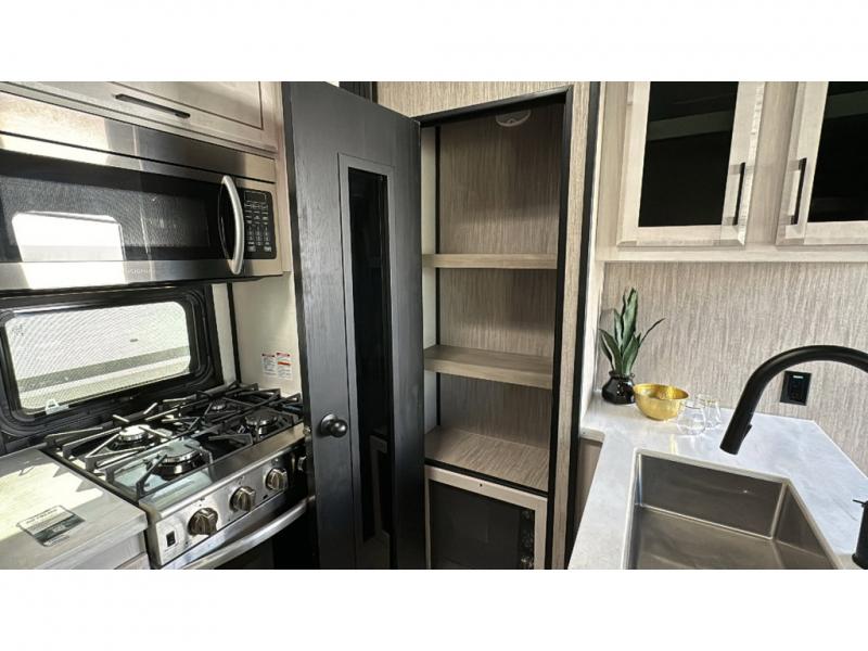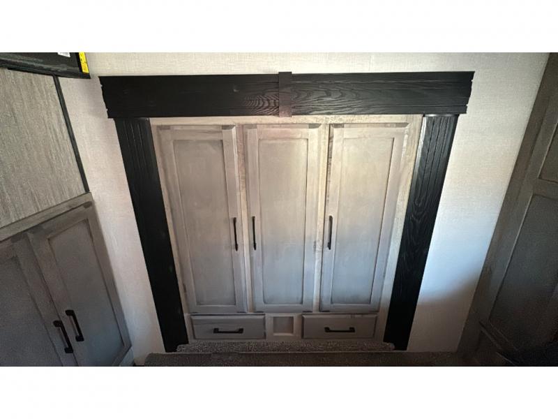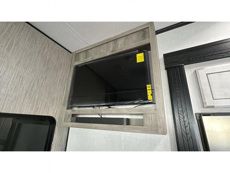 Spacious, luxurious and convenient are a few words you will be thinking each trip you take with this fifth wheel in tow! From the 15'9" separate garage to load up every toy you want, and the dual slides in the main living and kitchen area to the front master bedroom with a slide out wardrobe, there is lots of floor space. The garage also offers storage, access to the loft bed, plus the option to add a power bed with Sit and Sleep making this space a great area to relax after the rides. The 30 gallon fuel tank will keep the toys running, and the side man door is handy when you have the ramp cargo door closed. In the main living and kitchen area you can relax on the four-person super sofa with footrests, dine at the table with booth and chair seating, and watch the 43" Smart LED TV. The cook will love the counter peninsula to prepare and serve meals, and all the kitchen appliances in the slide out. Everyone can take turns getting cleaned up in the full bathroom, and you can retire to the master bedroom with a walk-around electric-tilt king bed or choose the queen option, and there is plenty of storage for your clothing plus a closet prepped for a washer/dryer option. You will find even more storage in the pass-through compartment along the exterior.