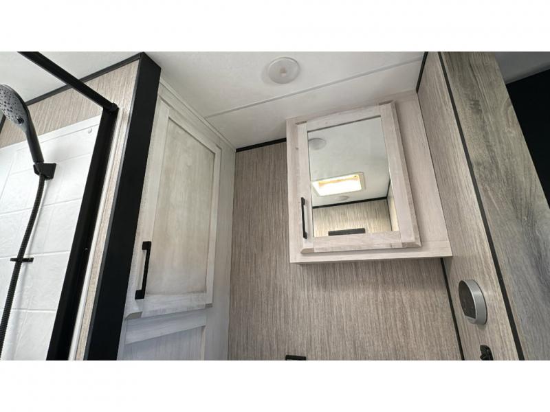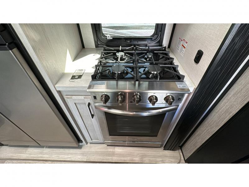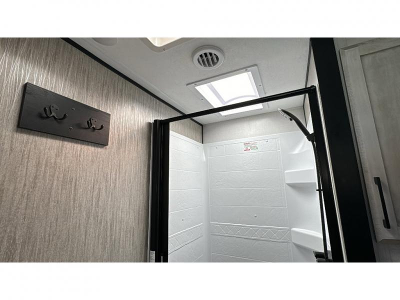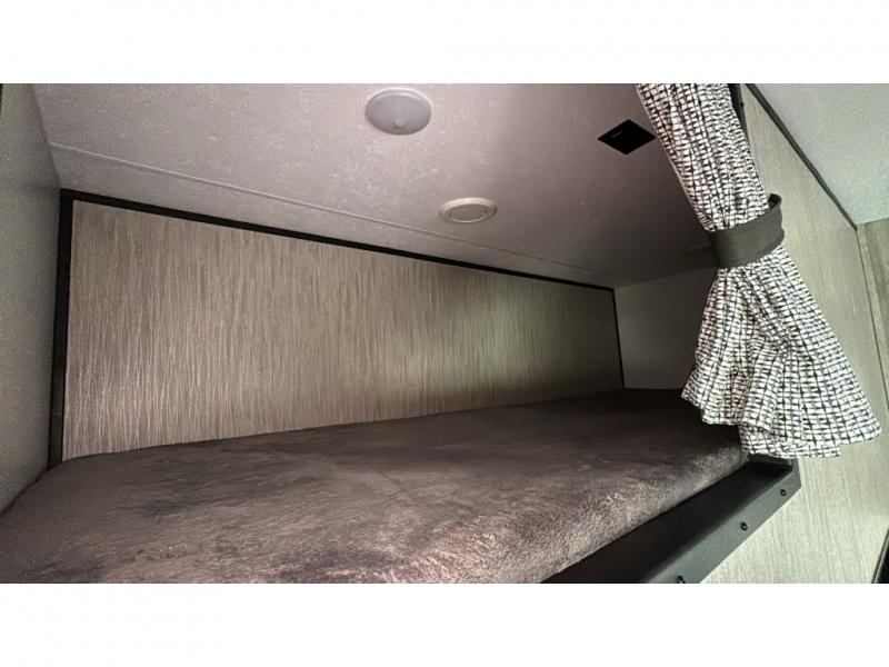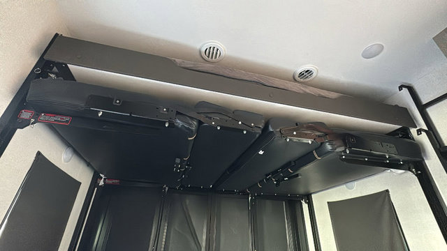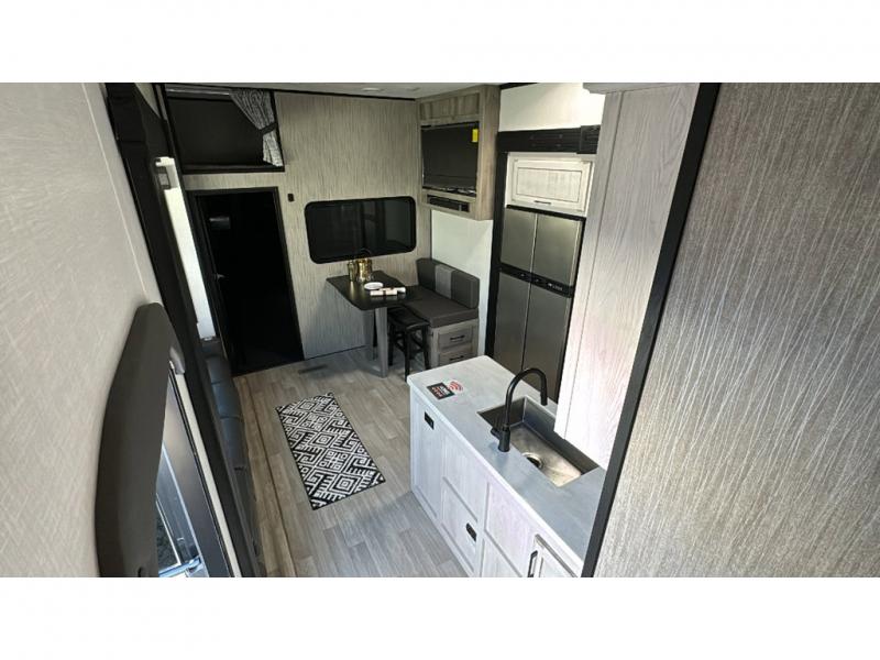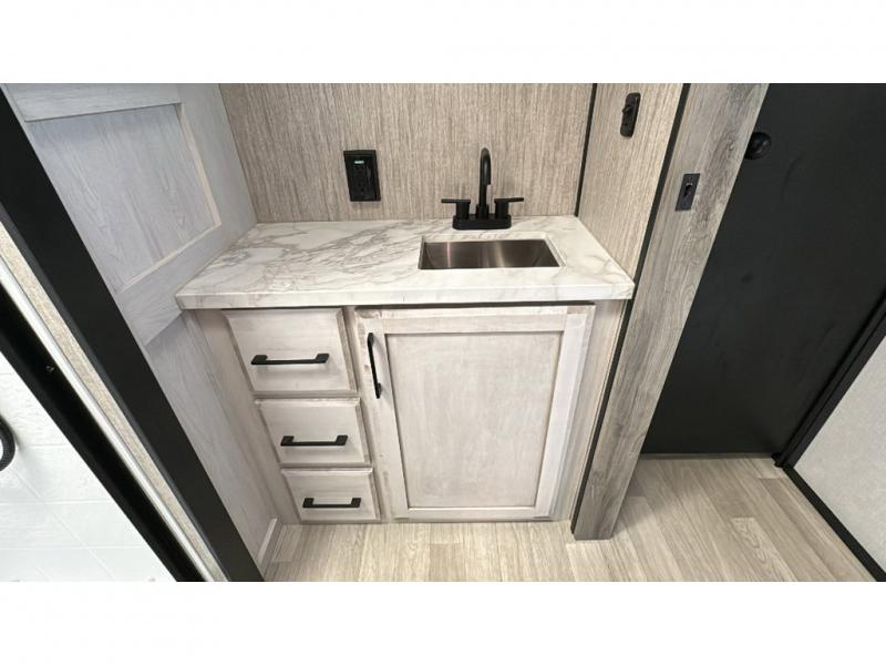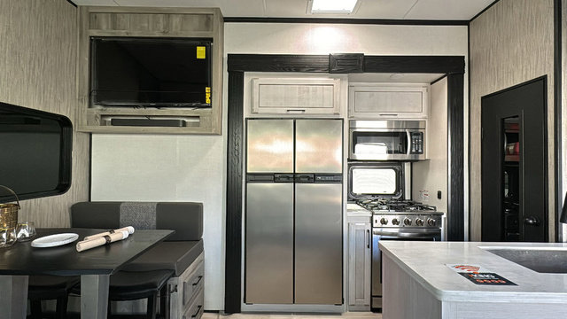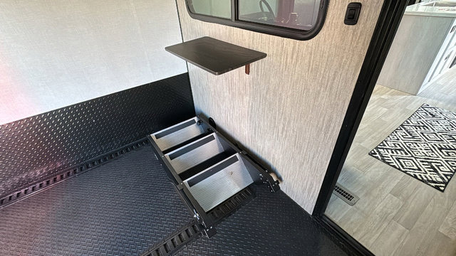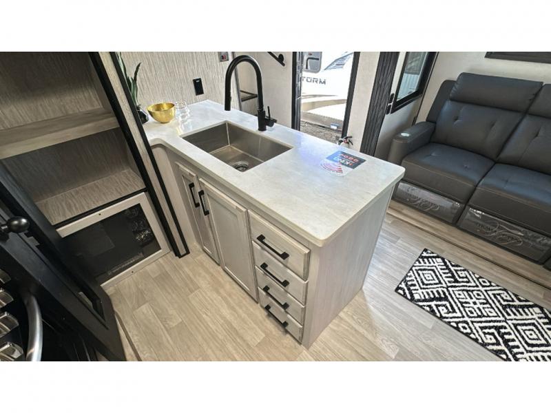 With any KZ Venom V-Series toy hauler fifth wheel, you will have 6-sided aluminum framing, a partial painted fiberglass front cap, and generator prep with a 30 gallon fuel tank and pump station to keep the fun going. More standout features include the six-point electric auto leveling, the Equa-Flex suspension, and Tufflex roofing material for a flexible, puncture resistance and reflective roof. The fully vented attic system provides two attic vents for escape routes for unwanted moisture, and the All-Weather Insulation package allows you to travel during any season. The interior provides deluxe residential-style furniture, decorative lighting above many cabinets, heavy-duty 100 lb. drawer glides on every drawer, and a On-Demand tankless water heater with digital user control panel. Make your selection today, and start having fun with your toys and enjoying the luxurious and comfortable features in any Venom V-Series!